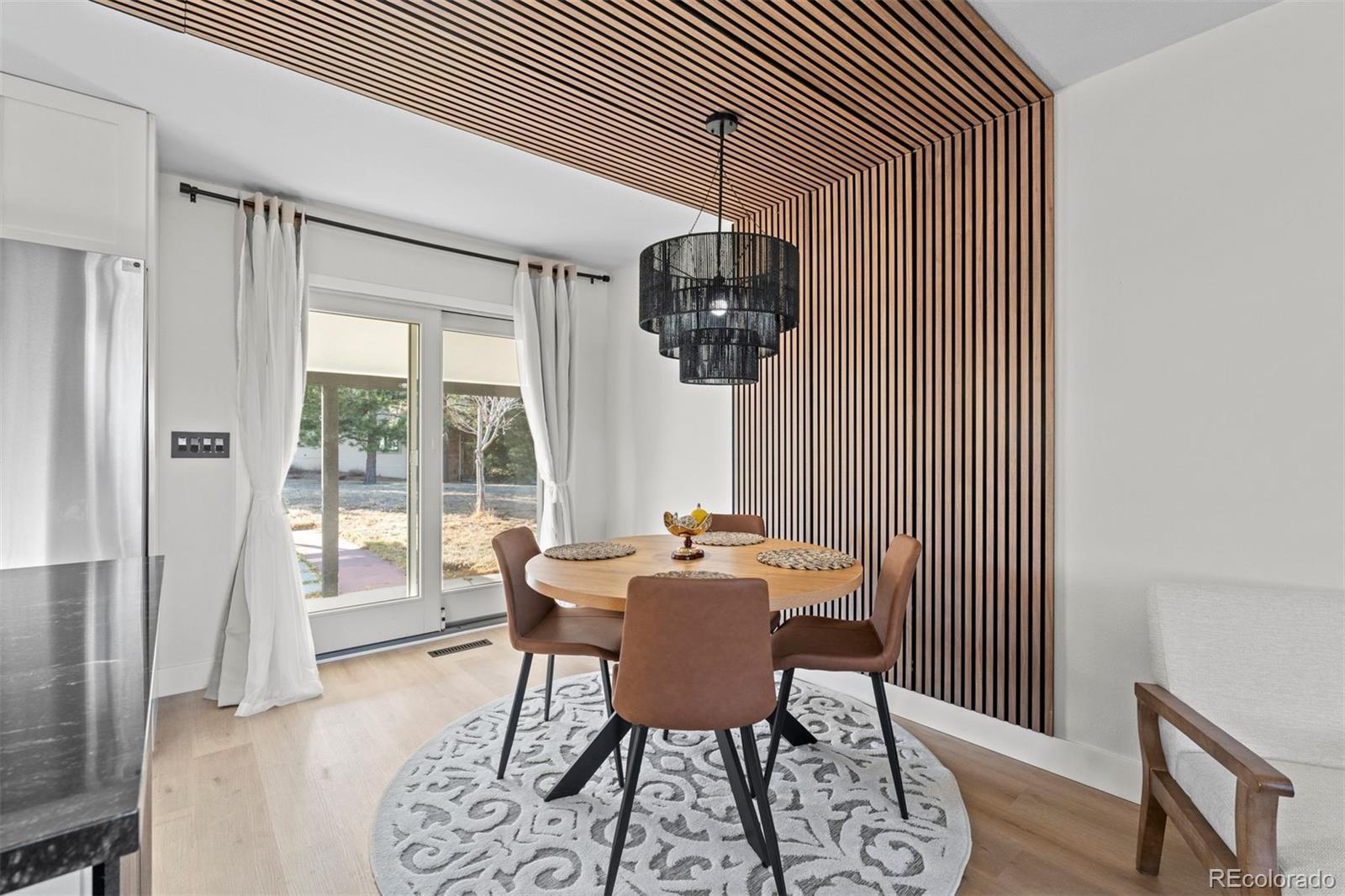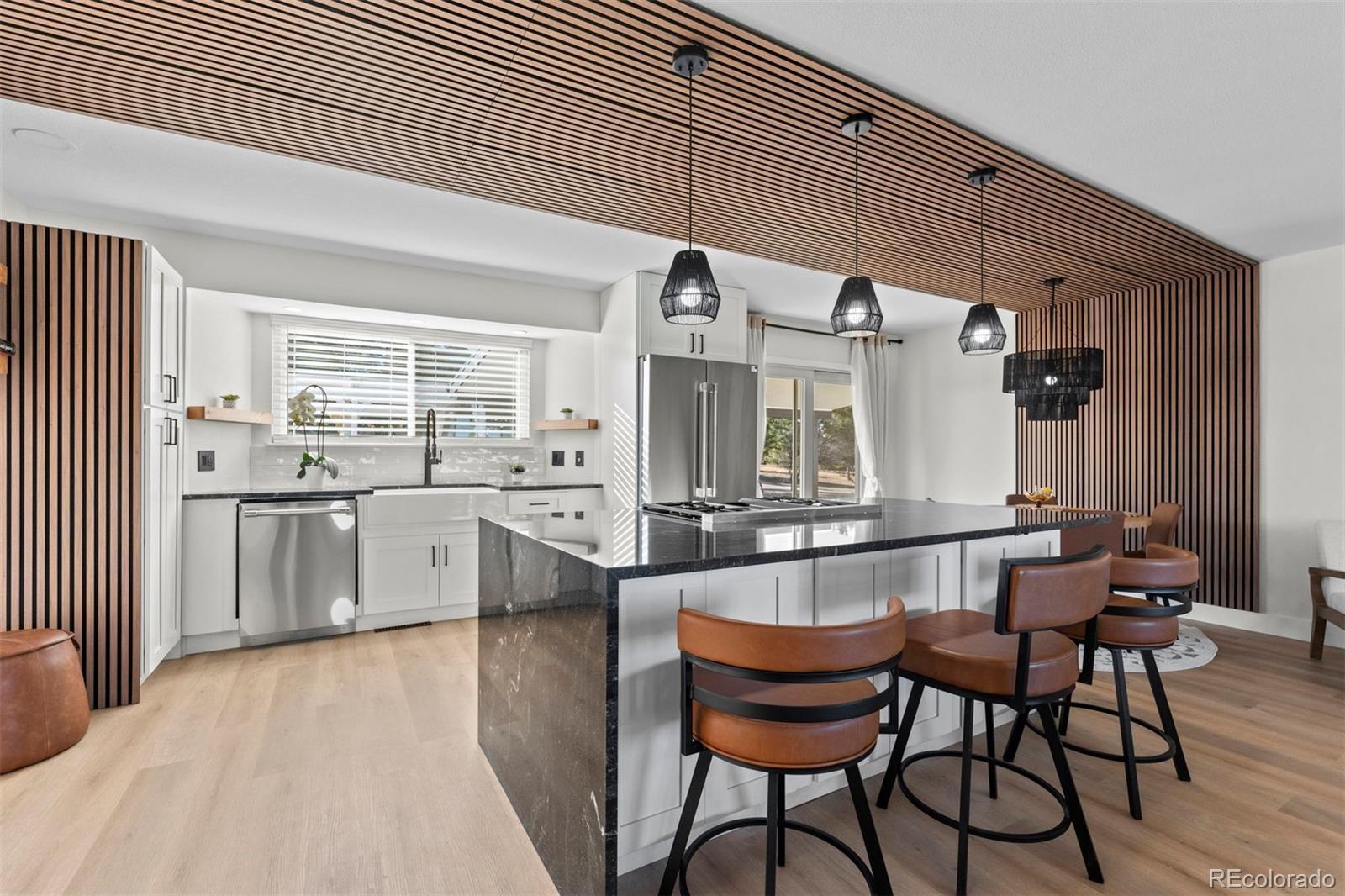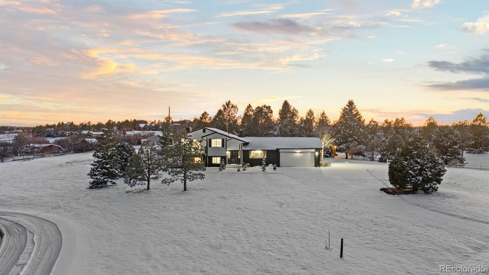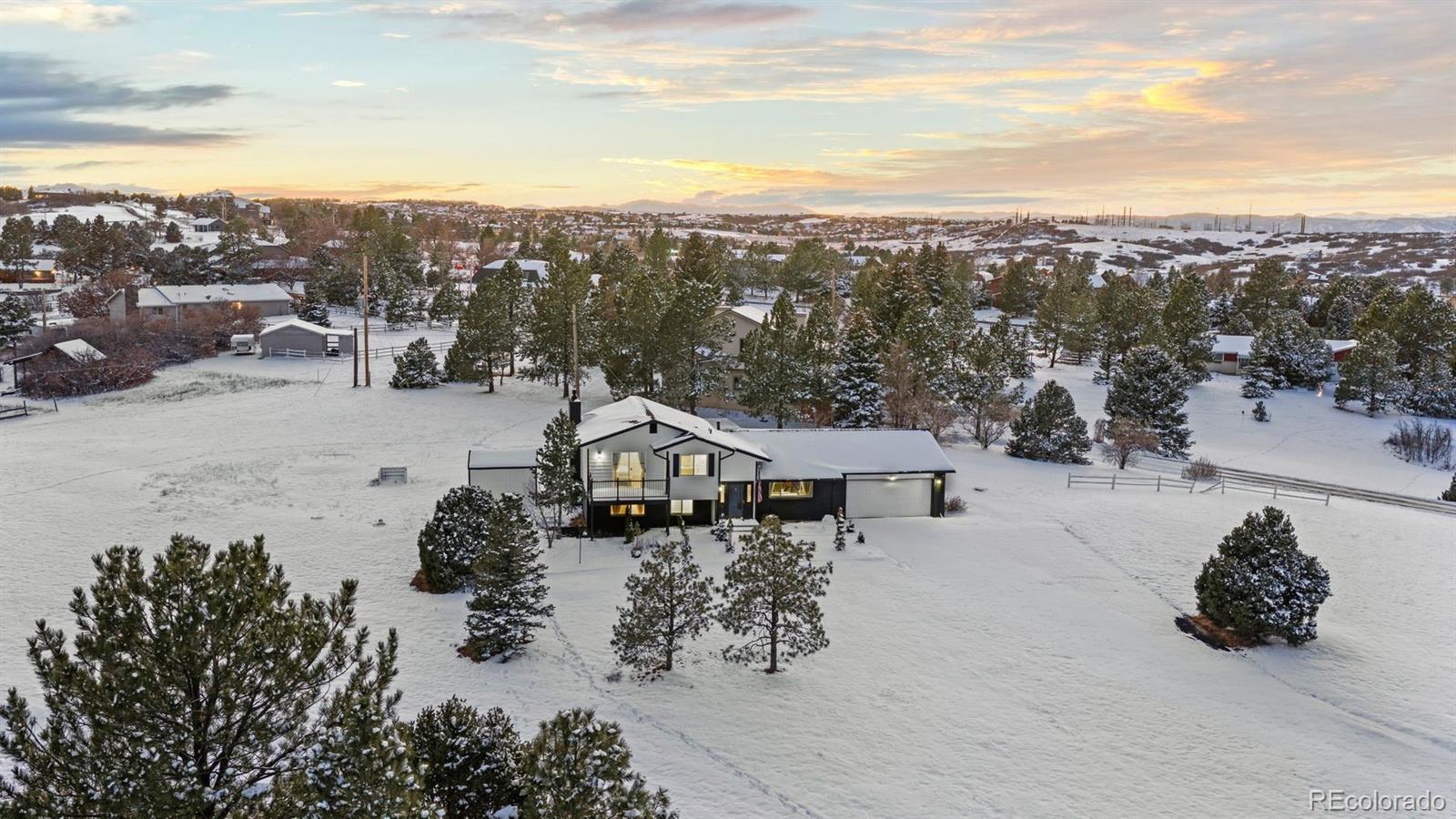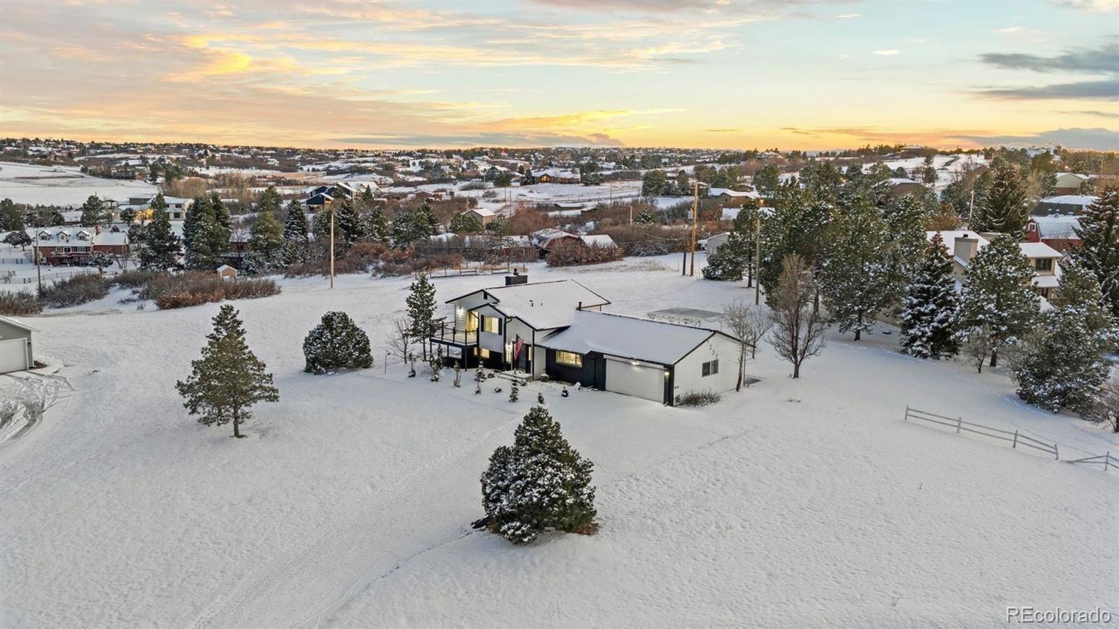 Experience both the calm of country living and the convenience of city access just 5 minutes from top-rated schools, restaurants, and I-25. Positioned on a large lot with open space and hillside views, this FULLY REMODELED right-sized residence offers land, privacy, character, and a clean, modern aesthetic that's hard to find. A thoughtfully reimagined main level sets the tone for everyday living and entertaining. The renovated kitchen showcases a bold linear wood slat ceiling, new cabinets, luxury vinyl plank flooring, granite counters, and a dramatic waterfall-edge center island with custom wood detailing, complemented by premium Thermador appliances. An updated dining area with contemporary pendant lighting flows seamlessly into adjacent living spaces and opens to a covered patio and expansive backyard. Nearby, the living room features a gas fireplace with a custom wood mantel and a striking floor-to-ceiling wood accent wall. A flexible main level bedroom works beautifully as a guest room or home office, and is paired with an adjacent remodeled powder room featuring a contemporary vanity with a bonus freestanding soaking tub. Upstairs, the primary suite offers abundant natural light and access to a private balcony overlooking open space and hillside views. A fully remodeled primary bath includes a custom double vanity, statement tile accents, a frameless glass shower with built-in niche, and designer lighting. Two additional upper level bedrooms feature large windows, new flooring, and generous closets, and share a stylish full bathroom with sleek finishes. Downstairs, an expansive bonus room with brand new carpet provides flexible space for a media room, studio, gym, entertaining area, or all of the above while mechanical and laundry spaces remain neatly tucked away. Completely transformed from top to bottom, this home delivers contemporary design and ultimate convenience in a setting that feels comfortably removed yet remarkably close to it all.
