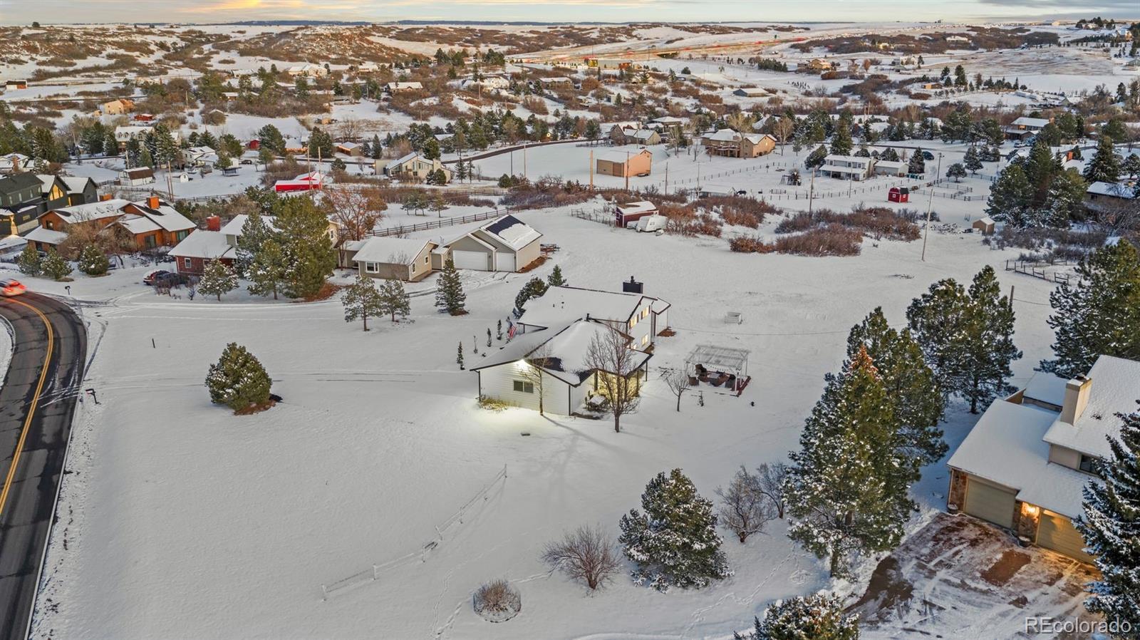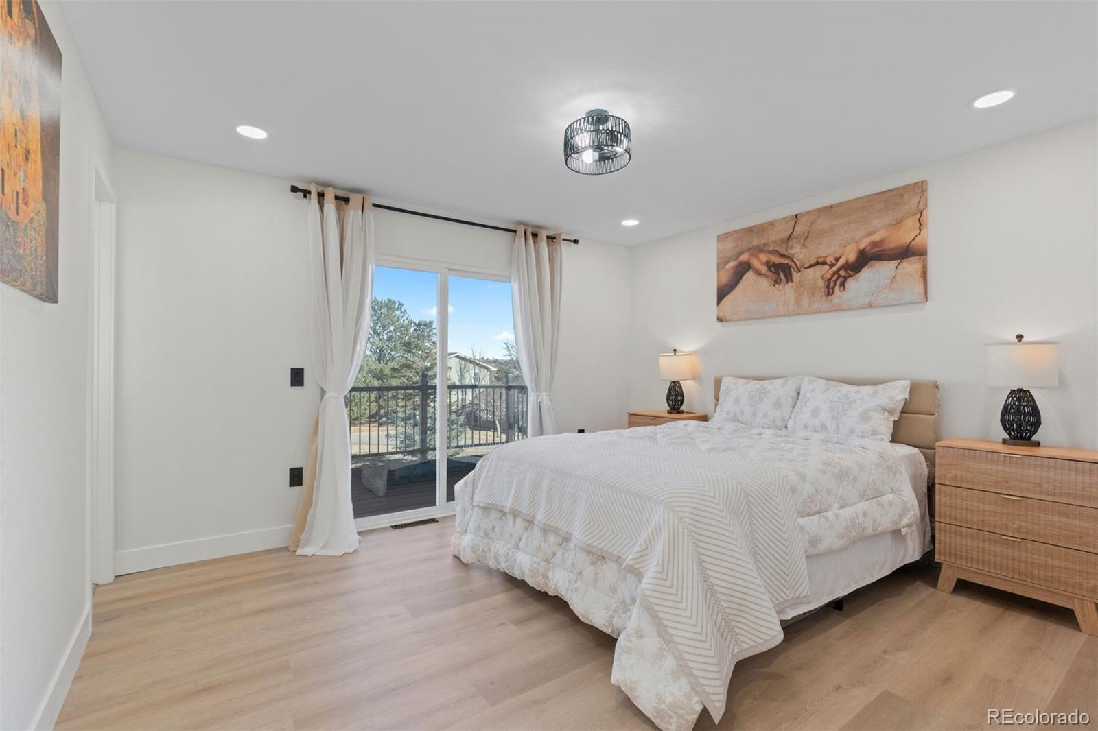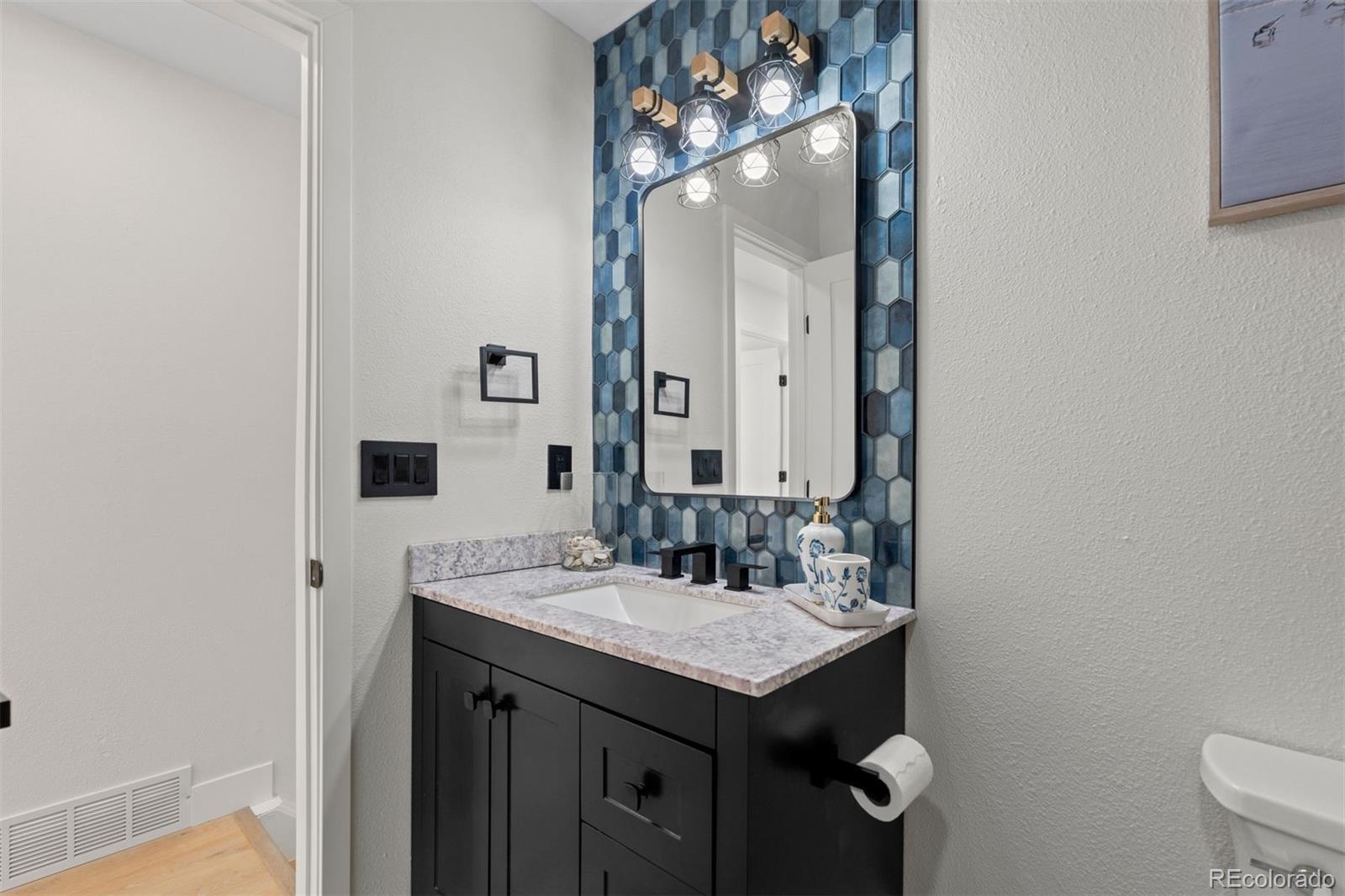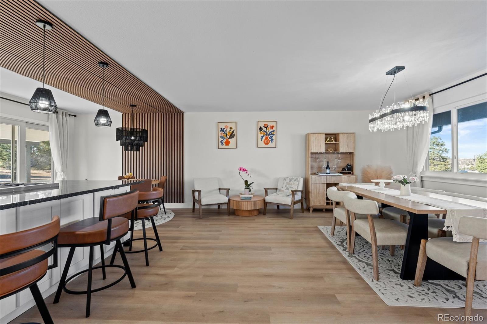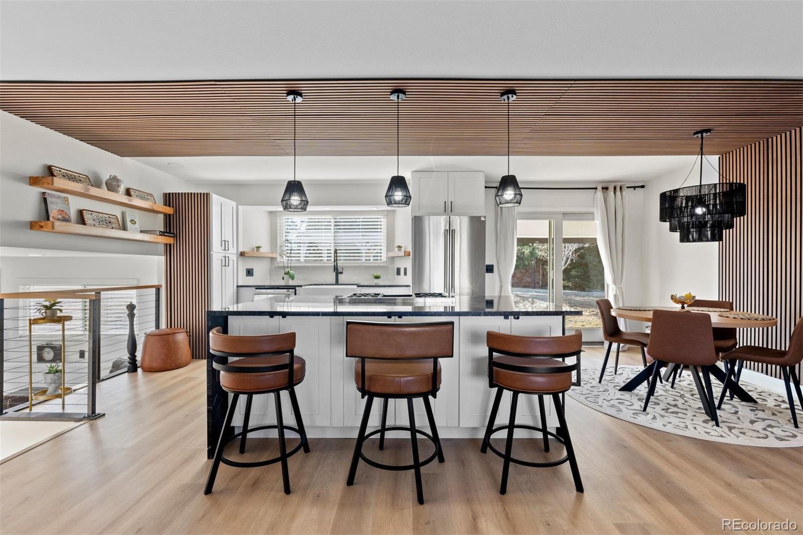 Experience both the calm of country living and the convenience of city access just 5 minutes from top-rated schools, restaurants, and I-25. Positioned on a large lot with open space and hillside views, this FULLY REMODELED right-sized residence offers land, privacy, character, and a clean, modern aesthetic that's hard to find. A thoughtfully reimagined main level sets the tone for everyday living and entertaining. The renovated kitchen showcases a bold linear wood slat ceiling, new cabinets, luxury vinyl plank flooring, granite counters, and a dramatic waterfall-edge center island with custom wood detailing, complemented by premium Thermador appliances. An updated dining area with contemporary pendant lighting flows seamlessly into adjacent living spaces and opens to a covered patio and expansive backyard. Nearby, the living room features a gas fireplace with a custom wood mantel and a striking floor-to-ceiling wood accent wall. A flexible main level bedroom works beautifully as a guest room or home office, and is paired with an adjacent remodeled powder room featuring a contemporary vanity with a bonus freestanding soaking tub. Upstairs, the primary suite offers abundant natural light and access to a private balcony overlooking open space and hillside views. A fully remodeled primary bath includes a custom double vanity, statement tile accents, a frameless glass shower with built-in niche, and designer lighting. Two additional upper level bedrooms feature large windows, new flooring, and generous closets, and share a stylish full bathroom with sleek finishes. Downstairs, an expansive bonus room with brand new carpet provides flexible space for a media room, studio, gym, entertaining area, or all of the above while mechanical and laundry spaces remain neatly tucked away. Completely transformed from top to bottom, this home delivers contemporary design and ultimate convenience in a setting that feels comfortably removed yet remarkably close to it all.