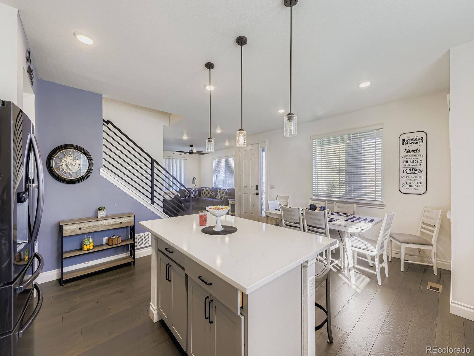 Discover contemporary living at its finest in this stunning 3-bedroom, 3-bath single-family home in Commerce City, ideally located near Buffalo Run Golf Course and a tranquil greenbelt. Built in 2020, this nearly 2,000 sq. ft. home showcases modern design, thoughtful layout, and premium builder finishes throughout. Step inside to find soaring 10-foot ceilings and an open-concept floor plan filled with natural light. The chef’s kitchen is beautifully appointed with quartz countertops, sleek black stainless steel appliances, and a spacious island perfect for cooking, entertaining, or casual dining. The main level offers seamless flow between the kitchen, dining, and living areas, creating a welcoming atmosphere for gatherings. Upstairs, the private primary suite features a walk-in closet and spa-like bathroom, while two additional bedrooms, a full bath, and a versatile loft provide plenty of space for family, guests, or a home office. Enjoy peaceful evenings on the covered front porch or take advantage of nearby parks, trails, and open spaces that enhance the neighborhood’s charm. With its stylish finishes, modern comfort, and prime location, this home perfectly blends convenience and sophistication. Highly motivated seller, open to all offers and creative concessions.