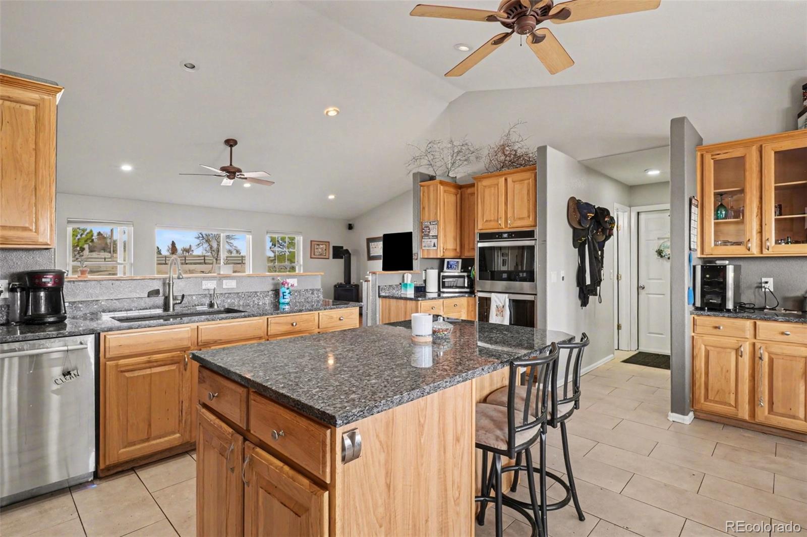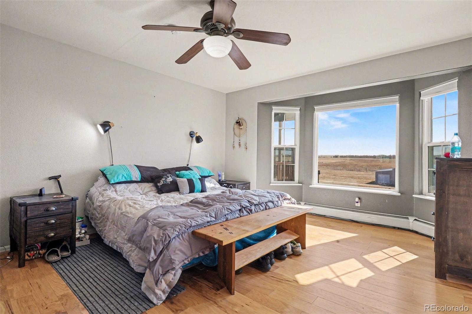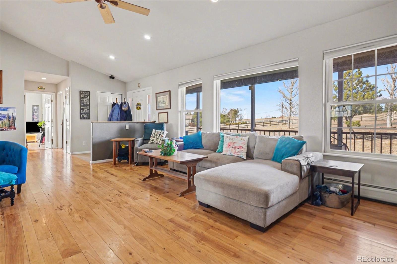 Experience Colorado living at its finest on this incredible 35-acre ranch home, panoramic views stretch in every direction and vibrant sunsets paint the sky each evening. Thoughtfully designed for comfort, function, and connection to the land, the home features a spacious primary suite with a walk-in closet, expansive windows that frame the surrounding landscape with big skies and sunflowers as far as the can see! A large kitchen also looks out over the land, appointed with stainless steel appliances, granite countertops and double ovens, perfect for gatherings. The enormous finished walkout basement adds even more versatility, complete with its own kitchenette, full bath, bedroom and hobby/workshop area—ideal for guests, multigenerational living, or entertaining. Recent upgrades include new windows, fresh paint, updated flooring, and a new roof, ensuring peace of mind for years to come. For those seeking space, utility, or the freedom to pursue hobbies and homesteading, this property delivers! A massive 5,000-square-foot multi room barn with and oversized pull through doors provides endless possibilities including space for an RV, farm equipment, and your toys, complemented by a loafing shed, 2 additional sheds that have been home to ducks chickens & goats, irrigated grounds, and fenced/ cross-fenced pastures. There is a dedicated garden area, pastures and ample room for livestock, or crops. Modern conveniences blend seamlessly with rural tranquility: solar power with battery backup, a four-car heated garage, security cameras, and extensive exterior lighting add comfort and security. The quiet, welcoming, gated community offers the peace and serenity of country living with surprisingly easy access to DIA and a short commute to downtown Denver. Whether you dream of homesteading, need room to grow, or simply crave room to breathe, wide-open spaces and breathtaking views, this property offers a rare opportunity to live the dream lifestyle you’ve imagined!