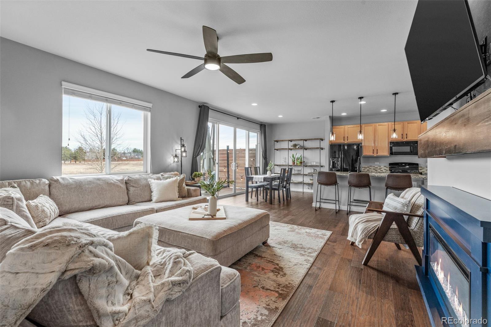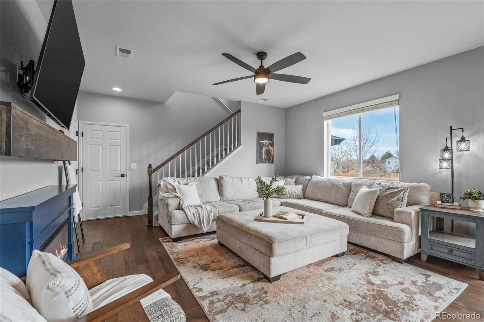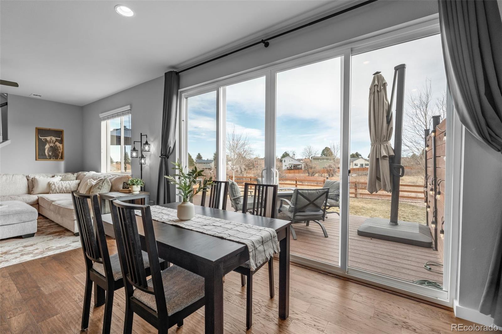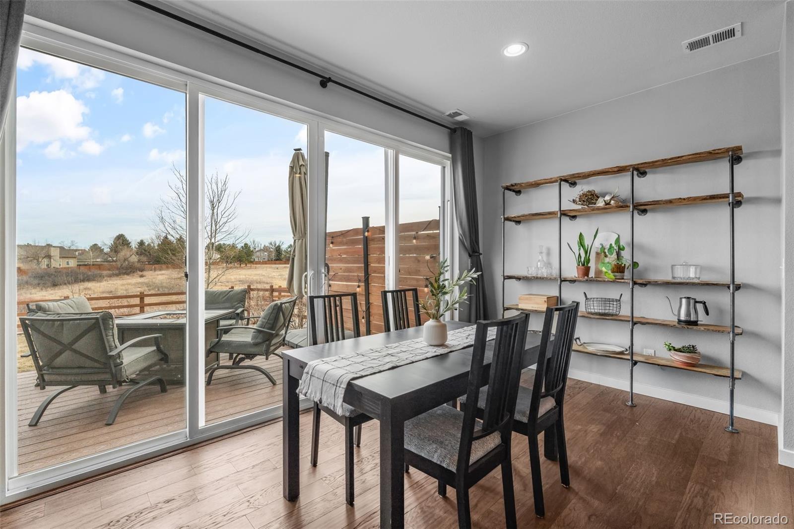 Welcome home to this gorgeous 3-bedroom, 3-bath residence offering over 1,900 sq ft of beautifully designed living space in the heart of Founders Village. From the moment you enter, you’ll notice an abundance of natural sunlight pouring through large windows, enhanced by recently installed engineered wood flooring throughout the first floor, creating a bright, warm, and inviting atmosphere.Set on a premium lot backing to protected open space, this home offers rare privacy and serene views. The fenced backyard is ideal for relaxing, entertaining, or enjoying peaceful Colorado evenings with nature as your backdrop, no rear neighbors, just sprawling open space! Inside, the layout is both functional and stylish, featuring recently updated hardware and fixtures throughout for a modern, cohesive look. Both the primary and guest bathrooms showcase recent quartz upgrades, while the home also includes recent luxury pet- and stain-resistant carpet, providing comfort and durability.Enjoy peace of mind with a recent Class 4 impact-resistant roof, and take advantage of the unbeatable location! Just a short walk to Founders Park with easy access to trails, playgrounds, and open space. A low HOA includes access to the neighborhood swimming pool, making this home as practical as it is beautiful.Combining thoughtful upgrades, natural light, privacy, and an exceptional location, this Founders Village home truly stands out!