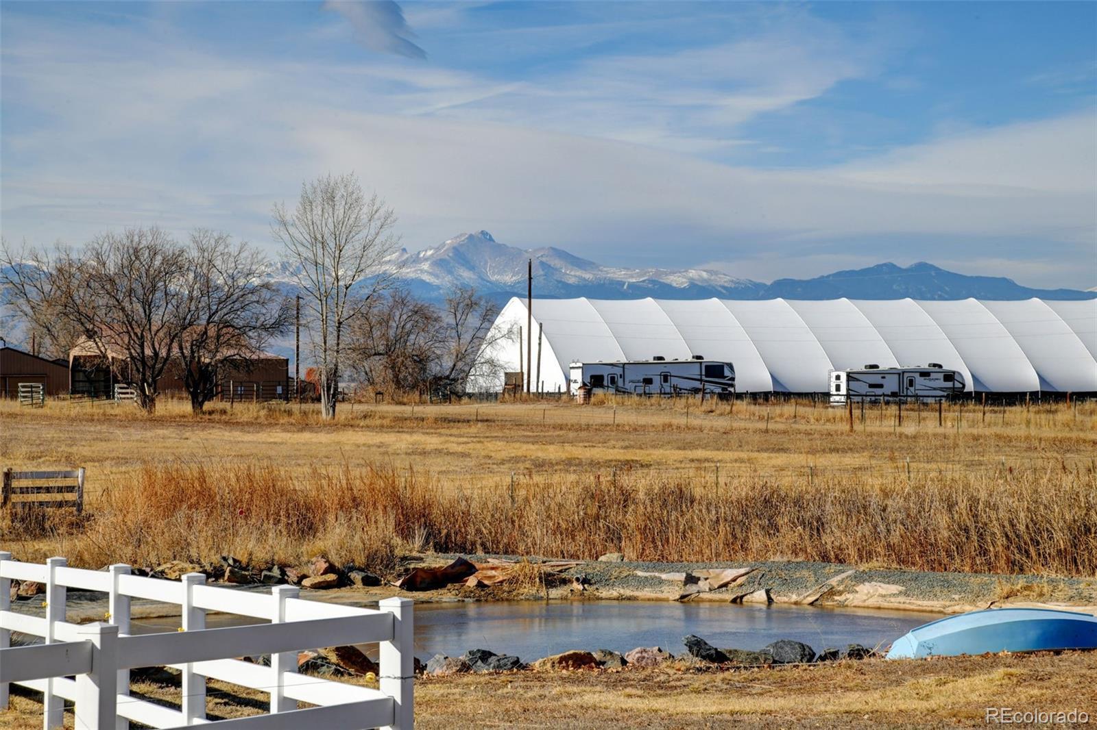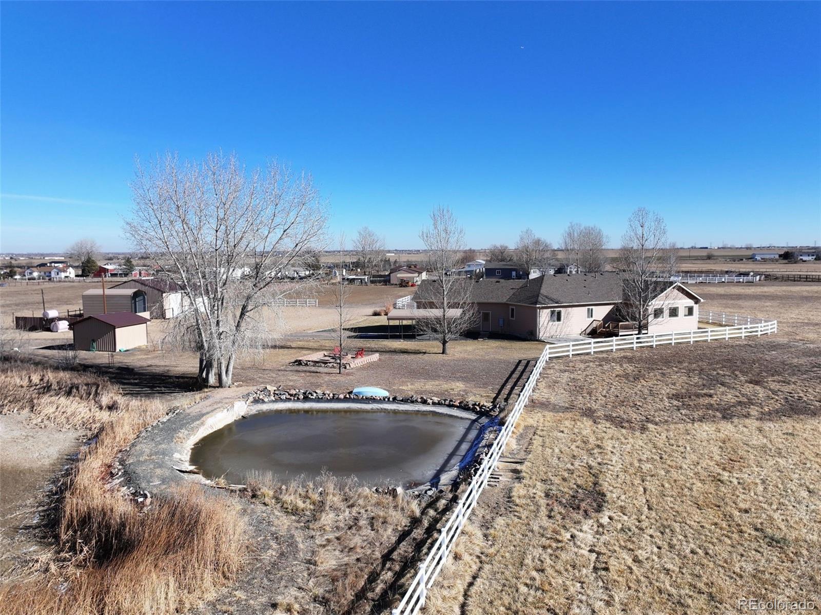 Custom-built ranch home set on 21 acres of scenic, usable land in Erie with sweeping panoramic mountain views. This property includes 2 metal buildings ideal for equipment, live stock, storage as well as 2 metal buildings to enhance the functionality of this 21 acre property. This refined gentleman’s ranch is thoughtfully designed for comfortable country living, offering space, privacy, and wide-open skies highlighted by stunning sunsets and frequent hot air balloon views. Inside, vaulted ceilings and a classic stone fireplace create a warm, welcoming atmosphere. Large windows fill the great room with natural light while perfectly framing the surrounding mountain landscape. The well-appointed kitchen features quality appliances, ample counter space, and a generous island, opening seamlessly to the main living area—ideal for gatherings after a day outdoors. The functional layout includes three bedrooms positioned for privacy, along with a versatile second living area that may serve as a sunroom, office, or additional living space. Step outside to a peaceful backyard setting with a cozy fire pit overlooking the pond, where expansive views can be enjoyed year-round. The property offers 21 acres of fenced and usable pasture, well suited for livestock, horses, or hobby ranching. Multiple sheds provide storage for equipment and supplies, and the open land offers flexibility for a variety of agricultural or recreational uses. Served by Left Hand water and United Power electricity, this exceptional ranch presents a rare opportunity to enjoy a true rural lifestyle with breathtaking views, usable acreage, and modern comfort.