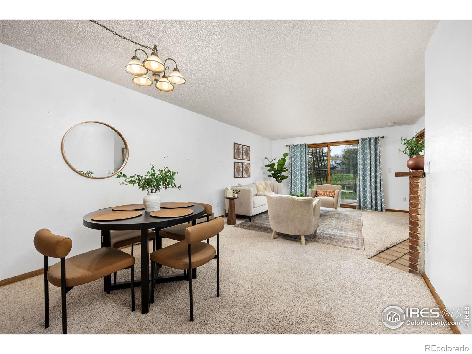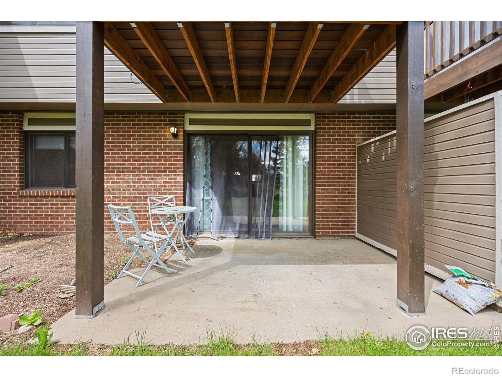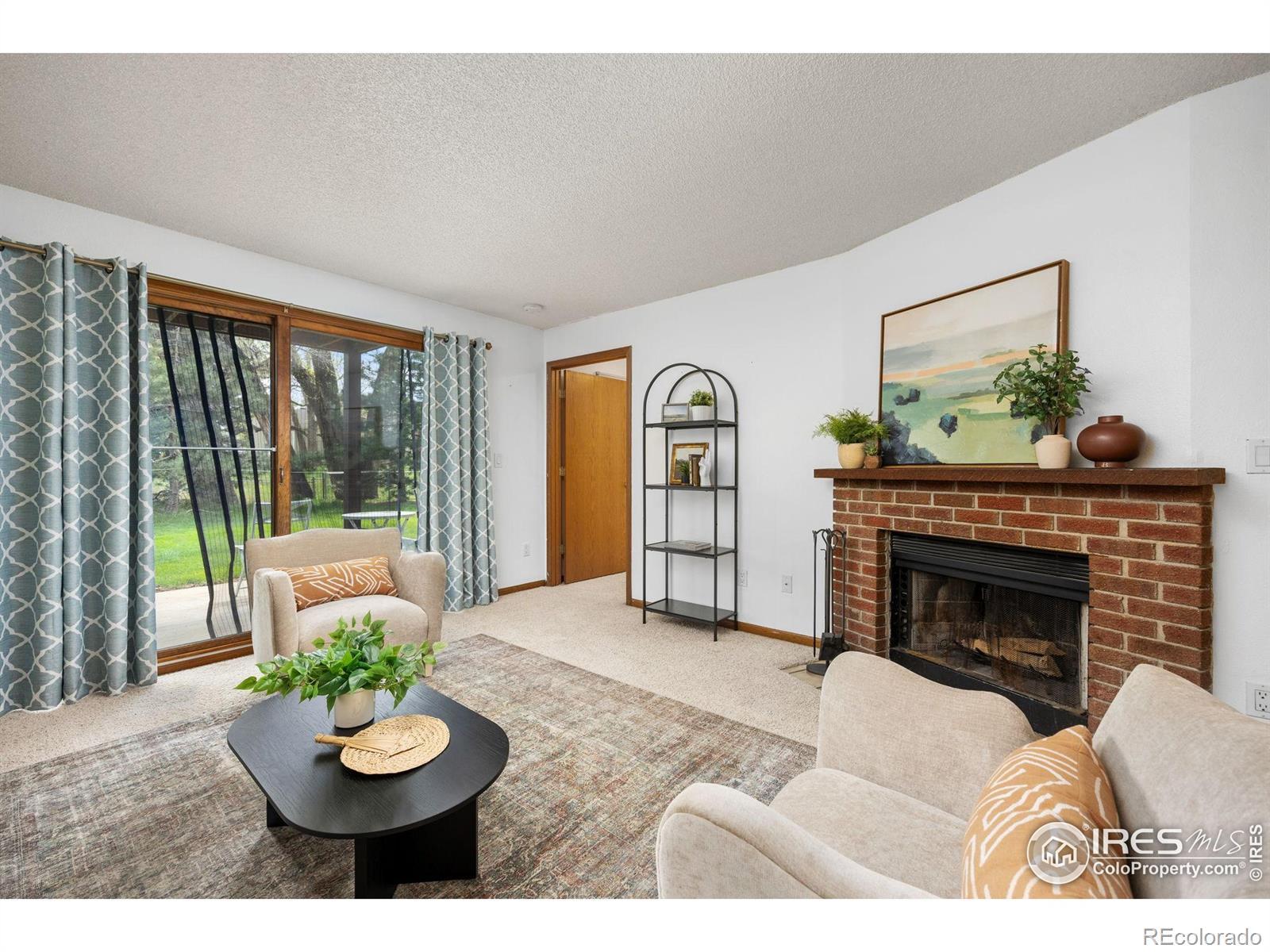 This light-filled, ground floor condo offers a rare combination of comfort, convenience, and location in the heart of Fort Collins. Featuring two spacious bedrooms and one well-appointed bath, the unit is move-in ready or perfect as an investment property. The open living room is anchored by a cozy wood-burning fireplace and opens through a large sliding glass door to a generous patio and expansive private green space, surrounded by mature trees for privacy and tranquility. The kitchen connects seamlessly to the dining area via a passthrough bar, making entertaining easy. A quiet community setting just minutes from CSU, Rossborough Park, Spring Creek Trail, and numerous amenities, this condo offers the best of Fort Collins living in a well-maintained, charming setting.