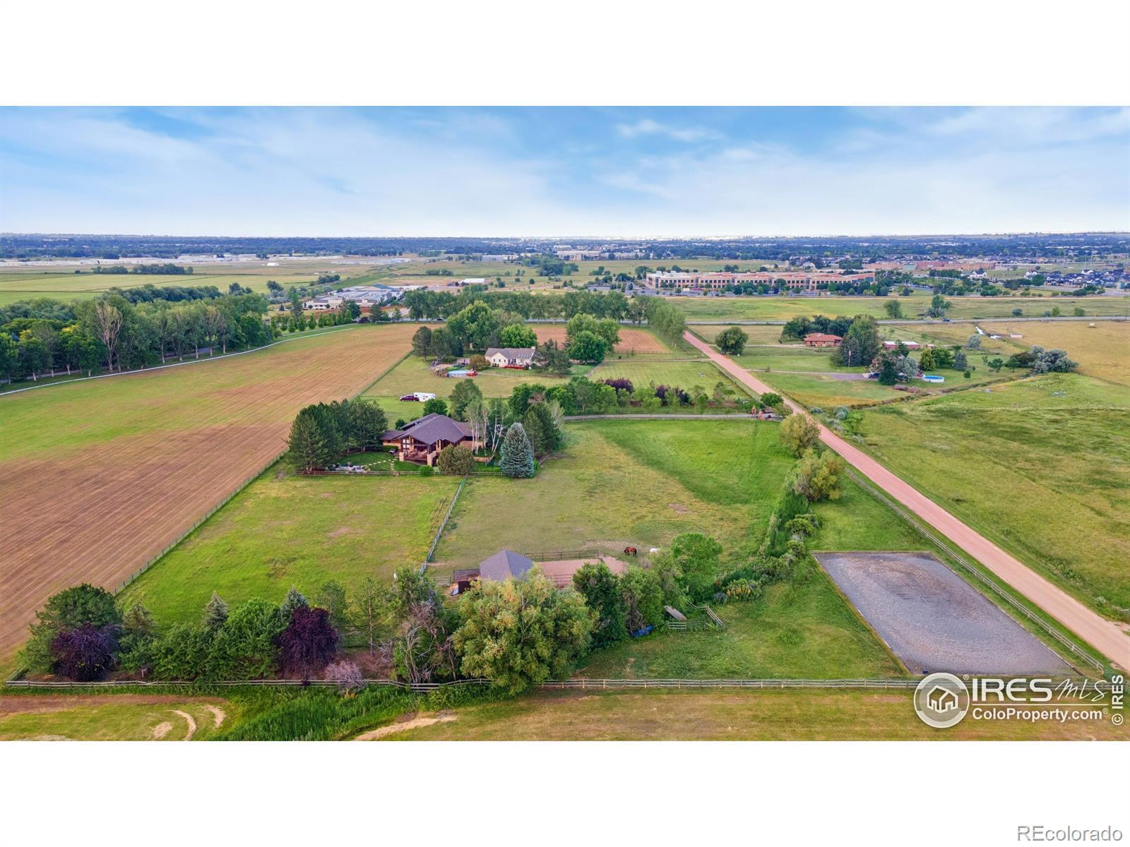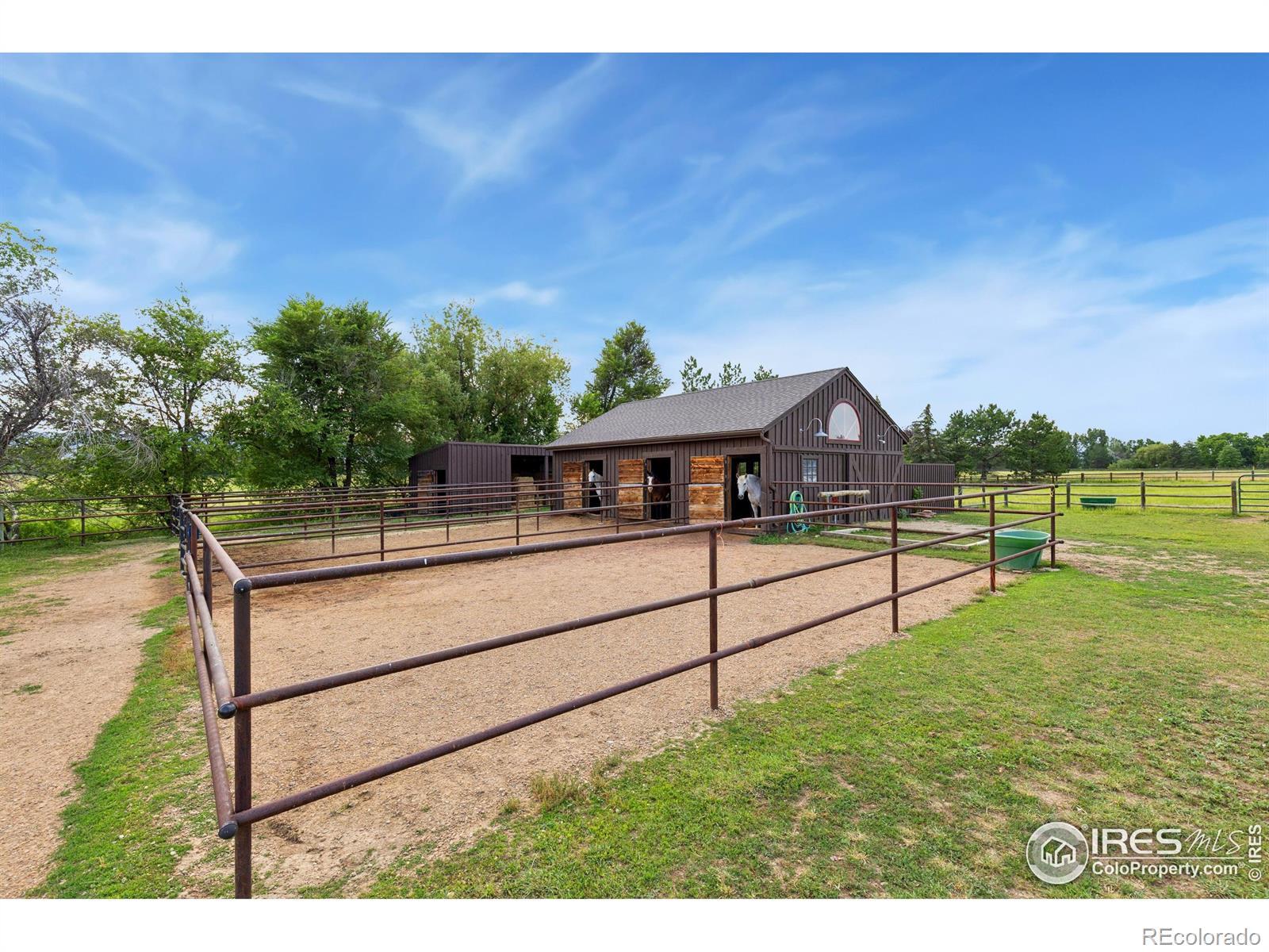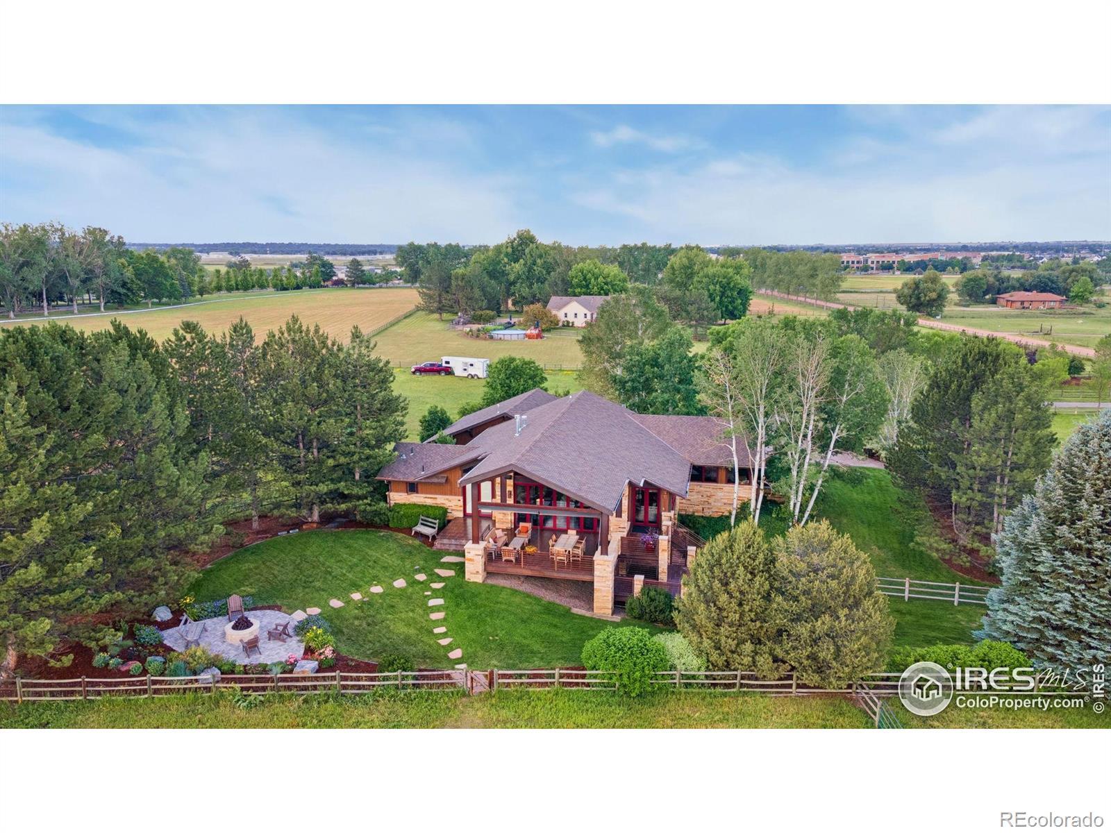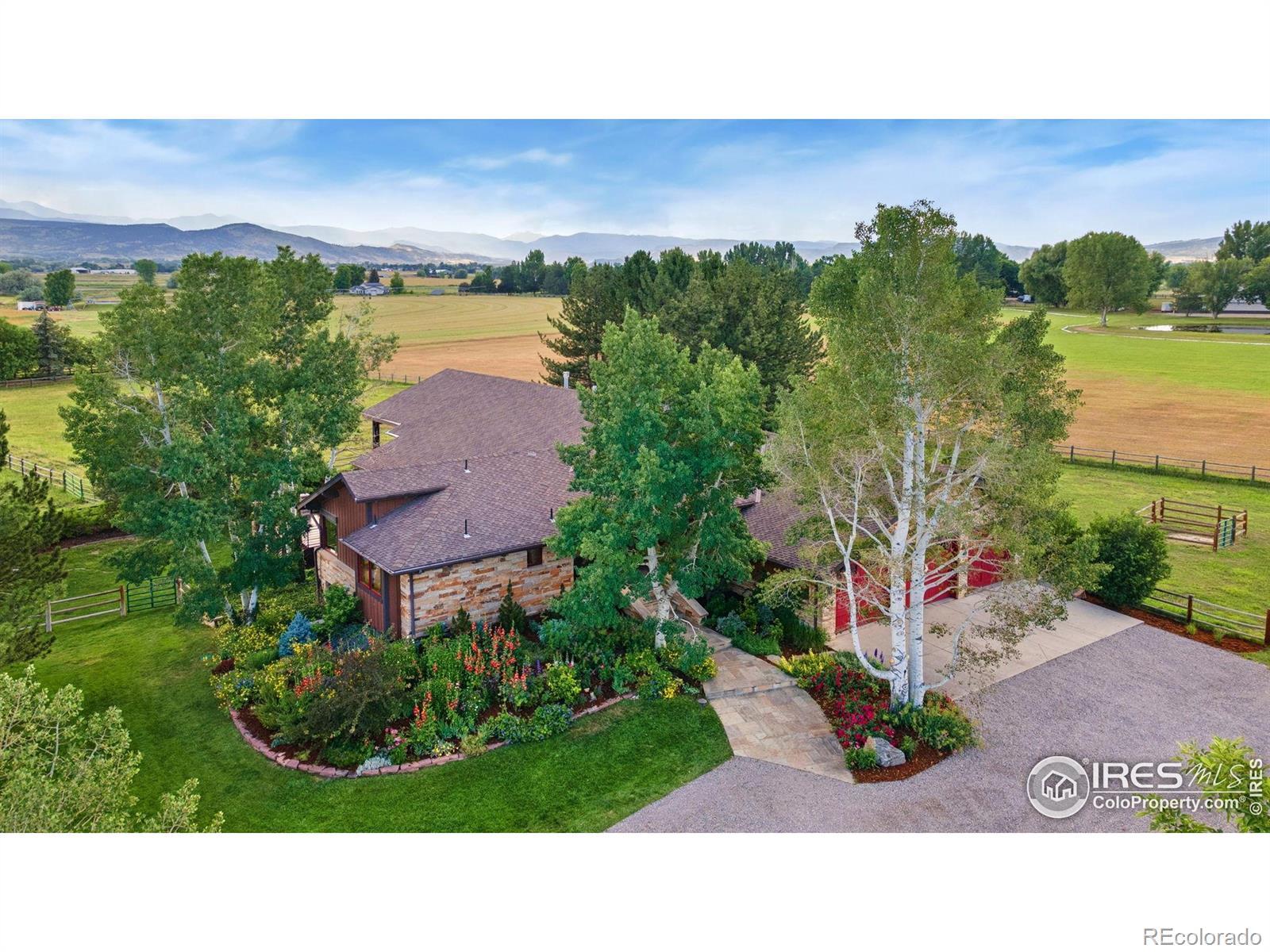 RUSTIC ELEGANCE MEETS PANORAMIC MOUNTAIN VIEWS - EXQUISITE EQUESTRIAN ESTATE ON 6.05 ACRES. More than a home - it's a lifestyle. This 4 bed 4 bath ranch-style estate blends luxury, natural beauty and equestrian functionality, all set against the stunning backdrop of Longs Peak, Mt Meeker and the Flatirons. Privately gated and completely renovated by renowned Nassar Development in 2012, offering peace and privacy minutes from town. Soaring vaulted ceilings, natural stone, custom woodwork & Chef's kitchen featuring Wolf Range/Sub-Zero/Double ovens, in-counter steamer, and Aspen Leaf Designs custom cabinetry, all designed for everyday living and entertaining. A dramatic stone fireplace and retractable glass wall connect the Great Room to a covered veranda and outdoor firepit, creating a seamless indoor-outdoor flow. The primary is private and tranquil with vaulted ceilings, spa-style bathroom and stunning mountain views. Three additional bedrooms and four well-appointed baths ensure comfort and flexibility for guests or multi-generational living. Equestrian facilities include a charming wood barn with 4 stalls, each with automatic waterers and individual paddocks, 3 fenced pastures, a riding arena, hay storage, shavings pit, and 3-rail iron fencing - all designed for function, safety and ease. James Ditch partial water share. Enjoy lush landscaping, mature trees and colorful gardens. Whether you're enjoying a quiet morning, dining al fresco, the outdoor living areas are as inviting as the interiors. This is a rare opportunity to own a property that reflects the best of Colorado living: beauty, craftsmanship, nature - whether you're unwinding by the fire, riding horses or hosting under the stars. If you've been dreaming of a home that inspires inside and out, this is it.