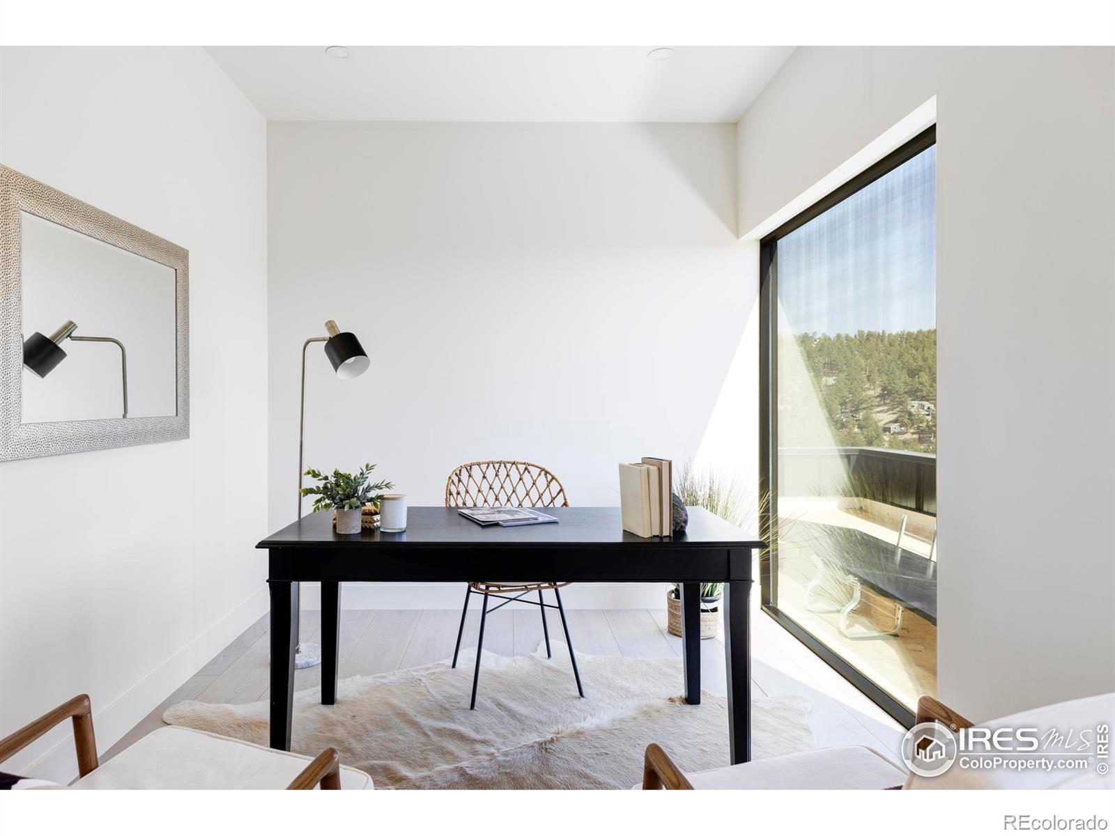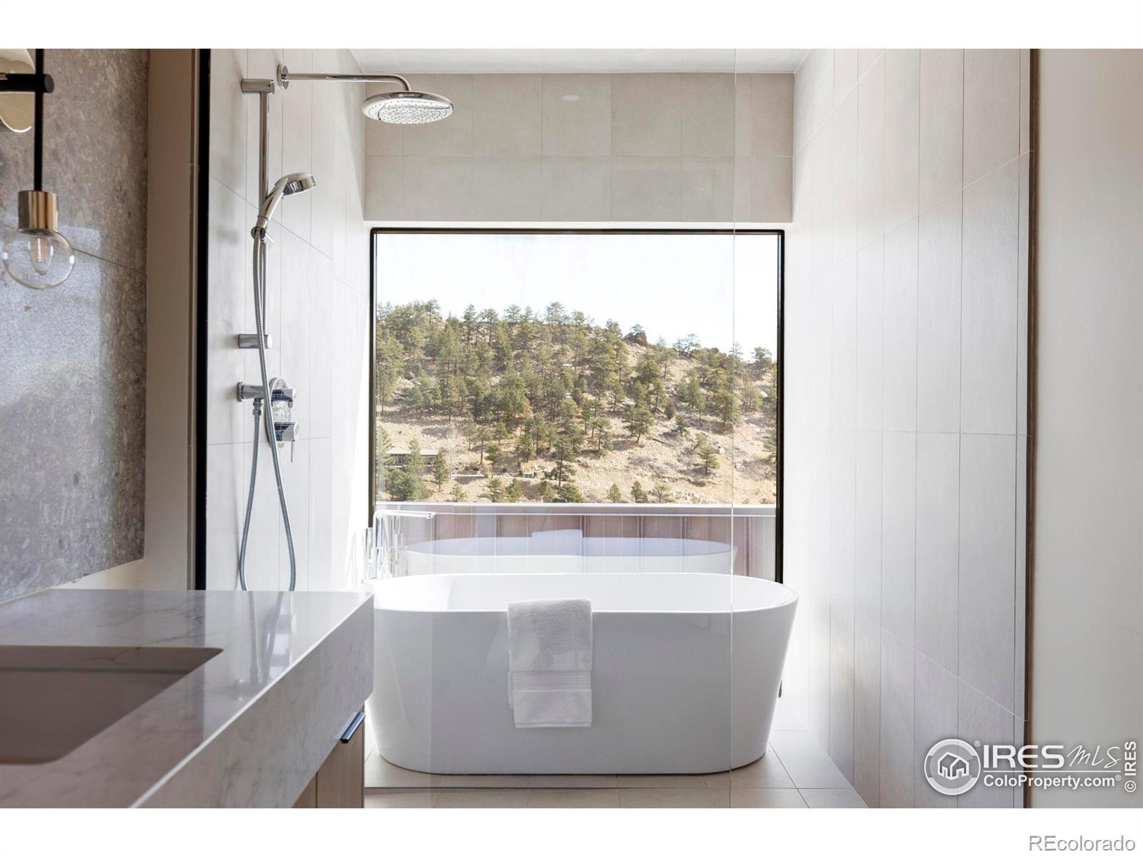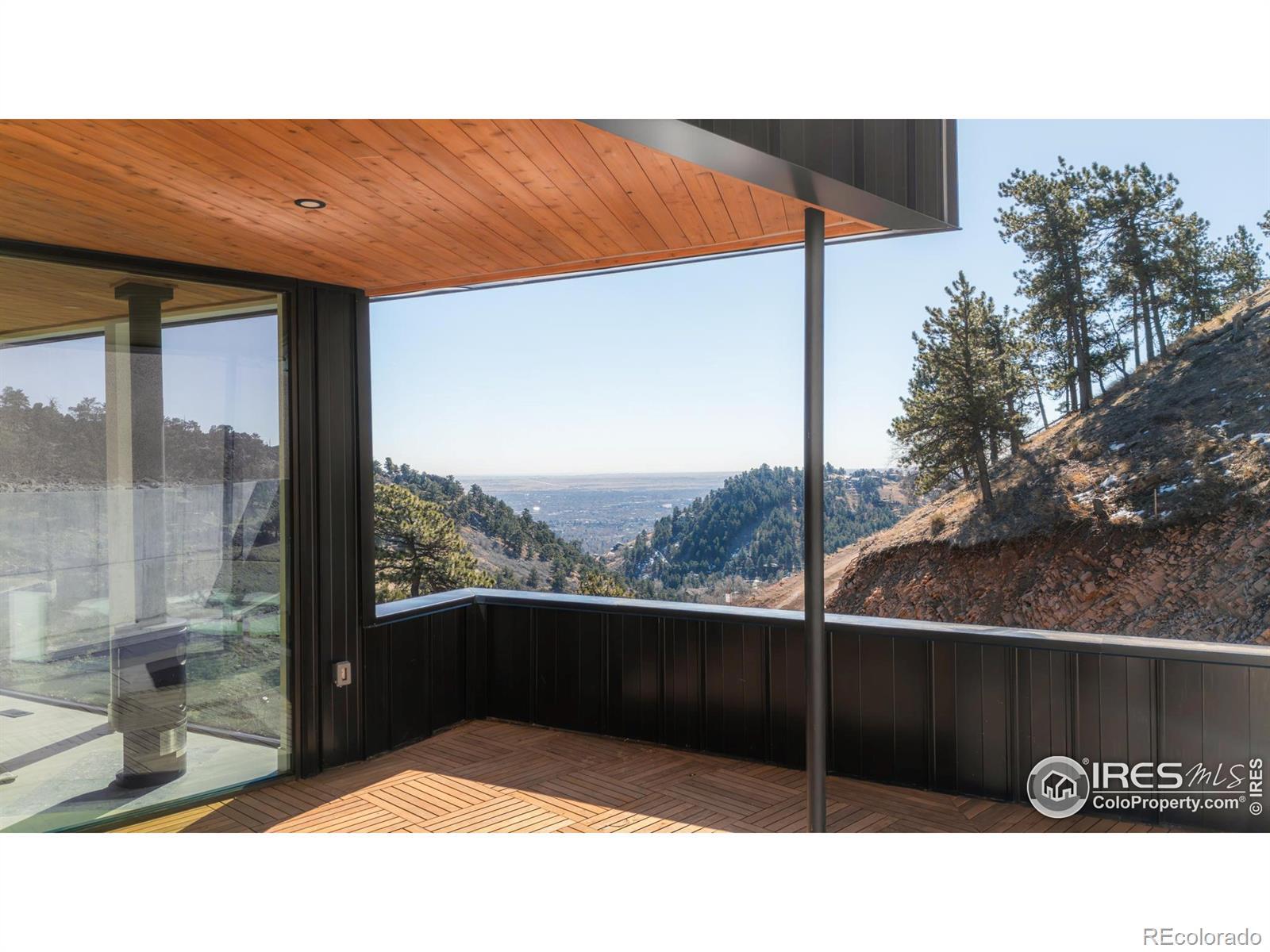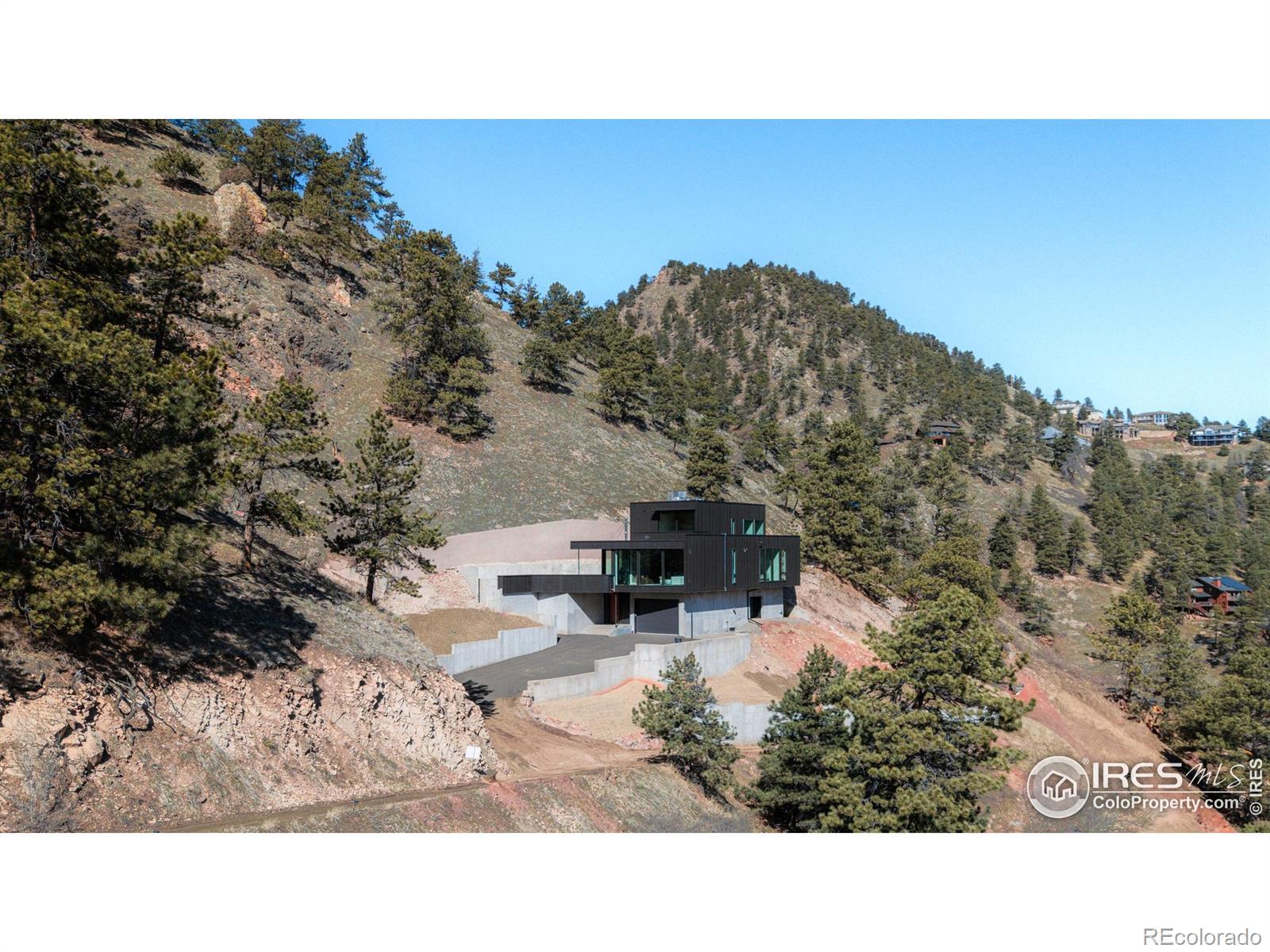 A masterfully modern foothills lifestyle awaits in this spectacular new-construction Pine Brook Hills showpiece designed by architect Nick Fiore of Flower Architecture. Featuring exquisite contemporary design and breathtaking views, this new construction home is a refined sanctuary just minutes from Boulder, Colorado amenities. Inside, a soothing palette of warm materials is accompanied by thoughtful illumination and premium finishes. Cedar tongue-and-groove ceilings soar above wide-plank white oak floors, level 5 drywall, solid-core doors and floor-to-ceiling windows. The front door opens on the lower level, where a large foyer boasts bench seating and a row of mudroom storage. The main level is designed for relaxing and entertaining, featuring a great room with a chic circular wood-burning fireplace, and floor-to-ceiling and wall-to-wall windows frame views that sweep across the Boulder skyline and beyond. The work-of-art open kitchen features custom whitewashed oak cabinetry and quartz countertops surrounding a fleet of Italian Smeg and Fisher & Paykel appliances. The home's top floor is dedicated to the private owner's retreat, featuring a luxurious bedroom with a linear gas fireplace that opens to a stunning private deck. Escape to the en-suite spa bathroom to enjoy a large wet room shower and freestanding soaking tub, a private water closet and a floating terrazzo double vanity. A facade of exposed architectural concrete and fire-resistant standing-seam steel siding creates a striking juxtaposition with the surrounding landscape, while a long driveway and attached two-car garage add abundant parking to this hillside Boulder beauty. This phenomenal home is just minutes from world-class trails, Wonderland Lake, North Boulder & Downtown/Pearl St amenities. See Attached Features List and Floor Plans