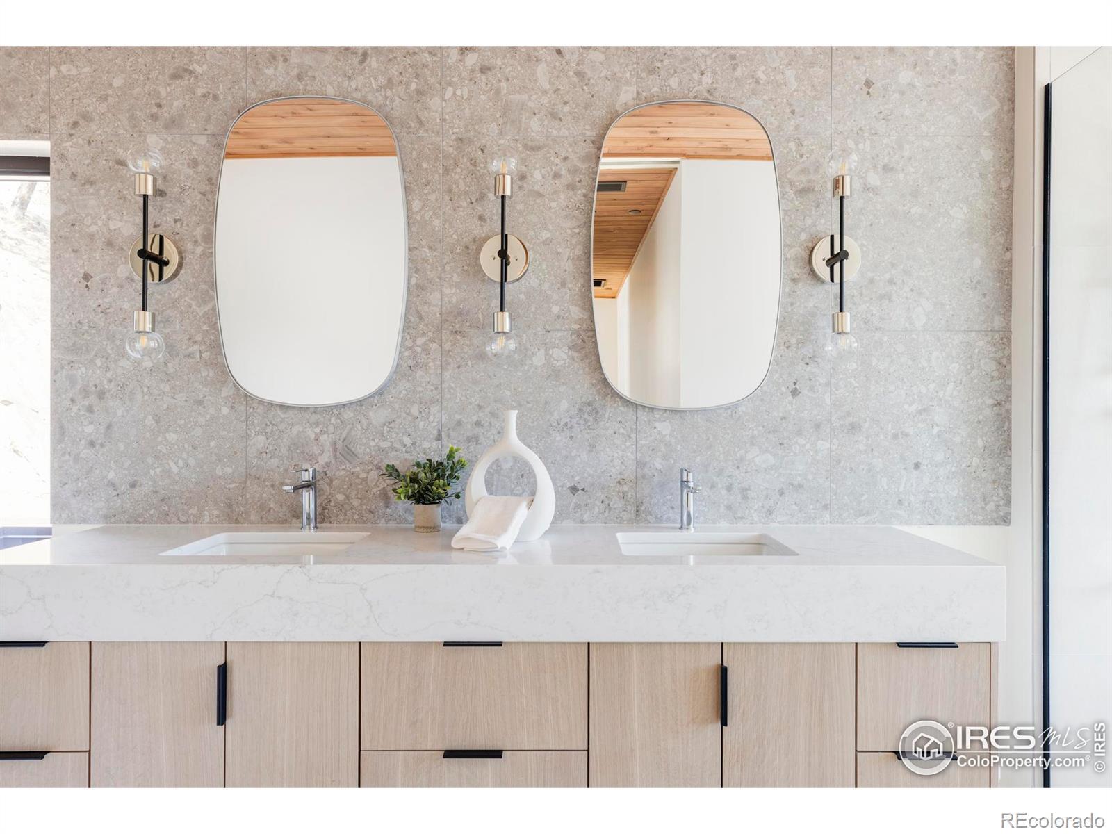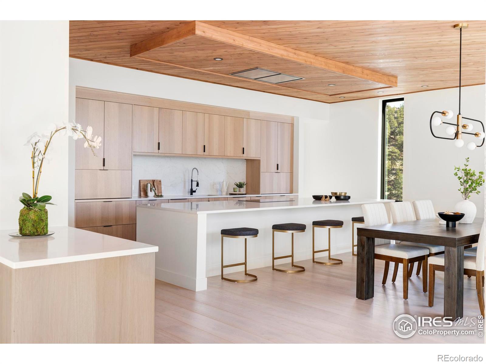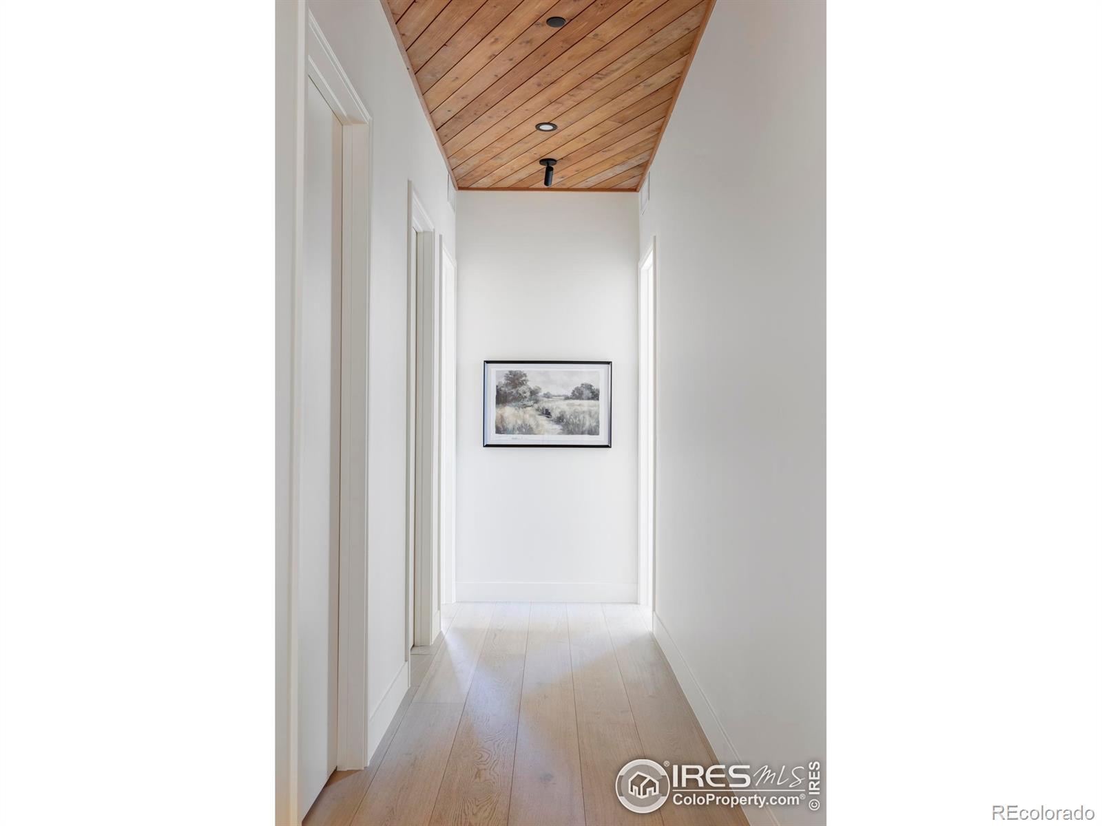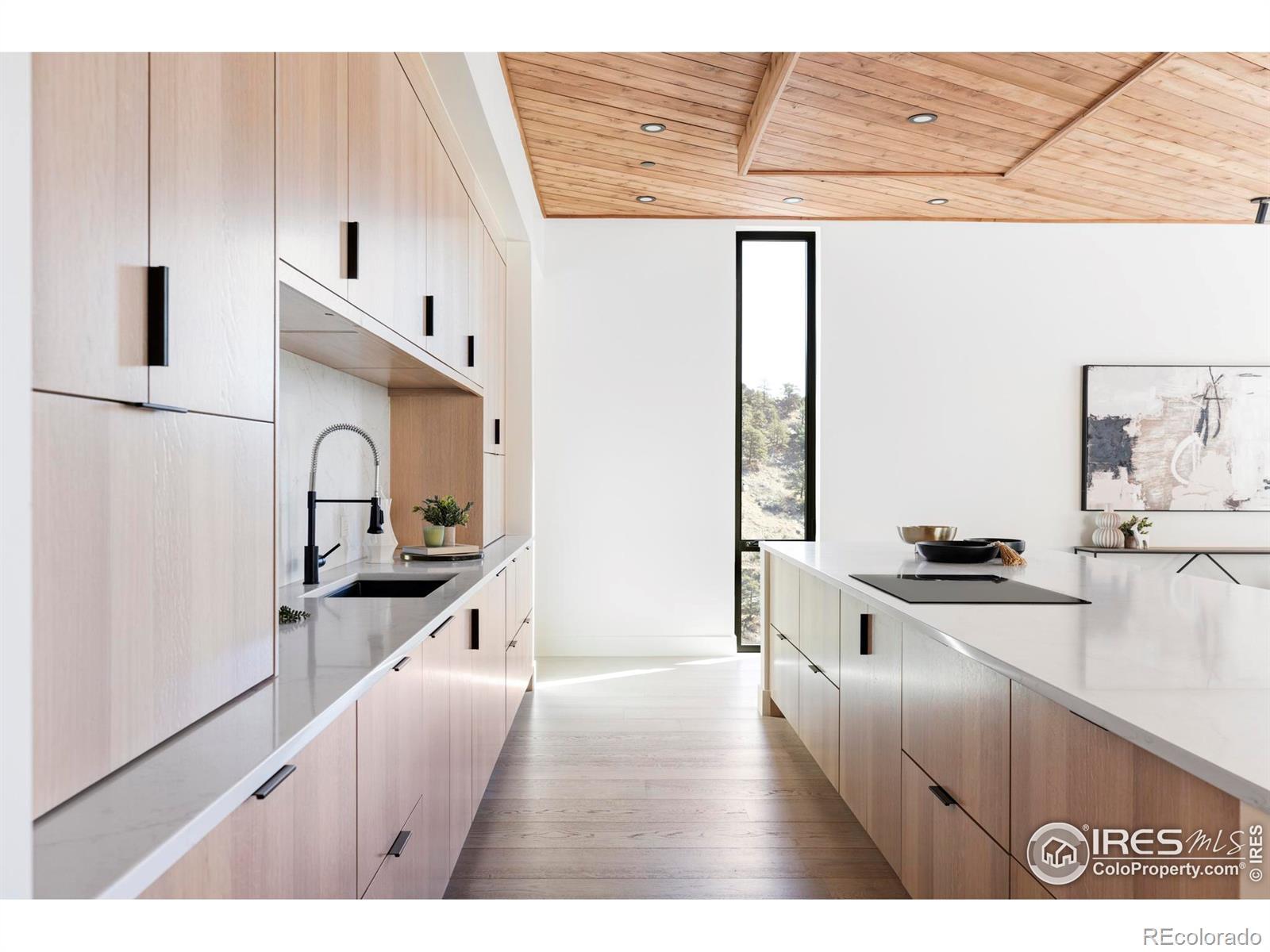 A masterfully modern foothills lifestyle awaits in this spectacular new-construction Pine Brook Hills showpiece designed by architect Nick Fiore of Flower Architecture. Featuring exquisite contemporary design and breathtaking views, this new construction home is a refined sanctuary just minutes from Boulder, Colorado amenities. Inside, a soothing palette of warm materials is accompanied by thoughtful illumination and premium finishes. Cedar tongue-and-groove ceilings soar above wide-plank white oak floors, level 5 drywall, solid-core doors and floor-to-ceiling windows. The front door opens on the lower level, where a large foyer boasts bench seating and a row of mudroom storage. The main level is designed for relaxing and entertaining, featuring a great room with a chic circular wood-burning fireplace, and floor-to-ceiling and wall-to-wall windows frame views that sweep across the Boulder skyline and beyond. The work-of-art open kitchen features custom whitewashed oak cabinetry and quartz countertops surrounding a fleet of Italian Smeg and Fisher & Paykel appliances. The home's top floor is dedicated to the private owner's retreat, featuring a luxurious bedroom with a linear gas fireplace that opens to a stunning private deck. Escape to the en-suite spa bathroom to enjoy a large wet room shower and freestanding soaking tub, a private water closet and a floating terrazzo double vanity. A facade of exposed architectural concrete and fire-resistant standing-seam steel siding creates a striking juxtaposition with the surrounding landscape, while a long driveway and attached two-car garage add abundant parking to this hillside Boulder beauty. This phenomenal home is just minutes from world-class trails, Wonderland Lake, North Boulder & Downtown/Pearl St amenities. See Attached Features List and Floor Plans