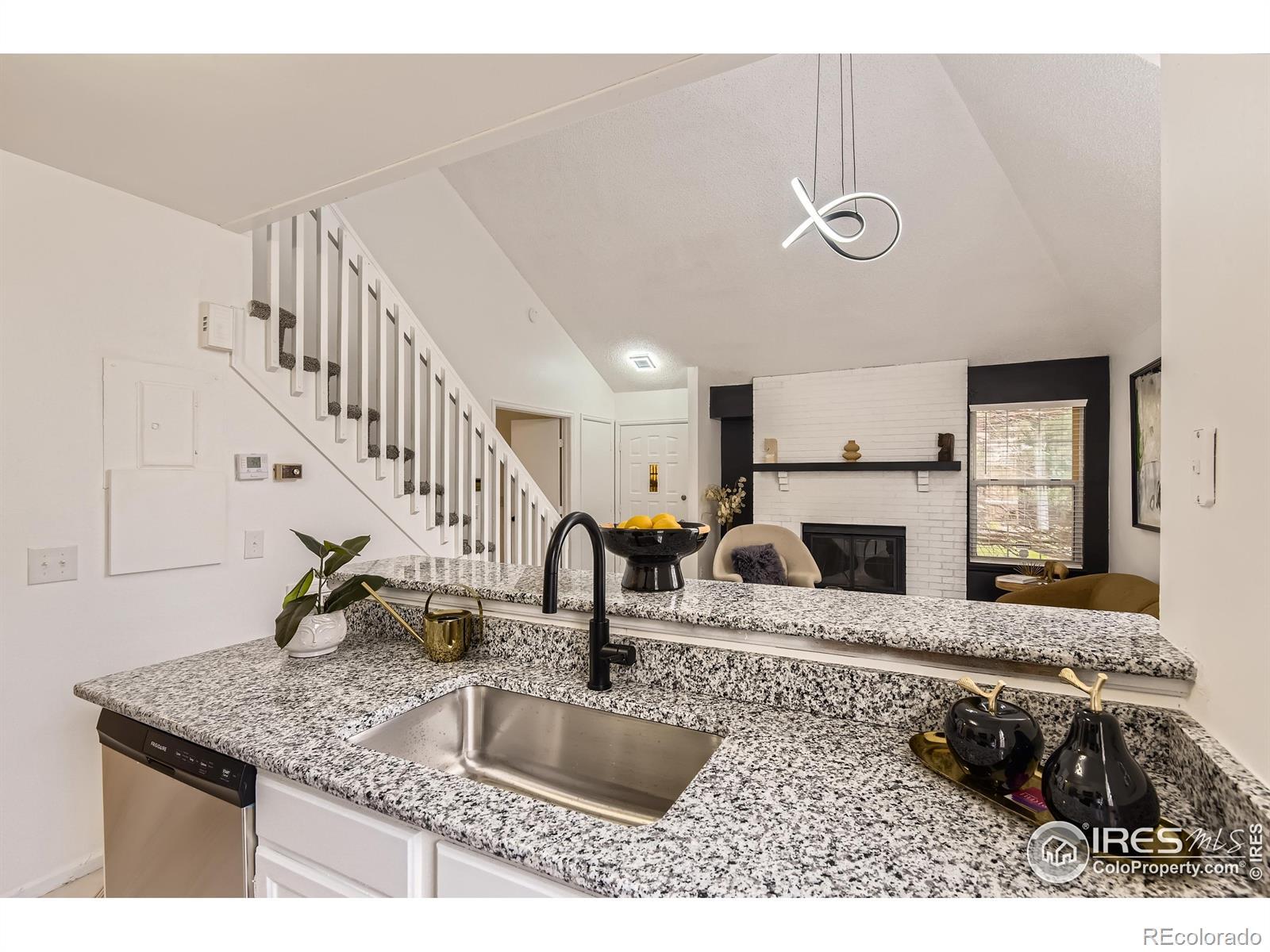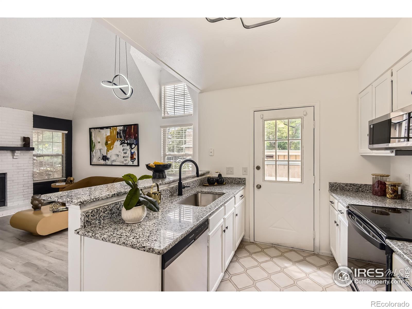 This townhome qualifies for Key Community's Fannie Mae HomeReady loan, allowing a 3% down payment (Conventional Loan). Contact for details. Class and contemporary touches flourish throughout this updated 2 BR x 2 BA end-unit townhome in the desirable Le Chateau community, where modern upgrades meet thoughtful design. This two-story home has been remodeled from top to bottom, offering a fresh, stylish, and turnkey living experience. Step inside to an impressive interior accentuated by soaring vaulted ceilings, a striking brick-surround wood-burning fireplace, and abundant natural light streaming in through extra-unit windows. The open-concept floor plan showcases brand-new luxury vinyl plank floors throughout the main level (and upper bath), paired with fresh new carpet on the stairs and 2nd level; bringing warmth and refined style to the home. The kitchen boasts brand-new granite countertops, chic pendant lighting, and stainless steel appliances- all seamlessly connected to the living and dining areas, which makes entertaining a breeze. The main floor features a spacious bedroom with wide French doors, LVP floors, and easy access to a dual-entry bathroom. The main-level laundry, thoughtfully tucked away, includes a newer washer & dryer for added convenience. Upstairs, a flexible loft area offers endless possibilities-use it as an office or media room. The upper-level primary suite is a true retreat, complete with a revitalized en-suite bathroom featuring new his-and-hers sinks, a new light fixture, and LVP flooring. Enjoy your morning coffee on the private patio, and take advantage of the community amenities, including a pool steps away. Fresh interior paint, modern light fixtures, and new bedroom ceiling fans. Extra storage in the crawl space. A 10-minute walk to the Light Rail. Quick access to I-225. Unbeatable convenience! Dining, shopping, and everyday essentials are all nearby.