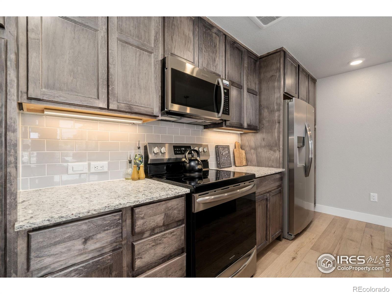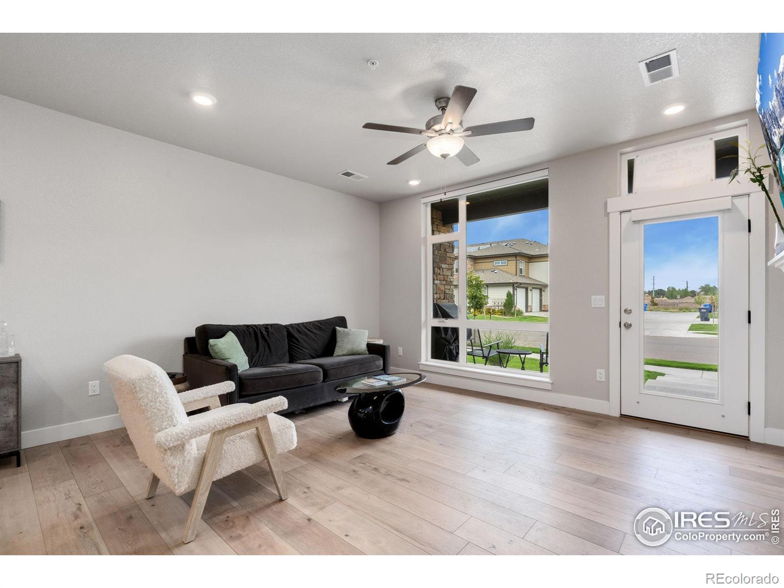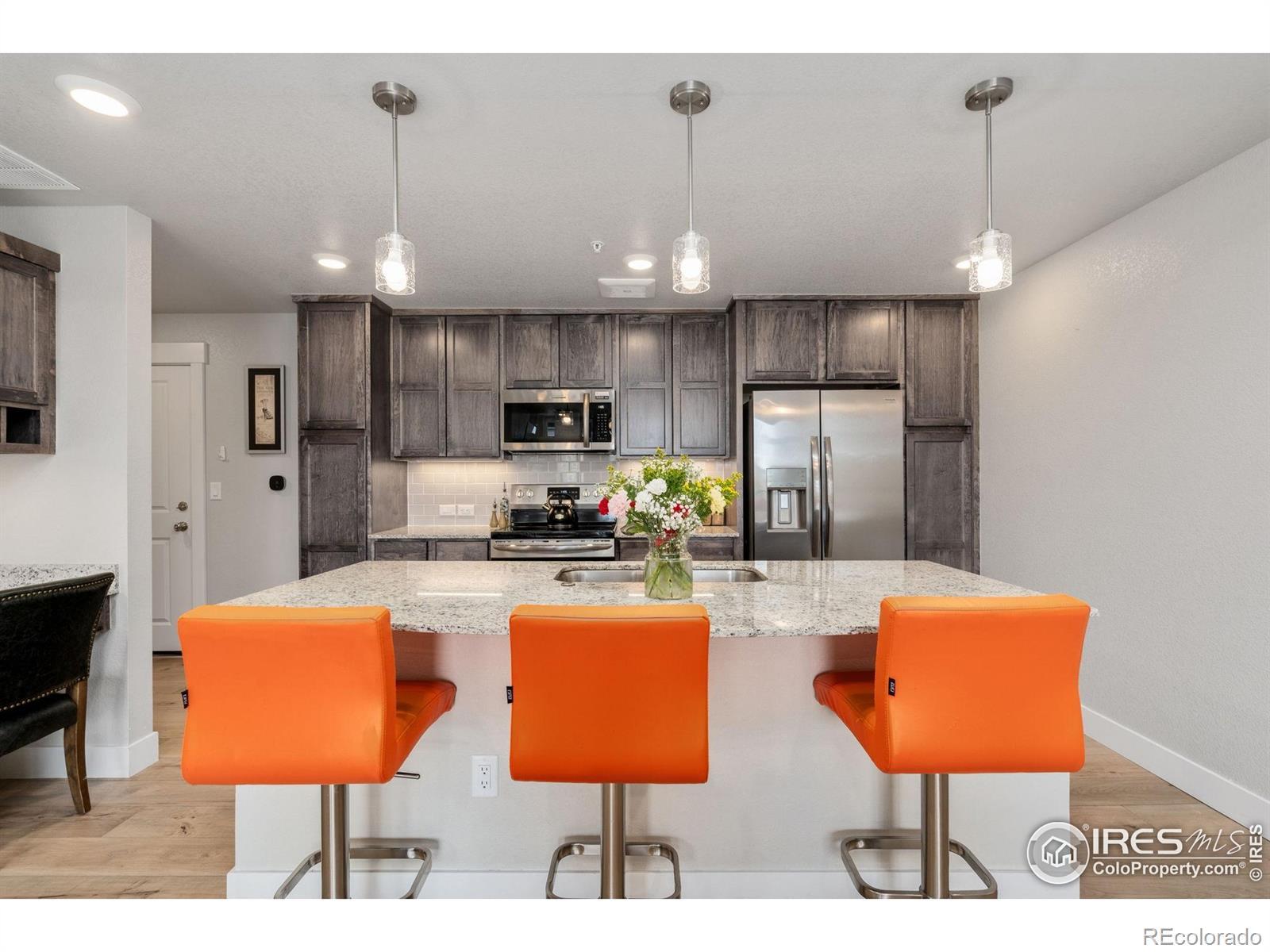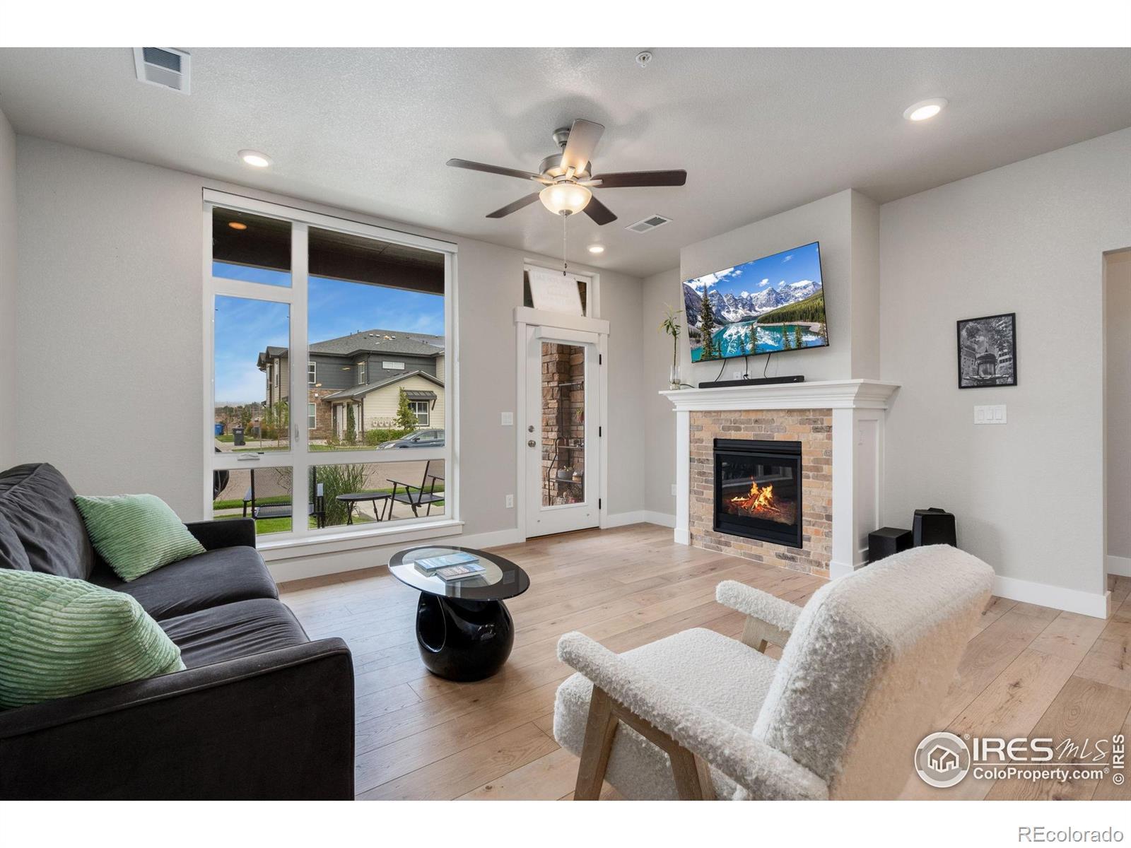 Effortless living starts here! This main-floor condo at the LEED Gold-certified Flats at Northfield offers comfort, convenience, and style in a solar-powered, low-maintenance community designed for lock-and-leave living. The unit is move-in ready and beautifully polished, offering a single-level layout with 1-bed and 1-bath, plus a bright and open main living area with LVP flooring throughout, large windows with Hunter Douglas blinds, and a fireplace centerpiece. The kitchen features stainless steel appliances and a spacious island with seating, providing plenty of space that's perfect for cooking or gathering. The bedroom comes with a walk-in closet for all your wardrobe essentials. Outdoor relaxation is made simple with a covered patio where you can sip your morning coffee or simply enjoy a bit of fresh air. The unit also comes with an oversized 1-car garage, providing extra room for storage. Future plans for the community include a private clubhouse, pool, and fitness center. Minutes away from downtown shops, restaurants, and breweries, plus quick access to CSU and scenic trails including the Poudre River Whitewater Park, this condo places you close to everything Fort Collins has to offer.