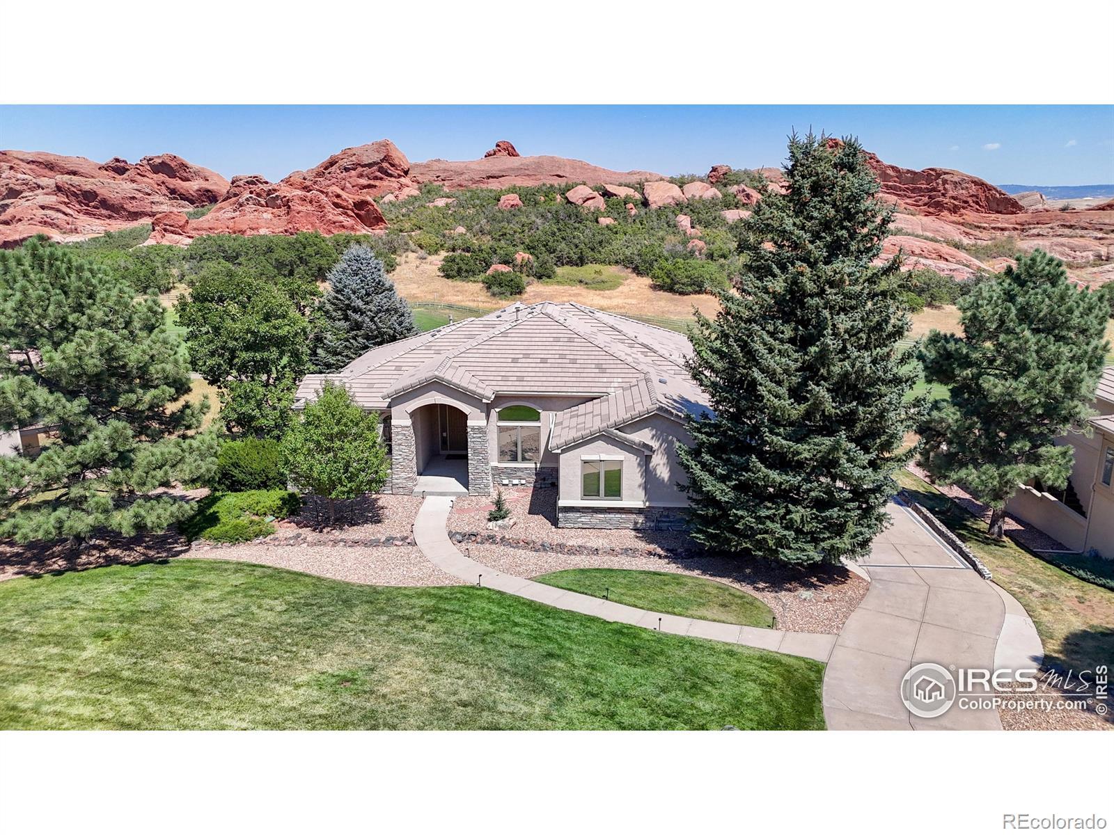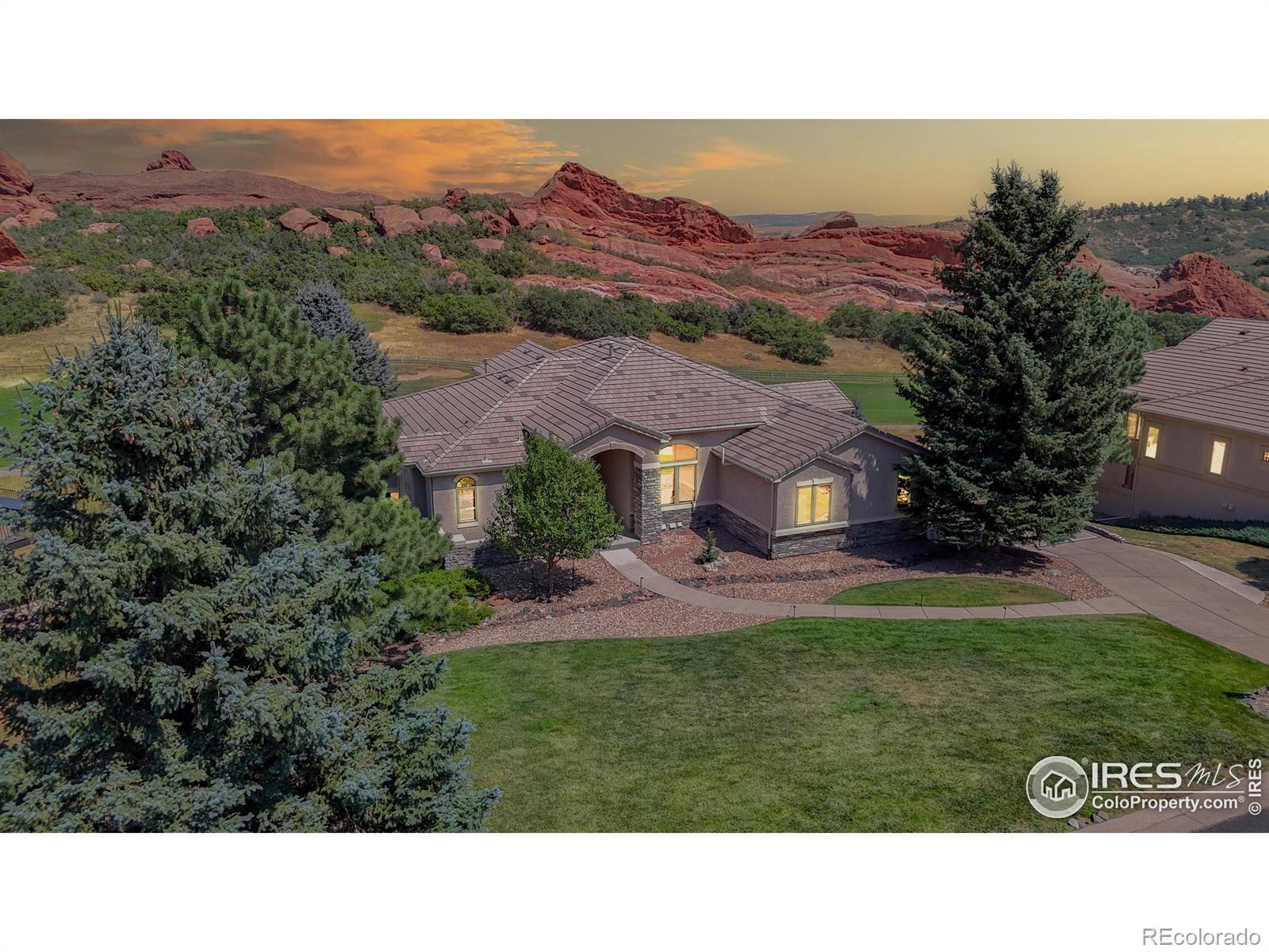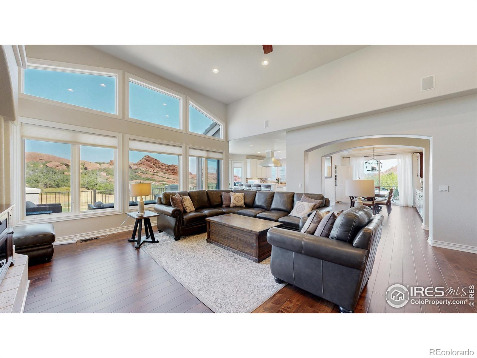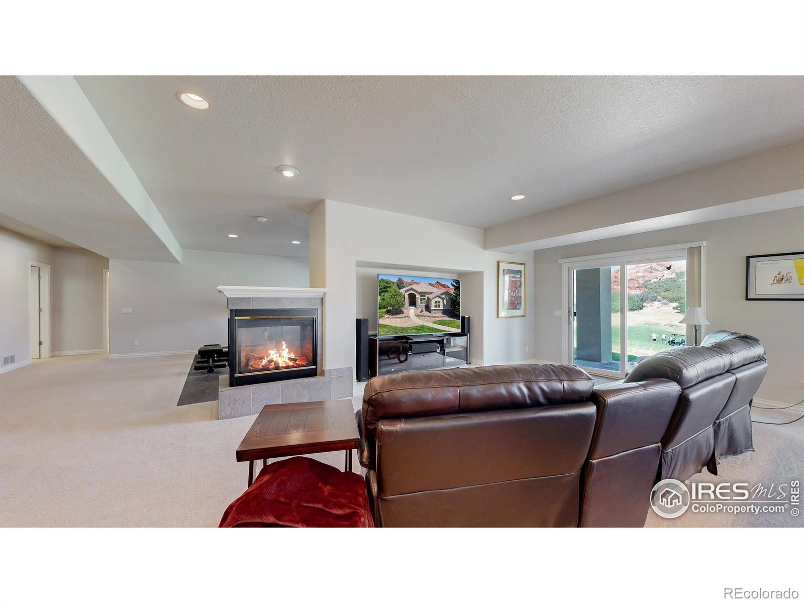 Located on the prestigious Arrowhead Golf Course, this stunning home offers breathtaking views! Step into the oversized great room featuring a cozy gas log fireplace, hand-scraped engineered hardwood floors, built-in shelving, and expansive windows that perfectly frame the scenic golf course and red rock vistas. The updated kitchen is a chef's dream, equipped with premium Thermador appliances, slab granite countertops, and a tile backsplash. Just off the kitchen, a new expanded composite deck-positioned on the east side of the home-offers a peaceful evening retreat overlooking the fairway. Entertain in style in the formal dining room, which includes a built-in sideboard with a slab granite top and elegant glass-front cabinetry. The study is outfitted with custom built-in bookshelves and large windows that fill the space with natural light. The expansive primary suite is a true sanctuary, showcasing stunning views, gas fireplace, dual walk-in closets, and a newly remodeled spa-like bathroom complete with a freestanding tub, frameless glass shower, and a heated towel bar. A newly updated guest bathroom with a quartz-topped vanity serves the main floor, along with a secondary bedroom located on the opposite side of the home-perfect for privacy-featuring its own brand-new 3/4 bath. The spacious main floor laundry room includes built-in cabinetry, a utility sink, and washer/dryer. Downstairs, the walkout level is designed for entertaining. The family/recreation room features a fully equipped wet bar with a large wine refrigerator, granite countertops, tile backsplash, and even includes the pool table and theater seating! A secondary bedroom on this level offers a great option for a home office, while a large workout/flex space provides endless possibilities. Two additional bedrooms share a beautifully remodeled full bath. There is a flagstone patio with a dry under system for those rainy days. The oversized 3-car garage provides ample space for vehicles, gear, and toys.