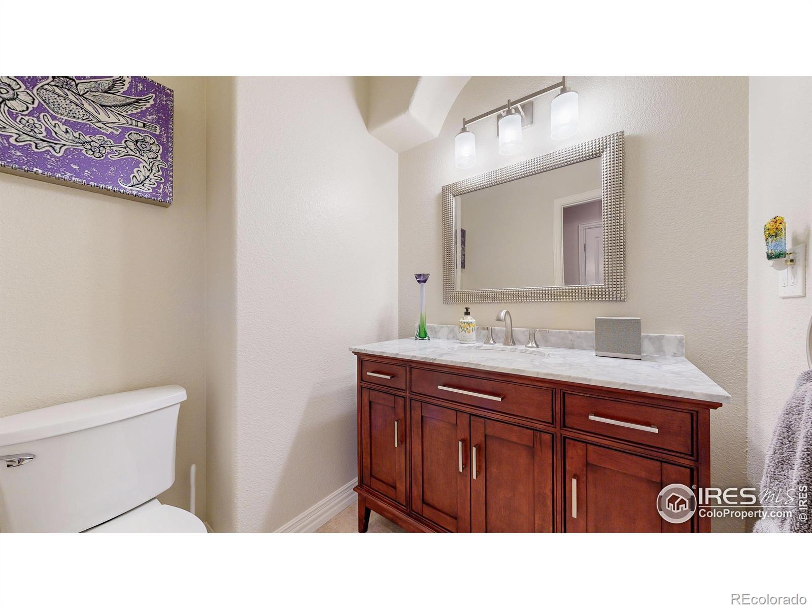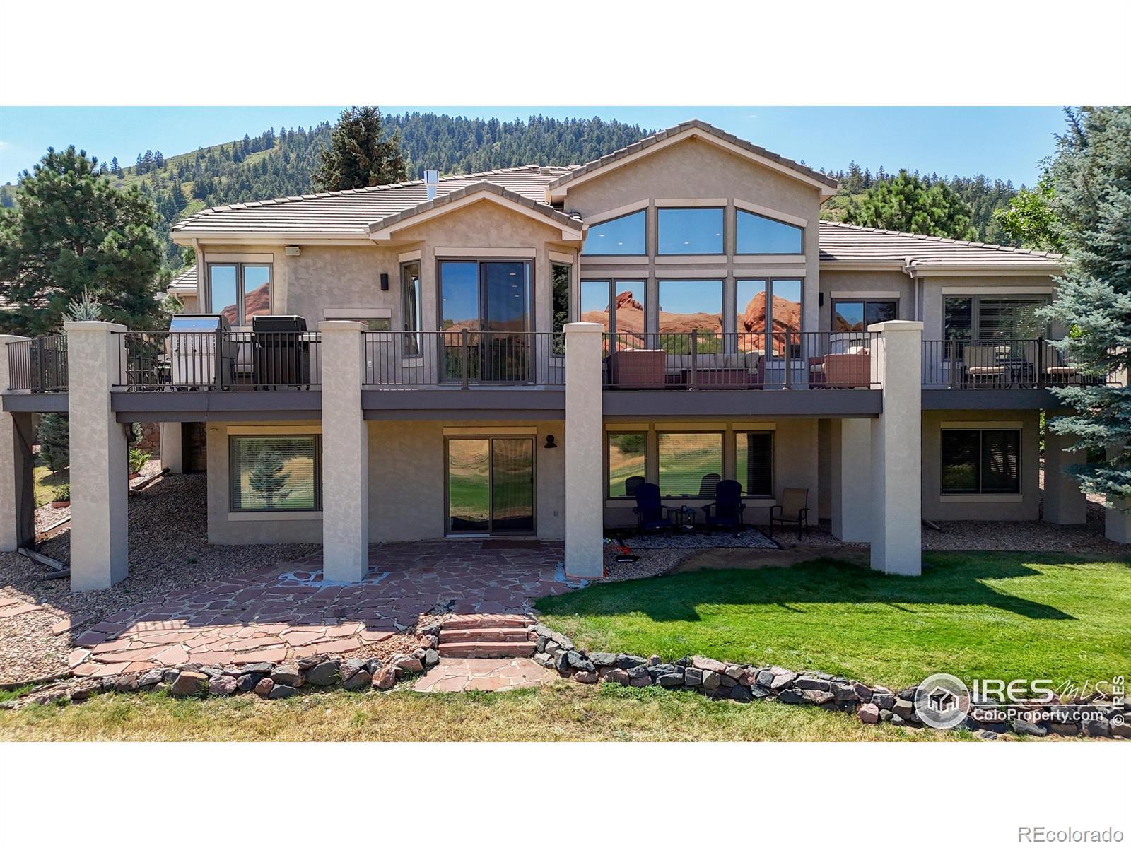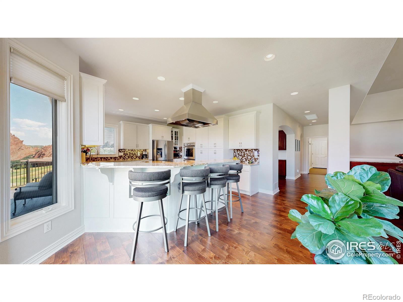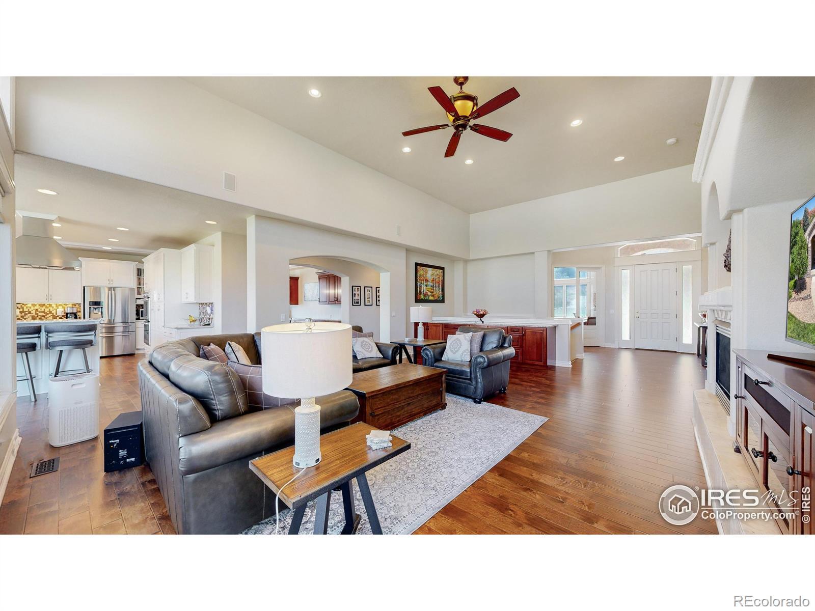 Located on the prestigious Arrowhead Golf Course, this stunning home offers breathtaking views! Step into the oversized great room featuring a cozy gas log fireplace, hand-scraped engineered hardwood floors, built-in shelving, and expansive windows that perfectly frame the scenic golf course and red rock vistas. The updated kitchen is a chef's dream, equipped with premium Thermador appliances, slab granite countertops, and a tile backsplash. Just off the kitchen, a new expanded composite deck-positioned on the east side of the home-offers a peaceful evening retreat overlooking the fairway. Entertain in style in the formal dining room, which includes a built-in sideboard with a slab granite top and elegant glass-front cabinetry. The study is outfitted with custom built-in bookshelves and large windows that fill the space with natural light. The expansive primary suite is a true sanctuary, showcasing stunning views, gas fireplace, dual walk-in closets, and a newly remodeled spa-like bathroom complete with a freestanding tub, frameless glass shower, and a heated towel bar. A newly updated guest bathroom with a quartz-topped vanity serves the main floor, along with a secondary bedroom located on the opposite side of the home-perfect for privacy-featuring its own brand-new 3/4 bath. The spacious main floor laundry room includes built-in cabinetry, a utility sink, and washer/dryer. Downstairs, the walkout level is designed for entertaining. The family/recreation room features a fully equipped wet bar with a large wine refrigerator, granite countertops, tile backsplash, and even includes the pool table and theater seating! A secondary bedroom on this level offers a great option for a home office, while a large workout/flex space provides endless possibilities. Two additional bedrooms share a beautifully remodeled full bath. There is a flagstone patio with a dry under system for those rainy days. The oversized 3-car garage provides ample space for vehicles, gear, and toys.