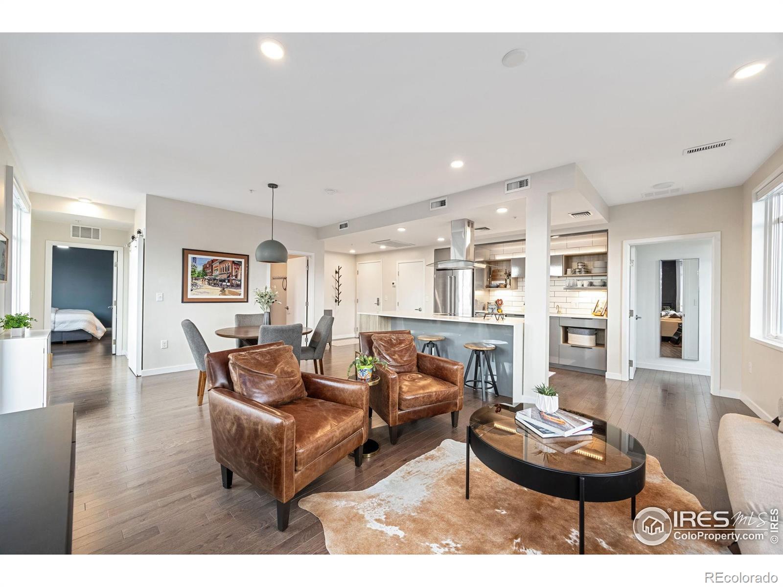 Experience upscale urban living, just a few blocks from Old Town Square. Enjoy this southwest-corner condo at Confluence with windows galore and view of the Front Range. This 2-bedroom, 2.5-bath home offers secure garage parking, elevator access, and an open, light-filled layout with hardwood floors, quartz waterfall island, stainless appliances, automatic shades, and elevated finishes throughout. The primary suite features warm wood ceilings (unique to 3rd floor units) a custom walk-in closet, and a spa-style bath. The private second bedroom includes its own bath and custom closet. The laundry room adds built-in cabinetry and pantry storage. A private patio extends your living space with stunning views, morning light, and sunset ambiance. Confluence residents enjoy a rooftop terrace with panoramic mountain views, firepit lounge, secure entry, private storage, dog wash, and bike storage, plus additional reserved parking nearby. Outside your door, explore the River District lifestyle: Woodhouse Spa, breweries, dining, and the Poudre River Trail. Modern, convenient, unforgettable Fort Collins living. Owner is a licensed Realtor in Colorado.
