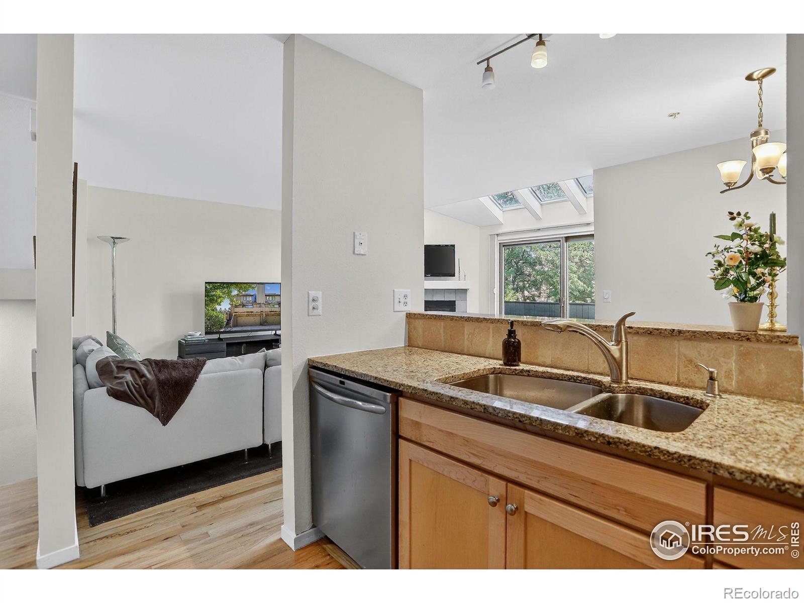 Incredible price on this beautifully updated, end-unit townhome, where privacy, comfort, and ease of living come together in perfect harmony. Nestled in a highly sought-after North Boulder community with premium amenities including pool, tennis, and pickleball courts, and spacious landscaped grounds. This sunny west-facing home offers the ideal blend of natural beauty and modern convenience. An inviting main level featuring rich wood flooring and an updated kitchen with sleek granite countertops, an induction stove, ample cabinetry, and a generous pantry. The spacious living room is the heart of the home, highlighted by vaulted ceilings with skylights, a cozy wood-burning fireplace, and an abundance of natural light. Step out onto your private terrace to unwind and take in breathtaking Colorado sunsets. Designed with privacy and flexibility in mind, the layout includes a bedroom on each level. The upstairs primary suite is a true retreat, offering captivating mountain views, dual closets, and a mini-split system in addition to central AC. The luxurious, updated bath boasts a massive walk-in shower and skylights that flood the space with natural light for a spa-like experience. Incredible location with easy access to shopping and dining amenities and Boulders' renowned trail system.