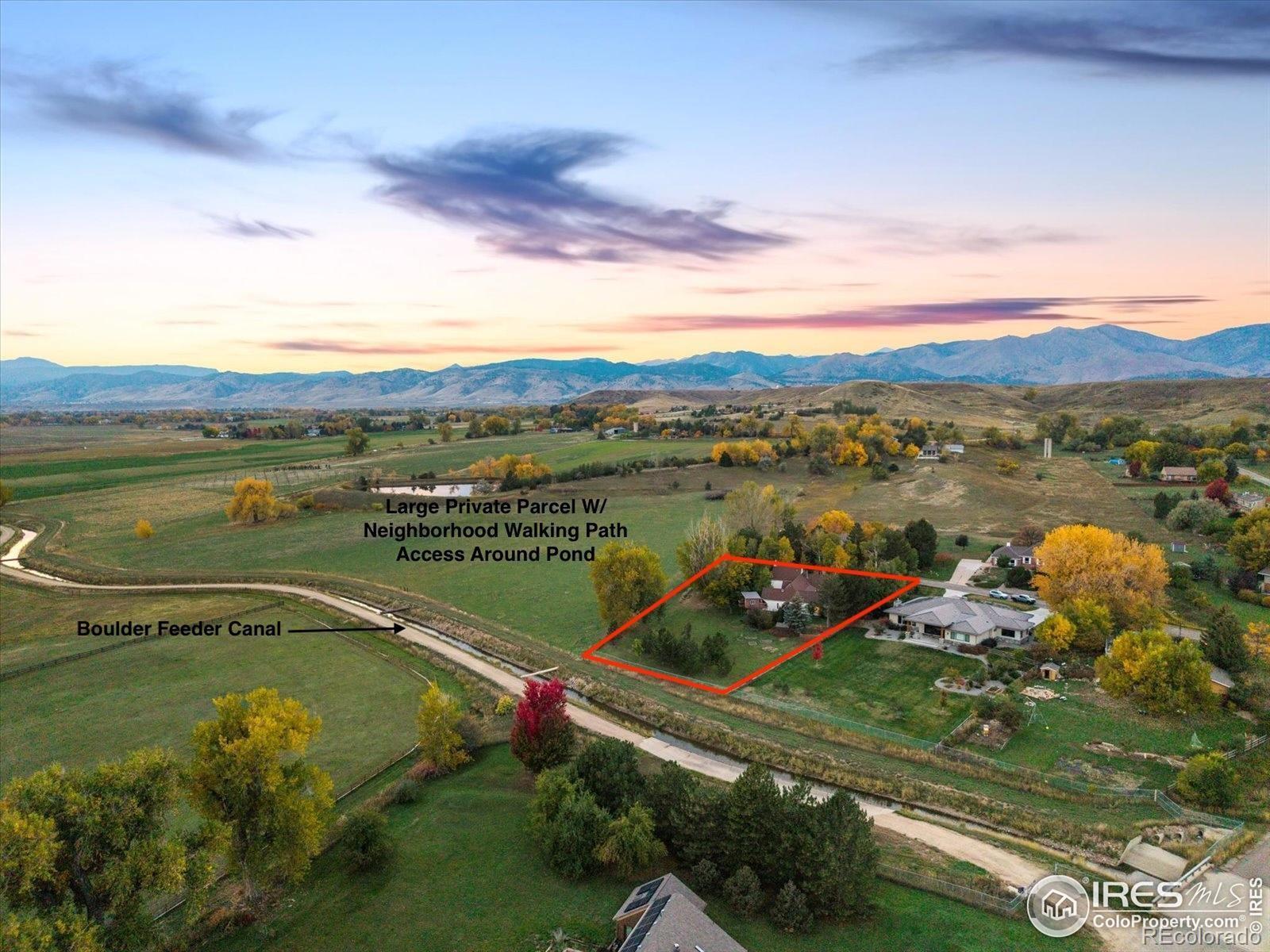 Peaceful Country Living Minutes from Boulder! Experience the perfect blend of rural tranquility and modern convenience in this beautiful Boulder Hills home, situated on approximately one acre at the end of a quiet cul-de-sac. Surrounded by mature trees and lush landscaping, the property offers exceptional privacy, breathtaking views, and timeless Colorado charm. The home backs to the Boulder Feeder Canal, creating a serene, nature-filled backdrop with abundant wildlife and open space. Enjoy panoramic views of Haystack Mountain and the Boulder Flatirons, along with incredible sunrises and sunsets from multiple rooms. The property also adjoins open land, offering access to local walking and horse trails, for an authentic country feel. Inside, large windows and cathedral ceilings fill the home with natural light. The layout includes two main-level primary suites, multiple sun rooms, and a spacious patio ideal for relaxing or entertaining. At the heart of the home is a Norwegian J tul wood-burning stove, renowned for its craftsmanship, efficiency, and cozy ambiance on cool Colorado evenings. Recent updates include fresh paint, new carpet, and stainless steel appliances. Radiant heat runs throughout for year-round comfort. The oversized garage with epoxy flooring and a half-circle driveway offers both convenience and style. Outside, mature landscaping and towering trees create a peaceful retreat, complete with a well-built tree-house that adds to the property's charm. This home is perfectly comfortable and livable as is, yet offers tremendous potential for a remodel or addition to create the ultimate Colorado retreat.Located in a quiet, highly coveted neighborhood just minutes from Coot Lake and roughly ten minutes to Niwot, Longmont, Gunbarrel, and Boulder, this property delivers true Colorado living at its best. A former Better Homes and Gardens feature, this home is as special as its setting. Come experience it for yourself.