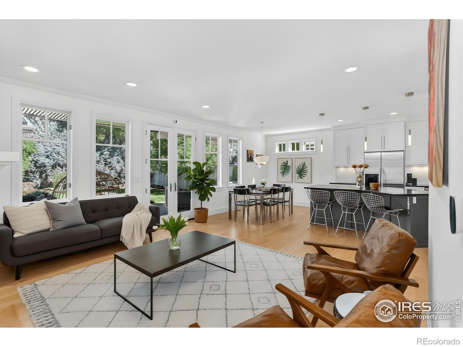 Charming Newlands Retreat. Residence that embodies timeless elegance & thoughtful design, where every detail has been curated for both beauty and function. From the inviting front porch to the newly refinished hardwood floors, light & warmth flow through a layout framed by expansive windows & a glowing gas fireplace. The chef's kitchen is a centerpiece of form & function, boasting a Viking range, KitchenAid appliances, an oversized pantry, & an island with bar seating-ideal for intimate gatherings or lively entertaining. Outdoors, a private backyard sanctuary unfolds, anchored by a soothing fountain. Upstairs, the serene primary suite features skylights, dual closets, a private terrace with mountain views, & a spa-inspired bath with jetted tub & luxe finishes. Two additional upstairs bedrooms join a flexible family/office/playroom on the main level, while the lower level offers a rec room & guest suite. A detached studio with heating & AC offers limitless versatility as an office, gym, or creative haven. What makes this home truly distinct is its fully integrated collection of artwork & furnishings-all available for the purchase and on display in home offering a rare opportunity to step into a turn-key lifestyle of curated comfort. Every canvas, sculpture, & handcrafted ceramic dishware piece has been intentionally designed and selected for the space, serving as both decorative & functional accents that elevate daily living. Modern amenities-from solar panels for net-zero living to a Resideo water leak detector & a spacious mudroom/laundry-ensure ease & peace of mind. The location is equally exceptional, situated just moments from Foothill Elementary, downtown Boulder, & an extensive network of trails & parks, all within a walkable community setting. Here, style, convenience, & Boulder's most coveted lifestyle converge into one extraordinary offering.