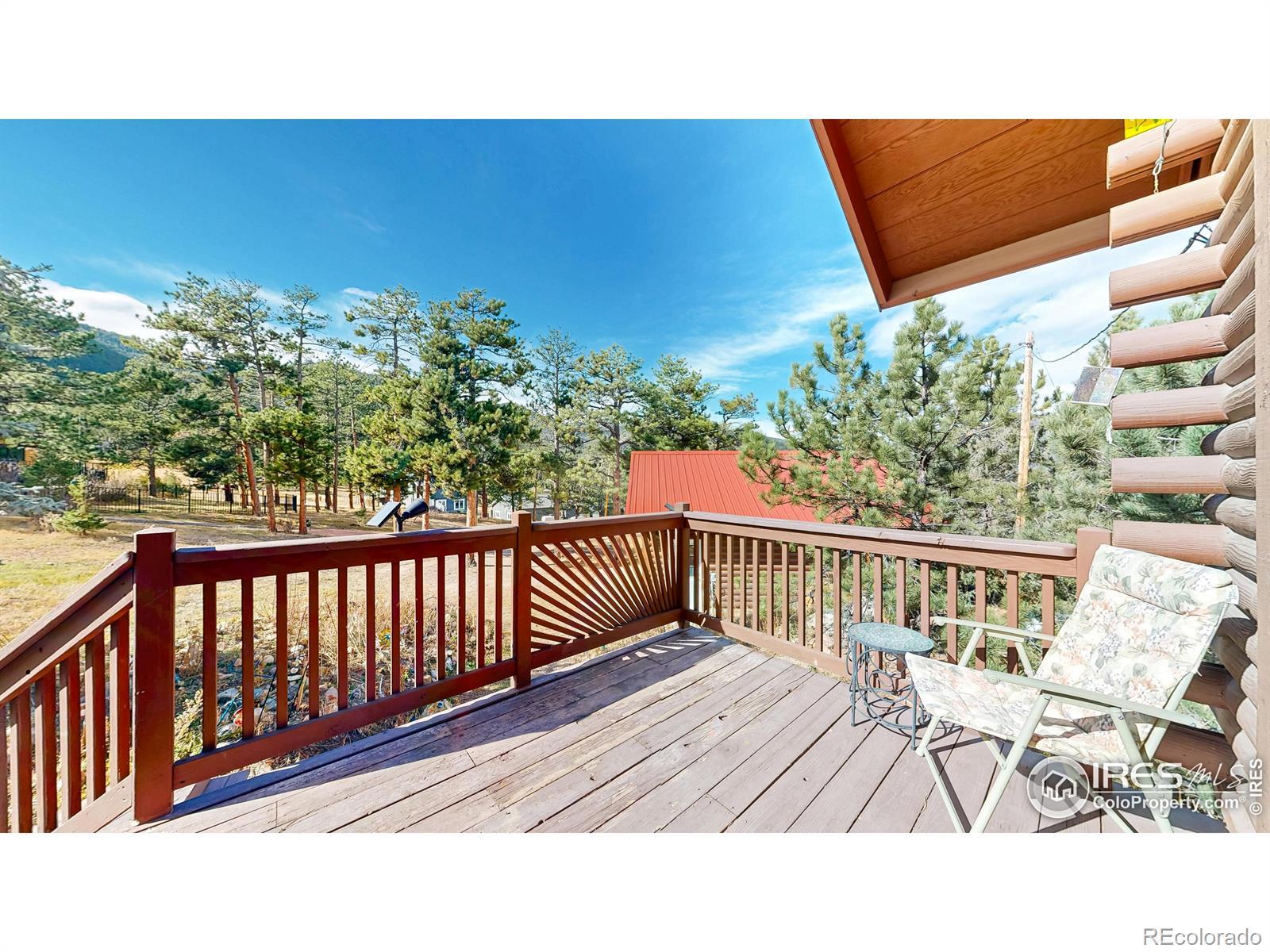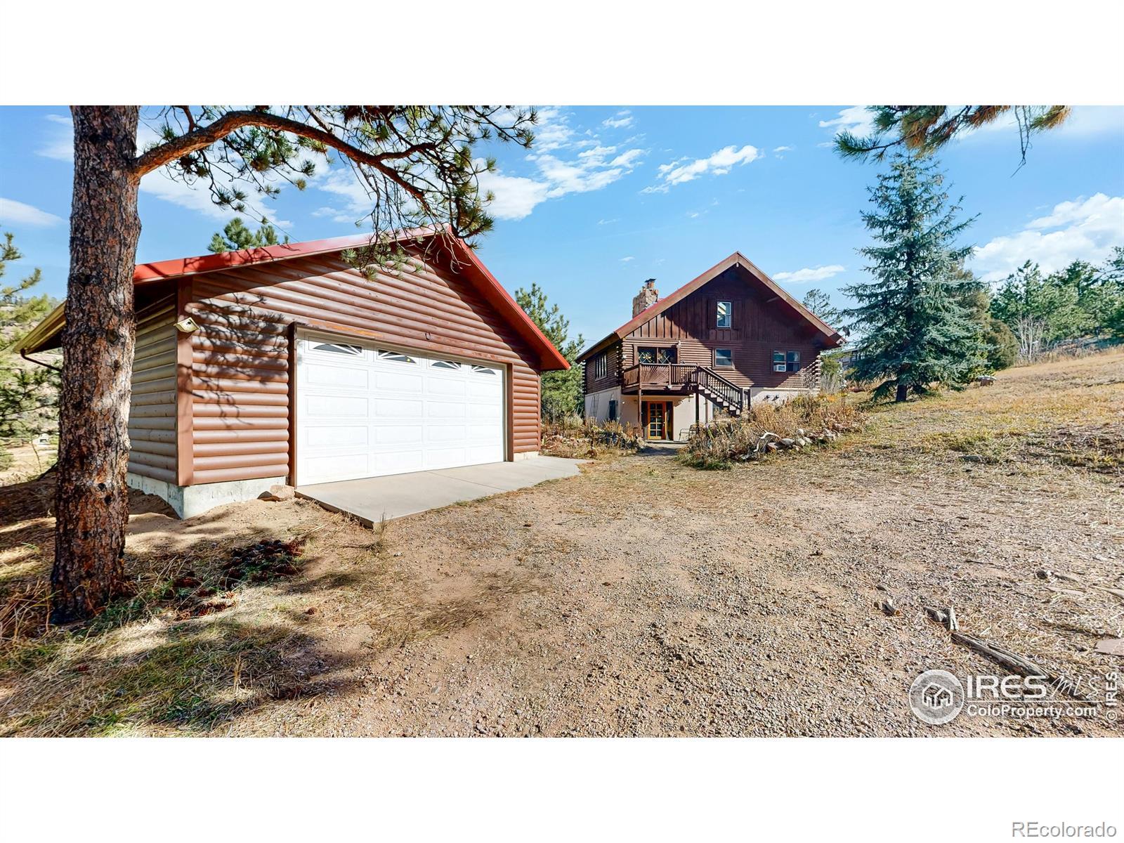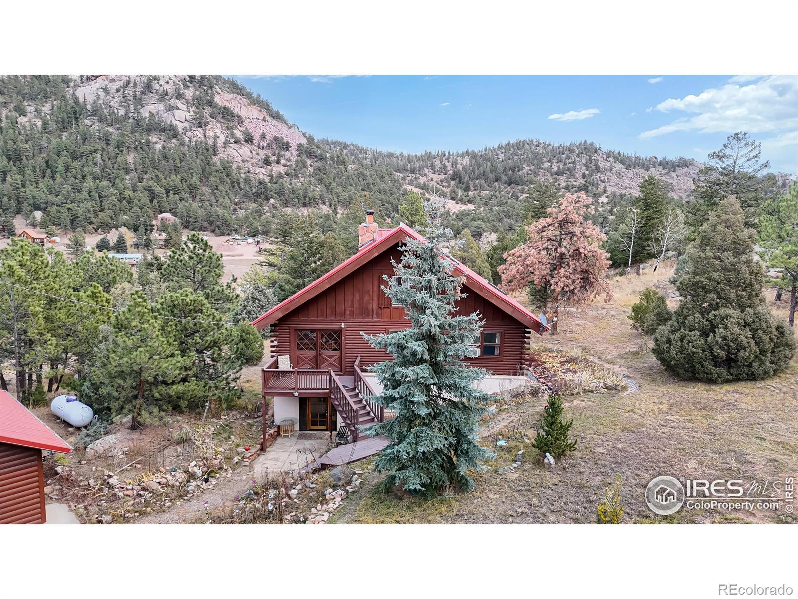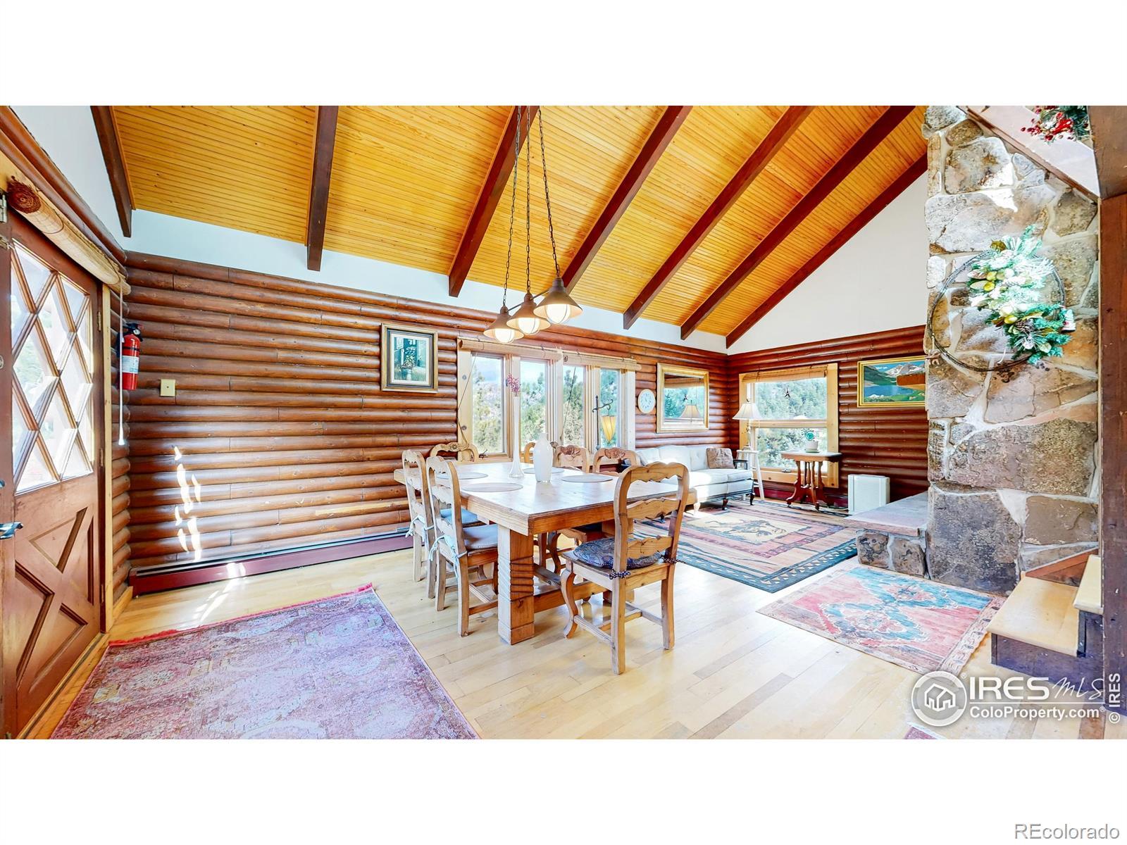Classic log home with vaulted ceilings and skylights. Open floor plan and hardwood floors. Updated kitchen. Inviting lower walkout family room with wood stove. Front and rear deck. Oversized detached garage with metal roof adds utility. District water, roads are plowed to your driveway. This home hits the sweet spot! Easy access to downtown Lyons and Estes Park. 30 minutes to Boulder.
