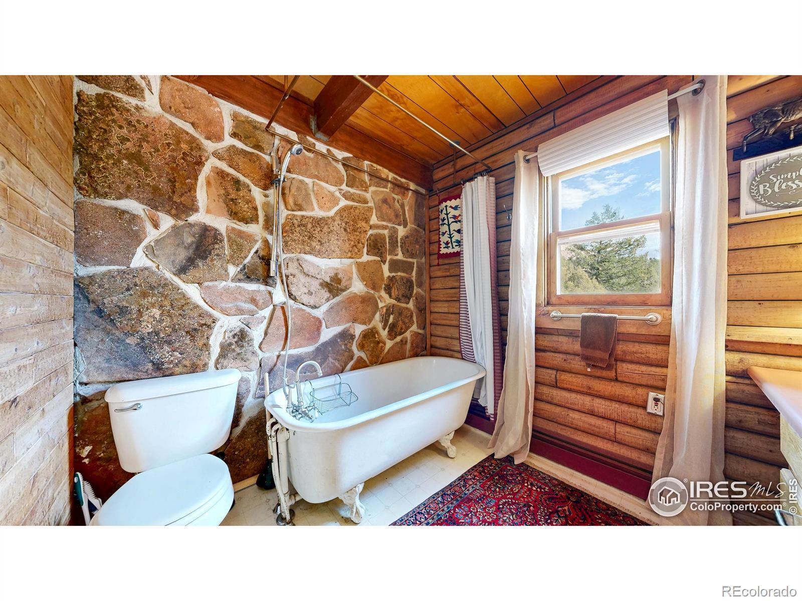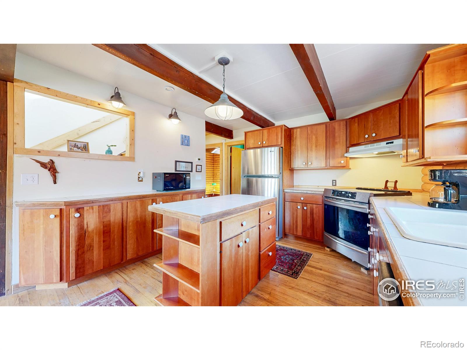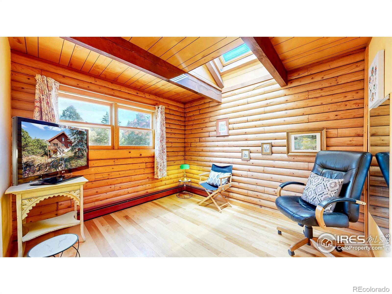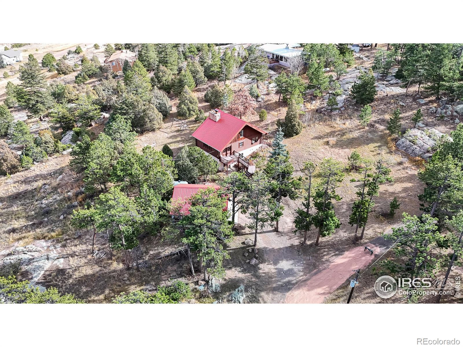 Classic log home with vaulted ceilings and skylights. Open floor plan and hardwood floors. Updated kitchen. Inviting lower walkout family room with wood stove. Front and rear deck. Oversized detached garage with metal roof adds utility. District water, roads are plowed to your driveway. This home hits the sweet spot! Easy access to downtown Lyons and Estes Park. 30 minutes to Boulder.
