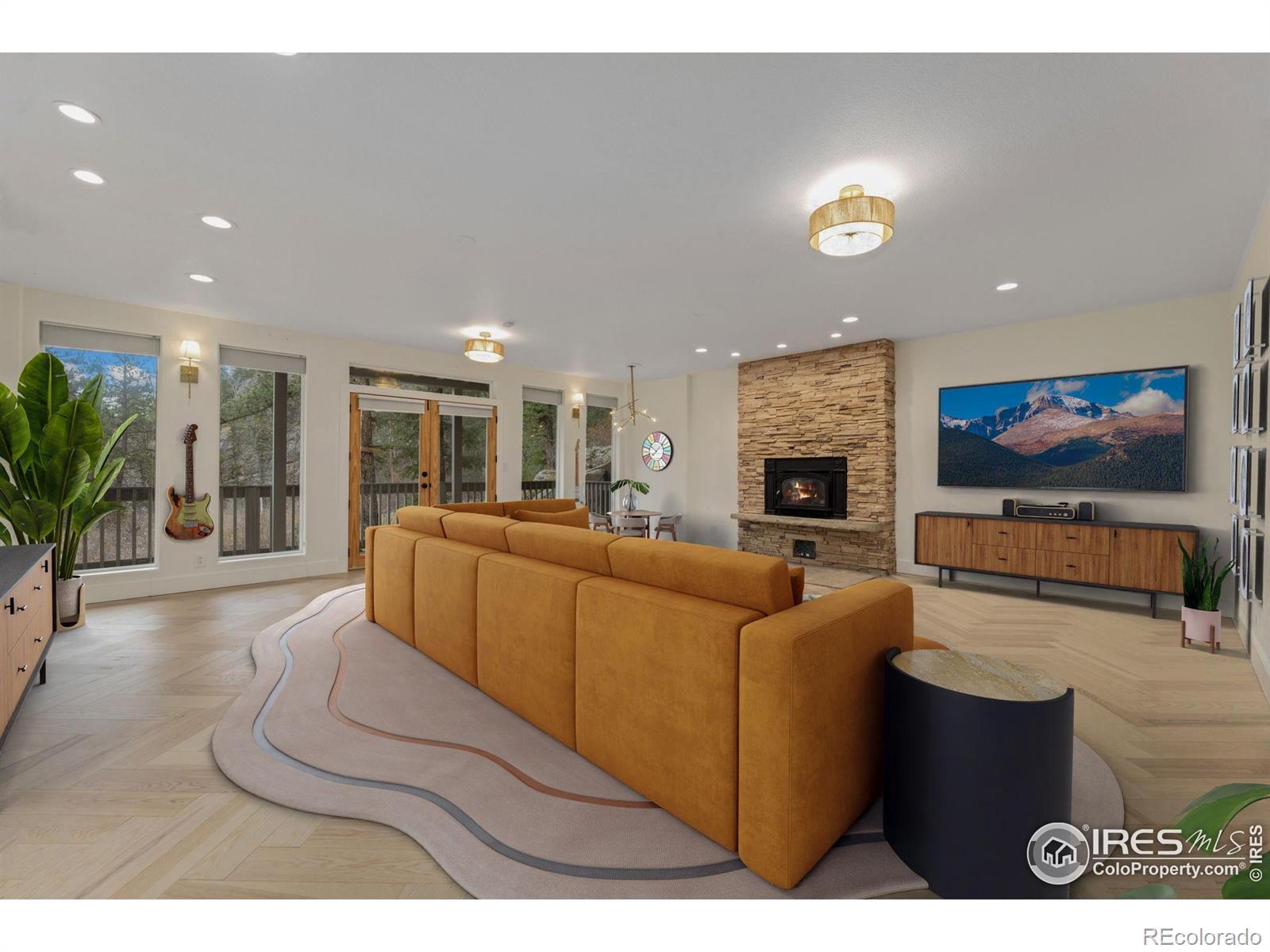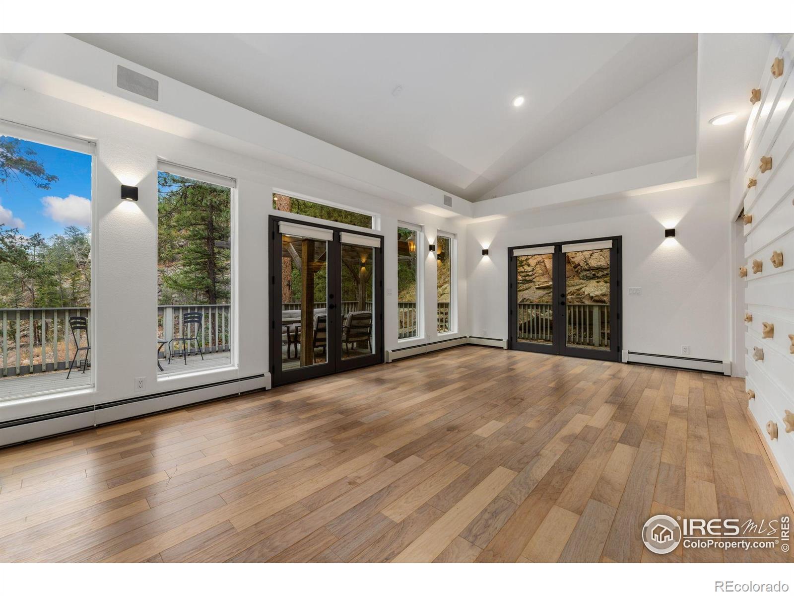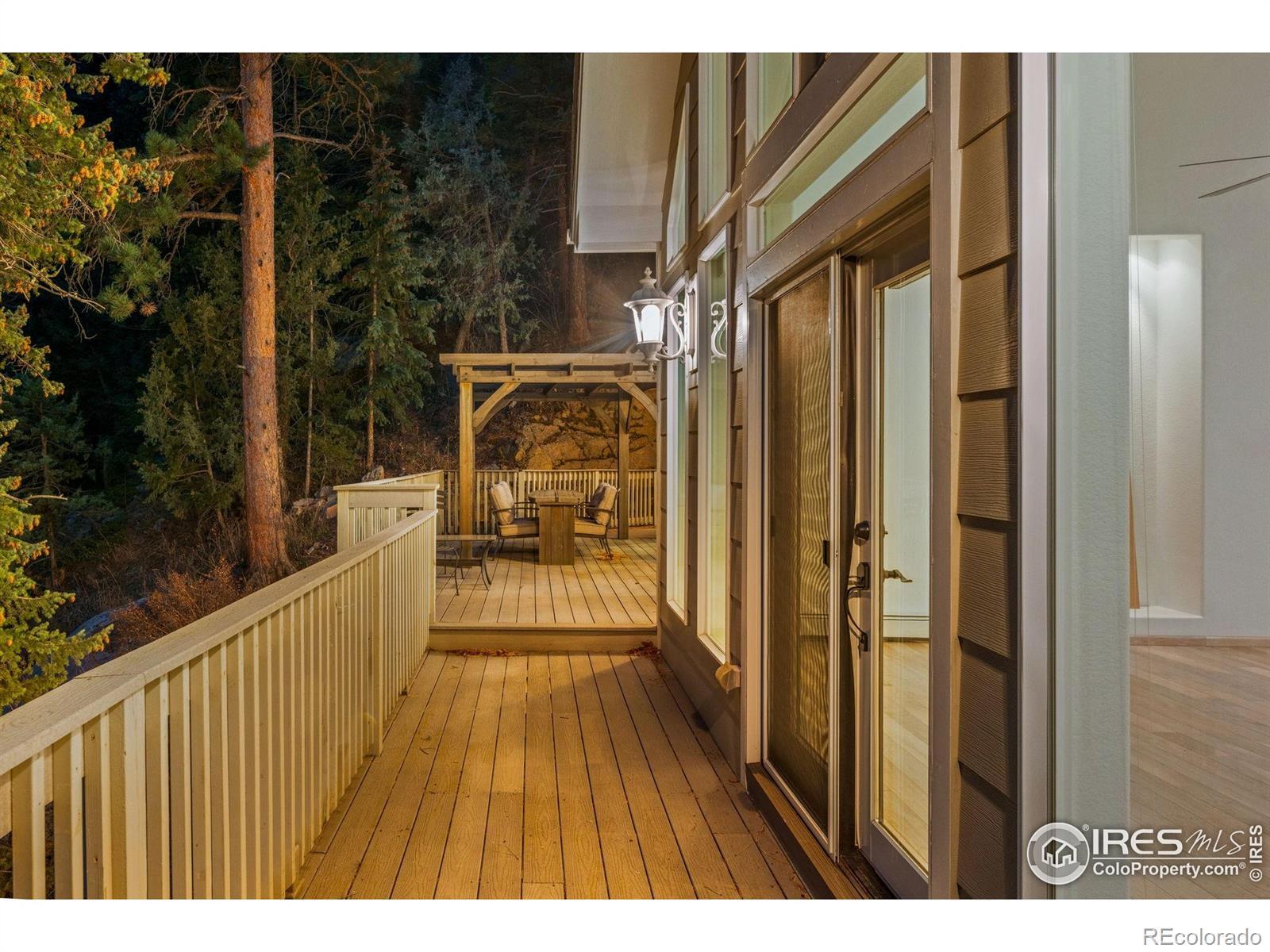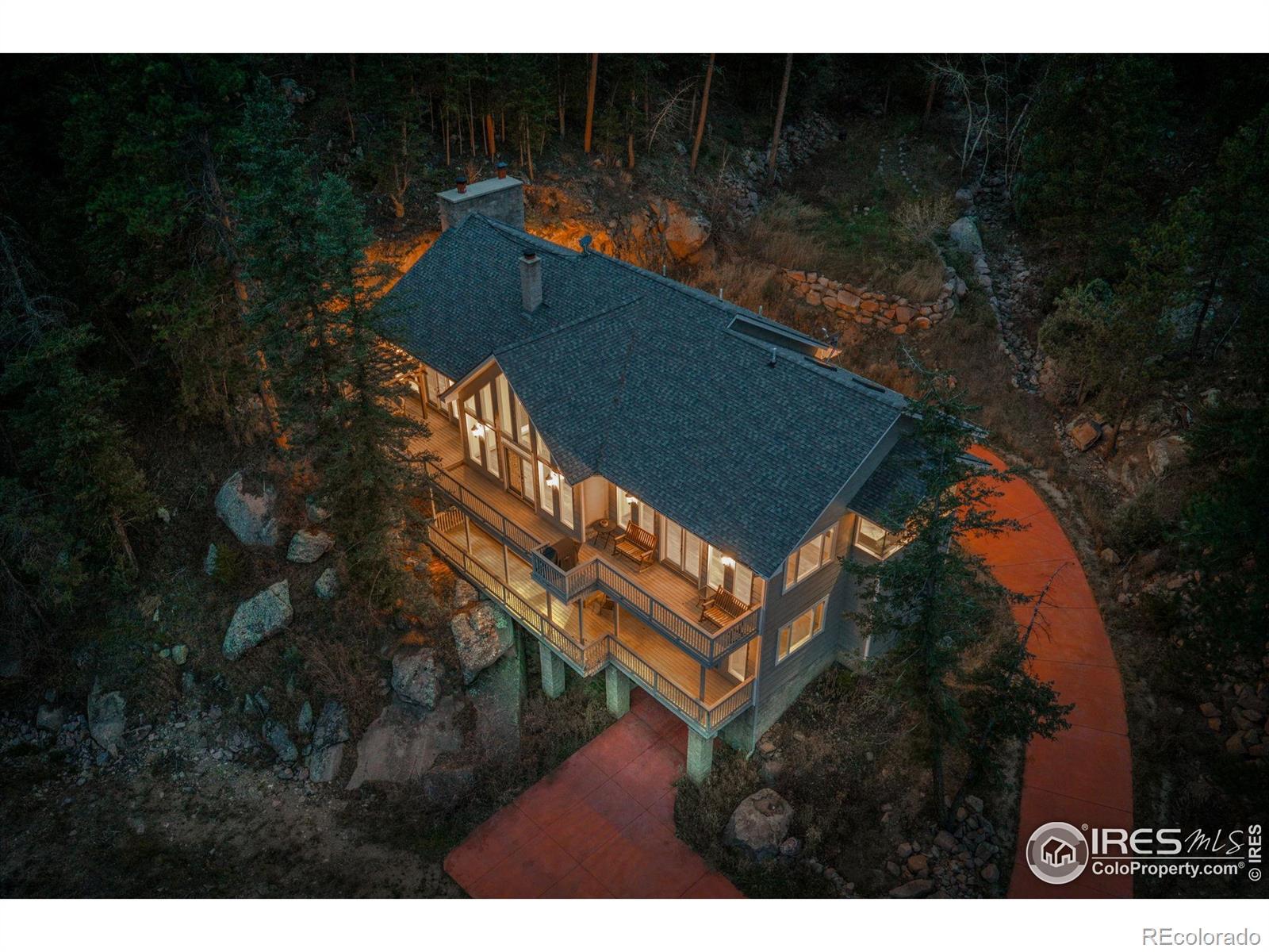 Wake up to the sound of water below and the calm of the trees around you. Set on almost 13 acres above the Little Thompson River, with a seasonal creek winding through the property, this custom home turns everyday life into a true Colorado retreat. Step out onto the decks with your morning coffee, watch birds move through the pines, and enjoy that feeling of being away from it all-without giving up convenience.Inside, the great room welcomes you with soaring ceilings, rich wood floors, and expansive windows that frame rock formations and trees from nearly every angle. The kitchen is a standout: double Wolf ovens, a large built-in GE Monogram series refrigerator and matching full-height freezer, granite countertops, and a wide wall of windows that keep the scenery in view while you cook and entertain. A thoughtfully designed dumbwaiter makes it easy to move groceries and supplies from the entry up to the main level.The primary suite feels like its own getaway, complete with a fireplace, tray ceiling detail, and an attached flex room that works beautifully as a home office, exercise space, studio, or reading room. Additional living areas and a lower level with a second kitchen and guest spaces offer plenty of flexibility for long visits, hobbies, or work-from-home options.Outside, a privacy gate at the entrance opens to a concrete driveway that crosses a custom stone bridge over the creek and leads up to the home. On nearly 13 acres, you'll find multiple wraparound decks, a pergola-lit outdoor dining area, a treehouse, and a tucked-away gathering spot above the home that's ideal for a fire pit and stargazing with friends.When you're ready to head out, you're about 1.6 miles from Pinewood Springs, 9.3 miles to Lyons, and just over 11 miles to Estes Park, giving you easy access to Front Range conveniences, local restaurants, and the gateway to Rocky Mountain National Park.