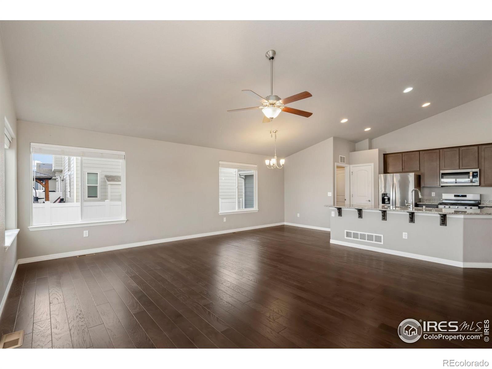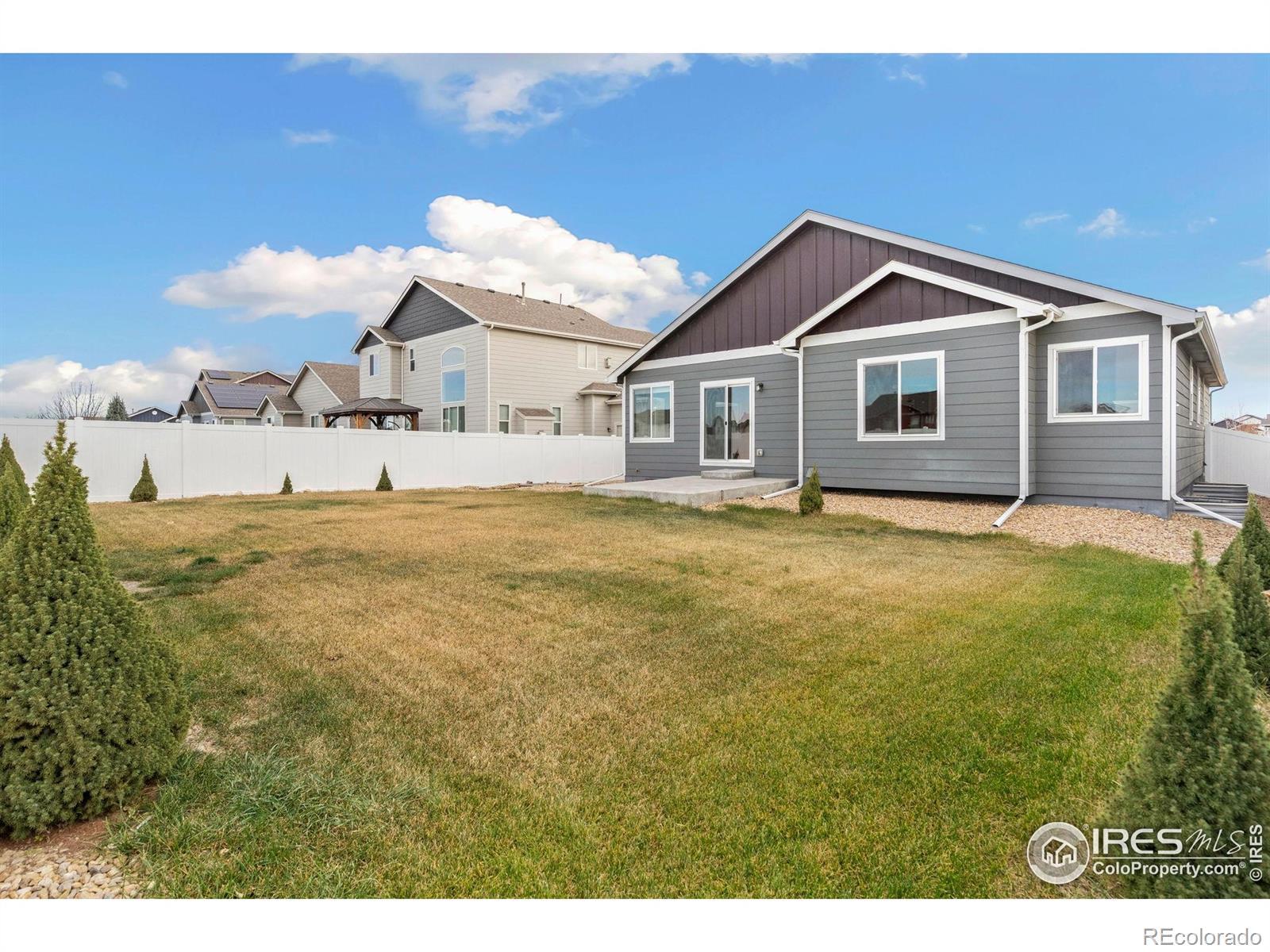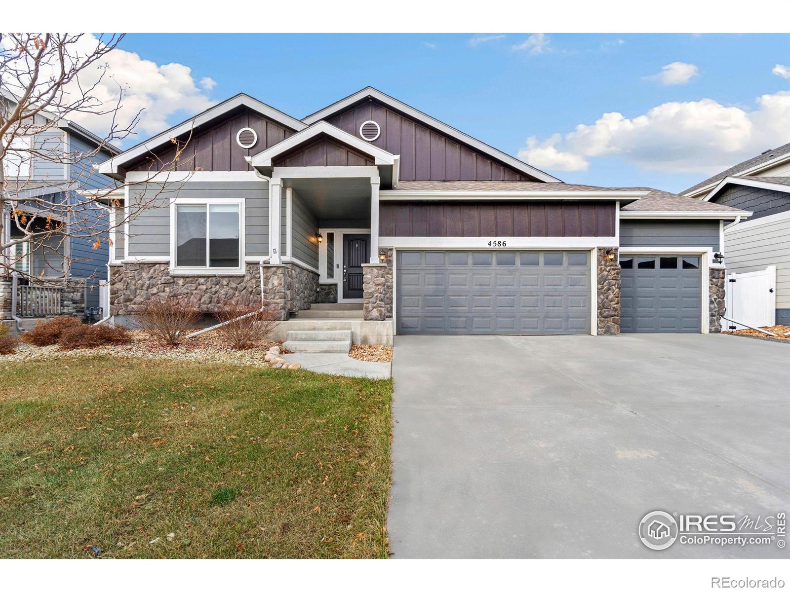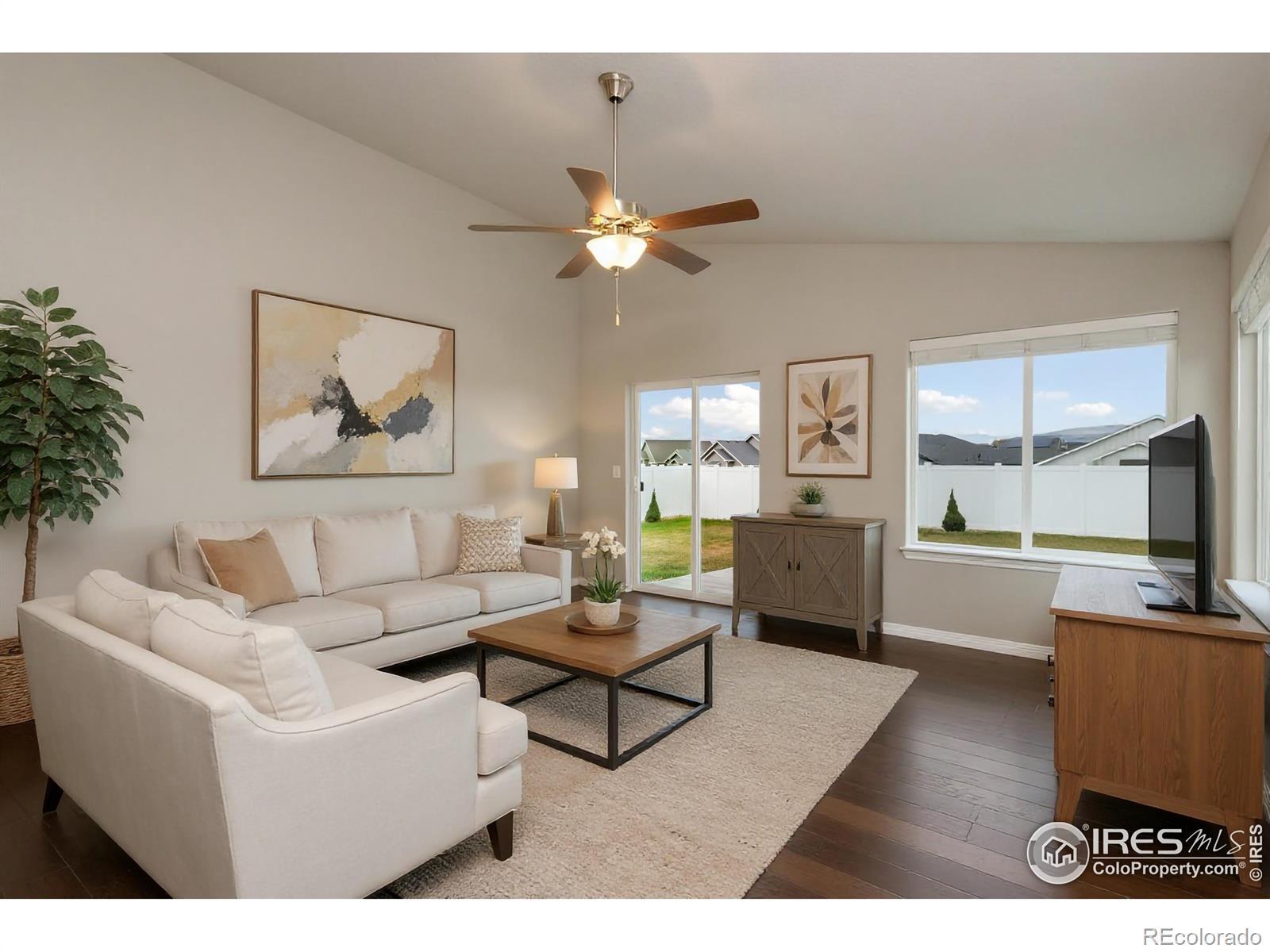 Beautifully designed ranch home the offers comfort, style, and convenience in all the right ways. This home enjoys a prime setting backing to a serene greenbelt, giving you added privacy, open space, and a natural backdrop that feels calm and inviting all year long. Step inside into a welcoming foyer that leads straight into the sun-filled main living area that features vaulted ceilings and engineered hardwood flooring throughout. The living, dining, and kitchen areas come together in one seamless layout, creating a bright gathering space that's perfect for relaxing, hosting, or simply just everyday living. The kitchen includes stainless steel appliances, granite countertops, and a center island with generous prep space for whipping up your favorite meals. Three bedrooms sit on the main floor, including a spacious primary suite featuring a 5-piece ensuite bathroom and a walk-in closet. The finished basement expands your living options even more. The large entertainment area can easily host movie nights, game days, fitness gear, or hobby spaces, while two additional bedrooms provide extra flexibility for guests or future customization. Outside, the fenced backyard adds another layer of Colorado living at its finest. A concrete patio offers a great hangout spot that is perfect for enjoying the fresh air and stunning Front Range views, complete with snow-capped mountains in the winter months. The 3-car garage and wide driveway provide all the space you need for vehicles, outdoor gear, or workshop projects. Convenience is always within reach, with a community park just minutes away and easy access to shopping and dining in Fort Collins, Timnath, and Windsor.