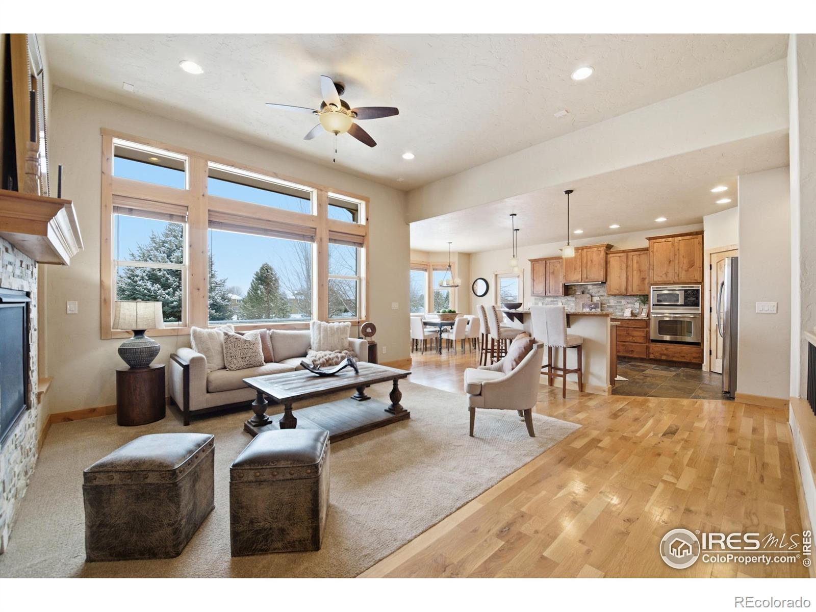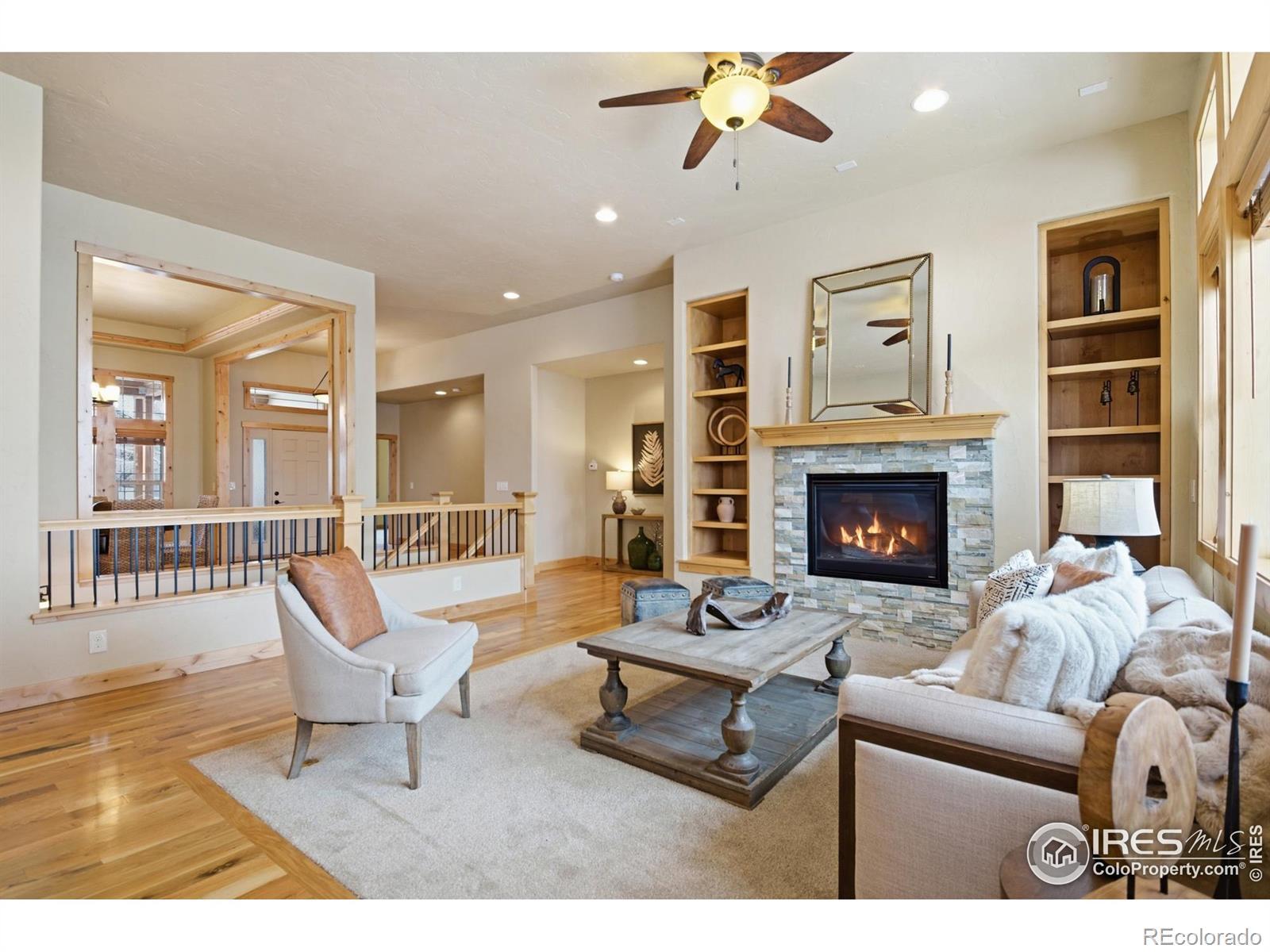 Discover elevated Colorado living in this beautifully crafted Craftsman-style ranch offering 5 bedrooms, 4 baths, and an open, light-filled floorplan designed for comfort and style. Rich hand-troweled walls and ceilings, warm alder trim and doors, and thoughtful details throughout give this home timeless character and exceptional livability.The main level showcases hardwood and tile flooring with 9' and vaulted 11' ceilings. The bright great room features a gas fireplace and beautiful built-ins, creating a warm, inviting space for gathering. The gourmet kitchen offers mission-style alder cabinetry, stainless steel appliances, a built-in gas cooktop with vented hood, wall oven and microwave, slab granite countertops, a walk-in pantry, and a butler's pantry. The casual dining area opens to a covered deck with a gas line for a grill, ideal for outdoor dining. A second deck with views backing to open space and neighboring 2-acre estate lots, and a covered front porch further enhance the home's inviting outdoor spaces. The main-floor primary suite is a true retreat with an 11' tray ceiling, walk-in closet, and a luxurious 5-piece bath featuring a soaking tub, granite countertops, and tile flooring. Two additional main-level bedrooms share a full Jack-and-Jill bath.The finished garden-level basement offers the same high-end finishes and includes an expansive family/rec room, second gas fireplace, wet bar with granite and beverage fridge, two large bedrooms, a full bath, and a generous storage room. With 8.7' ceilings and abundant natural light, it feels open and welcoming.Car enthusiasts will appreciate the oversized 3-car tandem garage with workbench and impressive 44' depth. Located on a quiet street near Coyote Gulch Open Space and playground, and the Poudre Trail, this home offers tranquility and convenience. With exceptional craftsmanship, abundant storage, and beautifully integrated indoor-outdoor living, this property is truly a standout.