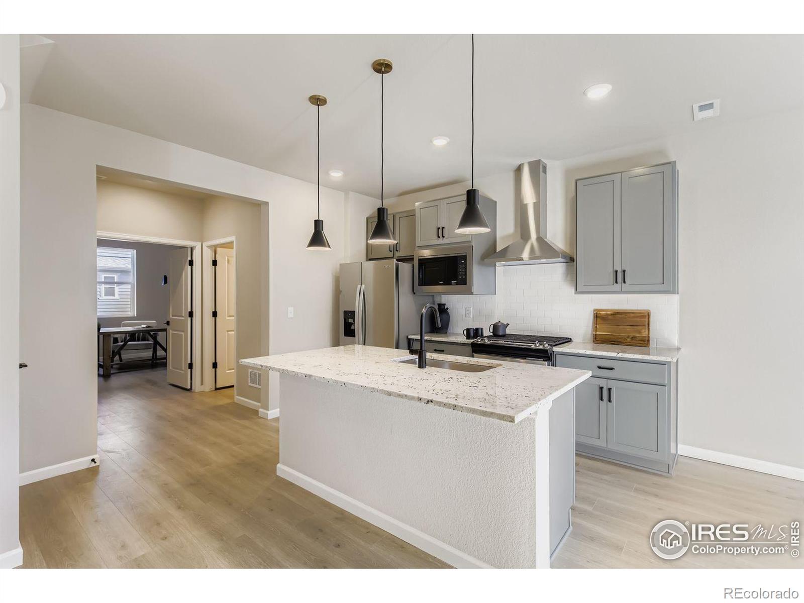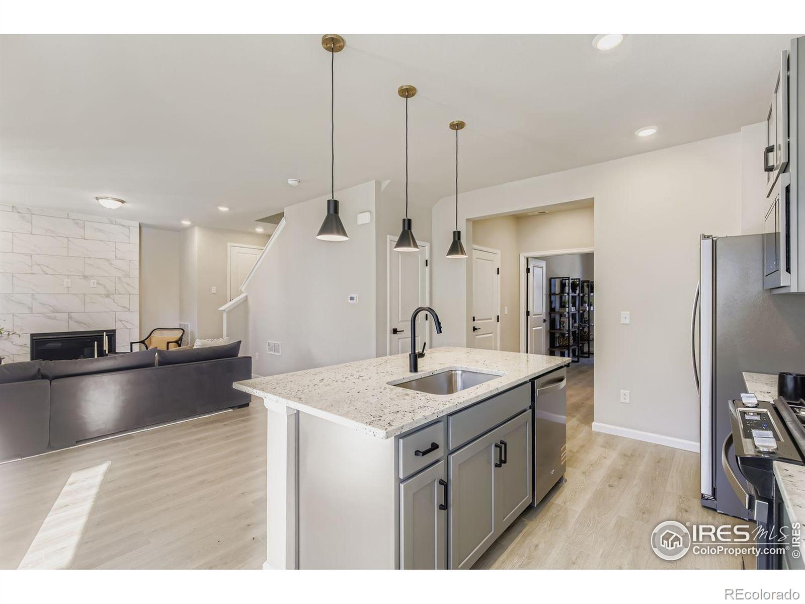 Welcome to 771 Wood Sorrel Lane! This thoughtfully designed home offers a flexible layout that blends comfort, functionality, and modern style for everyday living and entertaining. The main level features a versatile flex space that can easily serve as a fourth bedroom or private home office. An open concept family room anchors the space and centers around a cozy gas fireplace, creating a warm and inviting atmosphere. The chef inspired kitchen is designed to impress with granite countertops, soft close cabinetry, an under mount sink, a gas range with vented hood, and a wall microwave, all flowing seamlessly into the main living area. Upstairs, a spacious loft provides additional living space, perfect for a media room or play area, while a dedicated laundry room adds everyday convenience. The primary suite is a true retreat, featuring an en suite bathroom with dual sinks, a walk in shower, and an oversized closet. Additional bedrooms offer comfortable space for family or guests. Outside, enjoy a fully fenced front yard with a professionally designed blend of lush grass and low maintenance xeriscaping that enhances curb appeal while keeping upkeep simple. Located in the growing Waterfield community, residents enjoy access to scenic walking trails, planned parks and wetlands, a future dog park, and the ability to walk or bike to nearby shops, breweries, and local favorites. This Home is Move-In Ready!
