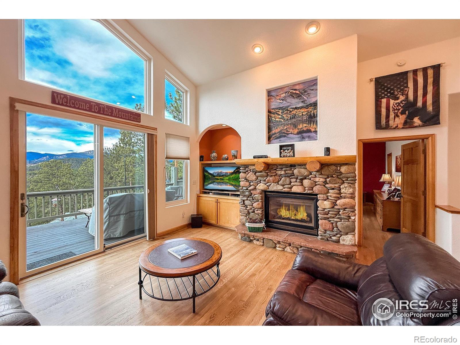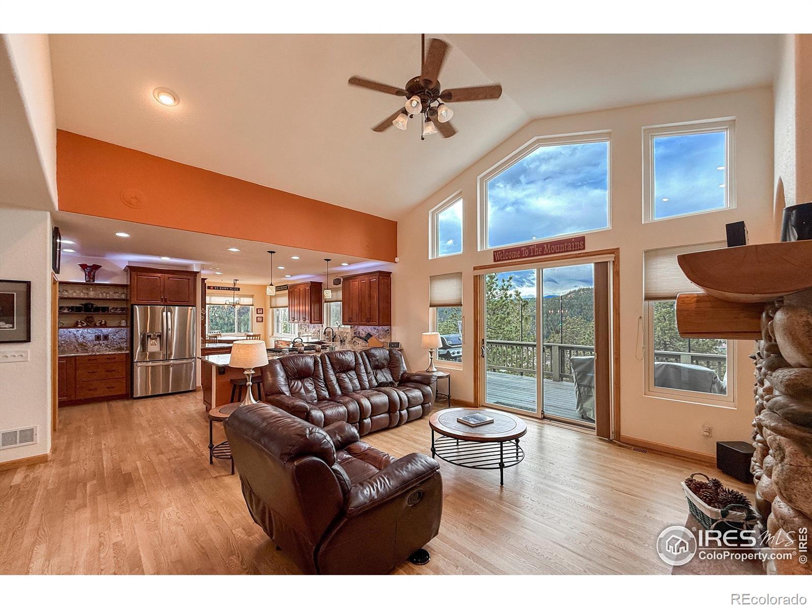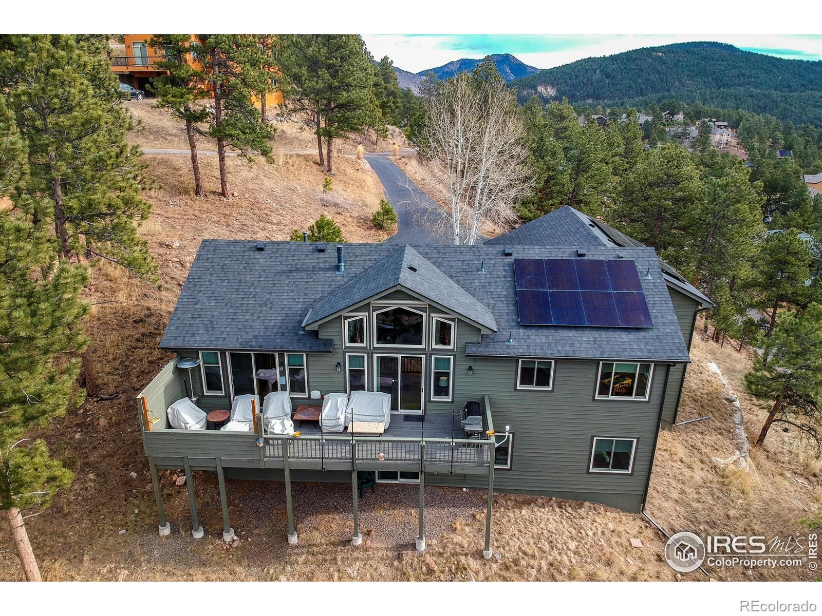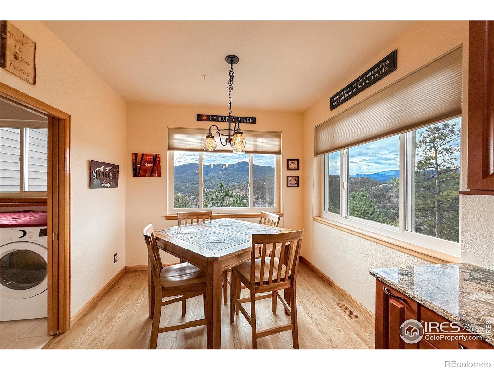 Idyllic, sun filled ranch-style home perched on an acre above the quaint town of Kittredge! This thoughtfully improved and impeccably maintained home is a rare opportunity to enjoy turnkey living in Sunset Ridge. You will be greeted by a breathtaking view of Mount Blue Sky. This beautiful 4-bedroom, 3-bath home offers spectacular mountain and valley views from nearly every angle. Refinished white oak flooring flows throughout the main living areas featuring a cozy stone fireplace in the living room and direct access to the outdoor deck. Adjacent to the spacious gourmet kitchen are both a formal dining room and eat-in kitchen nook that surrounds you with views! Convenient main floor laundry/mud room! Retreat to the primary bedroom with a 5-piece en-suite bath and expansive walk-in closet. Additionally, the walk-out basement offers tall ceilings, a versatile living room and flex space, 3 large bedrooms with ample closet space and a full bathroom. Plenty of storage in the utility room. Major system upgrades provide peace of mind, including newer roof/gutters, exterior paint and stain, UV light purified HVAC system, water treatment system, whole house generator, new windows, tankless water heater, solar (owned) and more! Just minutes to favorite restaurants-Switchback Smokehouse, Blackbird Cafe, Little Bear Saloon, and Cactus Jack's. Close to Evergreen Lake, Red Rocks, Lariat Loop, Bear Creek, and top hiking trails, this property offers privacy without seclusion.Located a short stroll from Kittredge's heart, you're near boutique shops, local restaurants, and a park. A few miles further is historic downtown Evergreen with additional conveniences, art, music, and lakeside charm. For outdoor lovers, Lair o' the Bear Park is super close by, offering endless trails, fly fishing, and more. This isn't just a home-it's a launchpad for a lifestyle blending comfort, character, and connection with Colorado's wonderful landscape, and easy commute to metropolitan Denver.