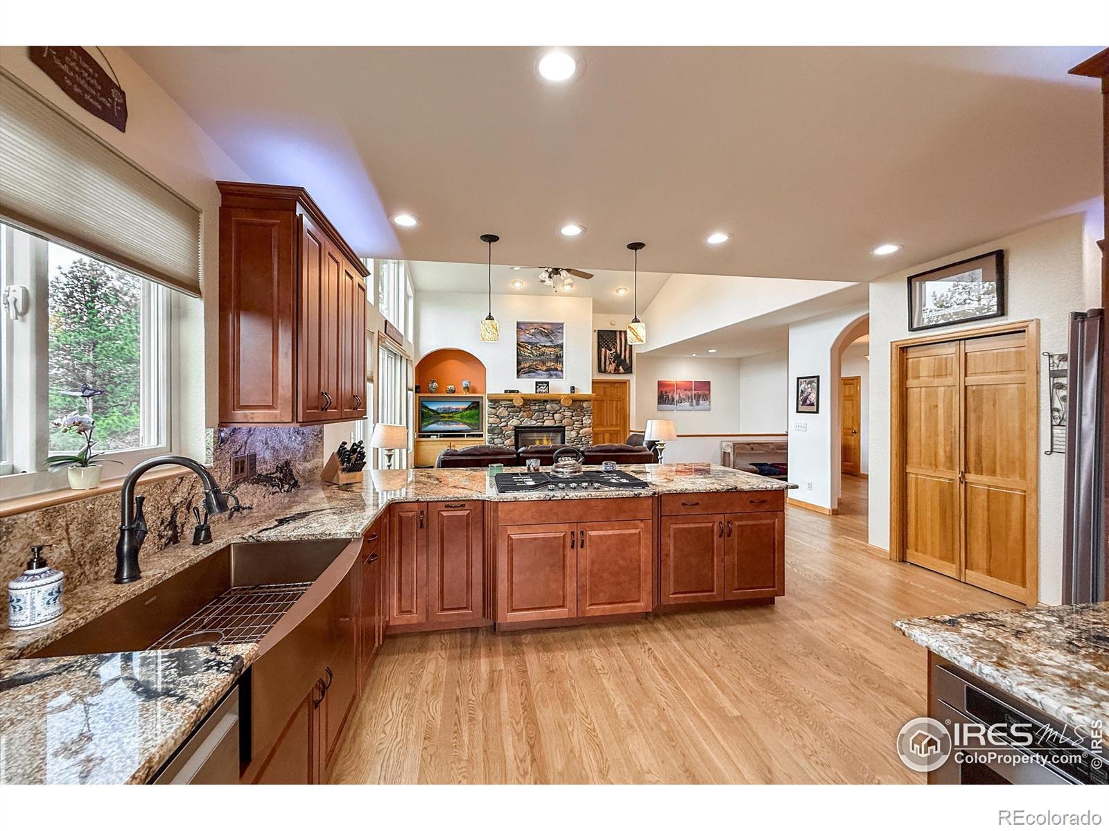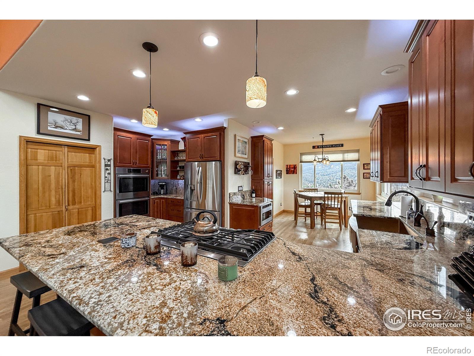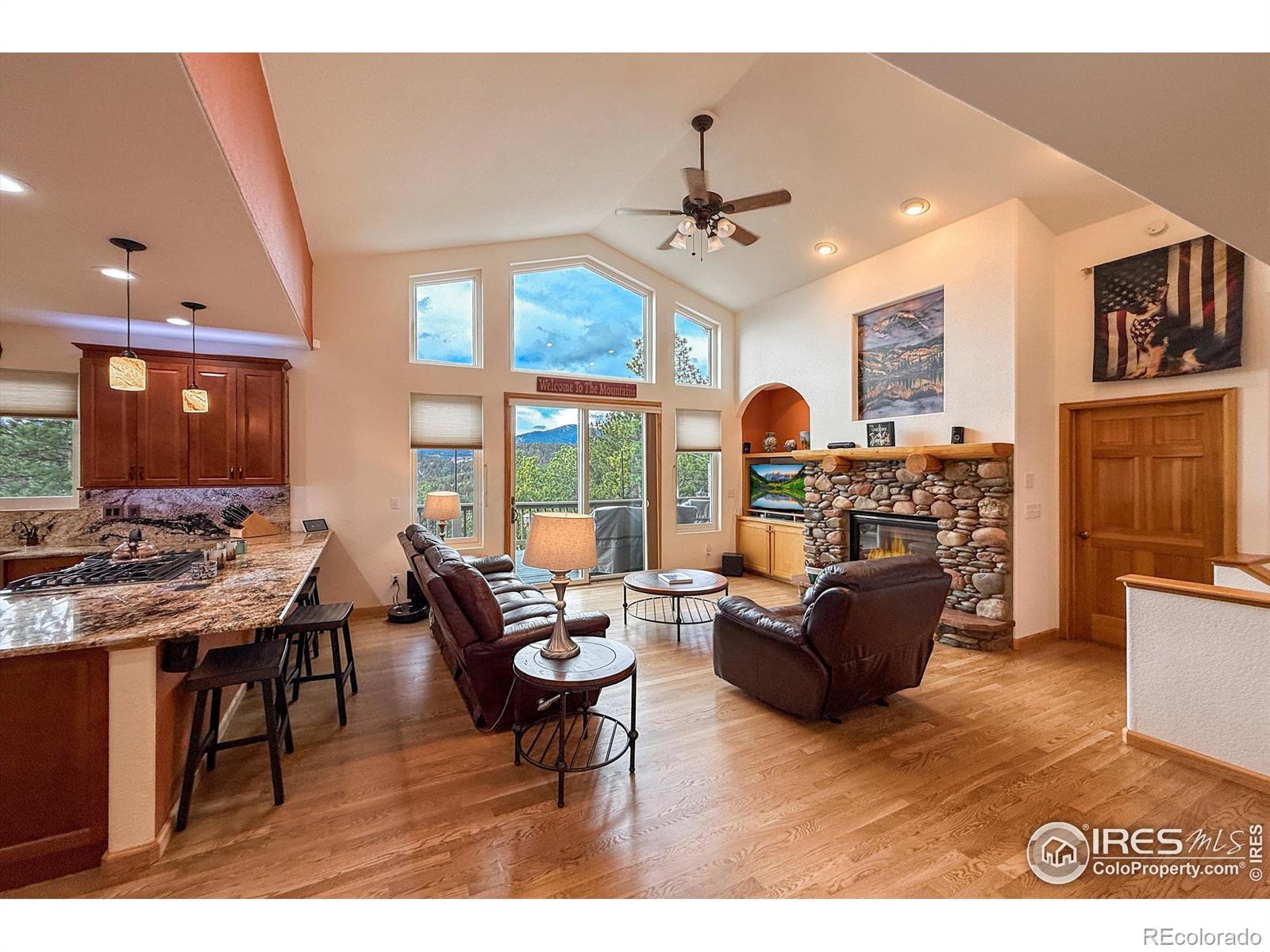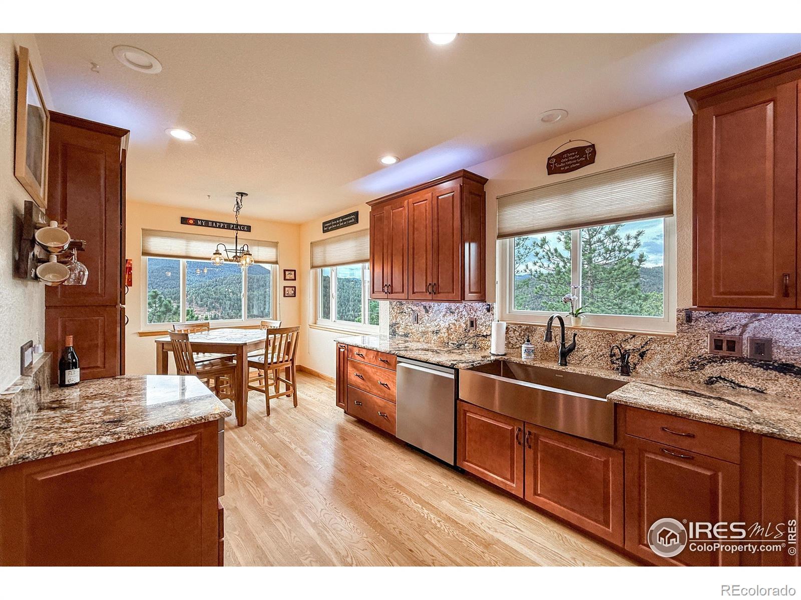 Idyllic, sun filled ranch-style home perched on an acre above the quaint town of Kittredge! This thoughtfully improved and impeccably maintained home is a rare opportunity to enjoy turnkey living in Sunset Ridge. You will be greeted by a breathtaking view of Mount Blue Sky. This beautiful 4-bedroom, 3-bath home offers spectacular mountain and valley views from nearly every angle. Refinished white oak flooring flows throughout the main living areas featuring a cozy stone fireplace in the living room and direct access to the outdoor deck. Adjacent to the spacious gourmet kitchen are both a formal dining room and eat-in kitchen nook that surrounds you with views! Convenient main floor laundry/mud room! Retreat to the primary bedroom with a 5-piece en-suite bath and expansive walk-in closet. Additionally, the walk-out basement offers tall ceilings, a versatile living room and flex space, 3 large bedrooms with ample closet space and a full bathroom. Plenty of storage in the utility room. Major system upgrades provide peace of mind, including newer roof/gutters, exterior paint and stain, UV light purified HVAC system, water treatment system, whole house generator, new windows, tankless water heater, solar (owned) and more! Just minutes to favorite restaurants-Switchback Smokehouse, Blackbird Cafe, Little Bear Saloon, and Cactus Jack's. Close to Evergreen Lake, Red Rocks, Lariat Loop, Bear Creek, and top hiking trails, this property offers privacy without seclusion.Located a short stroll from Kittredge's heart, you're near boutique shops, local restaurants, and a park. A few miles further is historic downtown Evergreen with additional conveniences, art, music, and lakeside charm. For outdoor lovers, Lair o' the Bear Park is super close by, offering endless trails, fly fishing, and more. This isn't just a home-it's a launchpad for a lifestyle blending comfort, character, and connection with Colorado's wonderful landscape, and easy commute to metropolitan Denver.