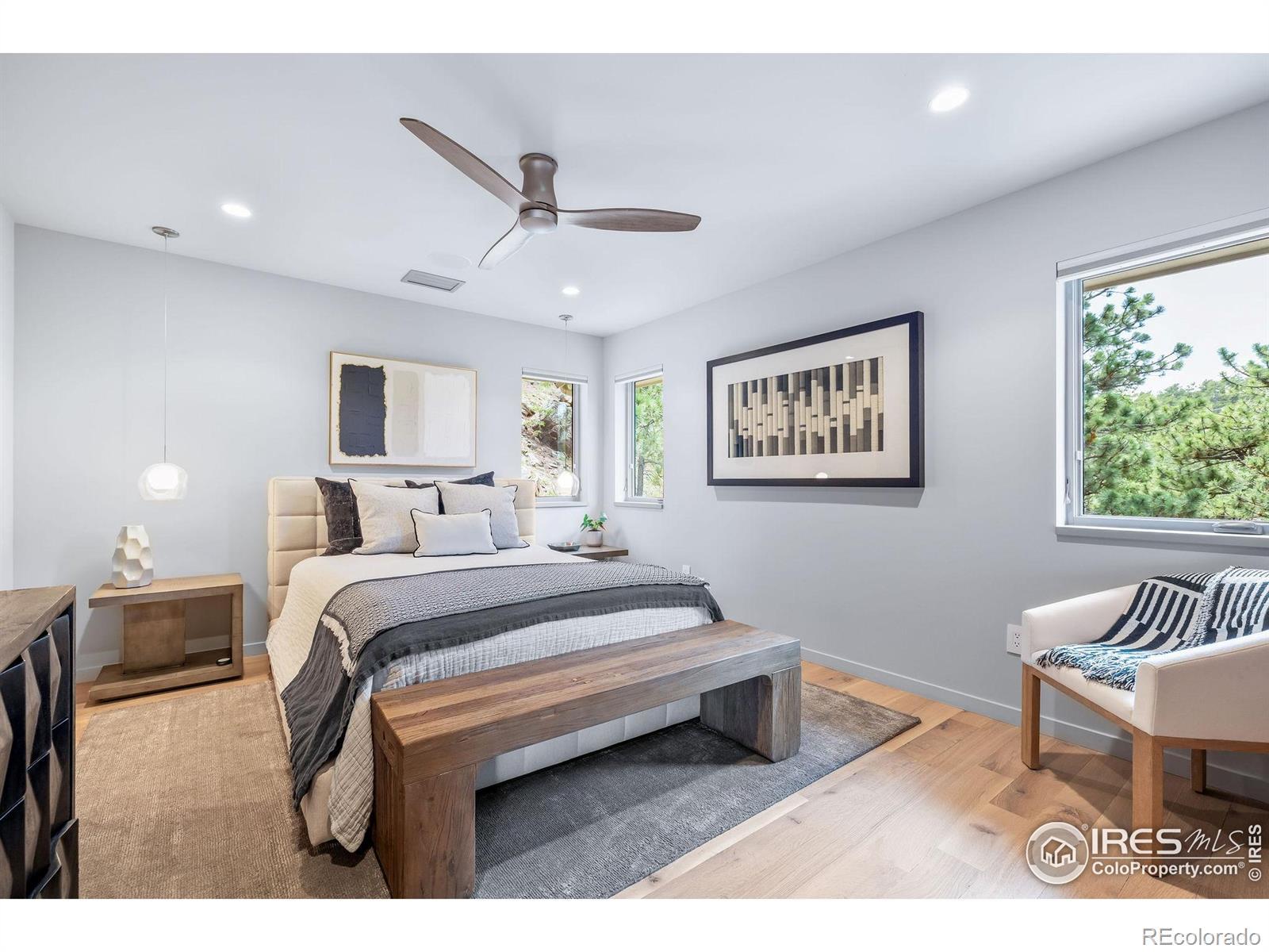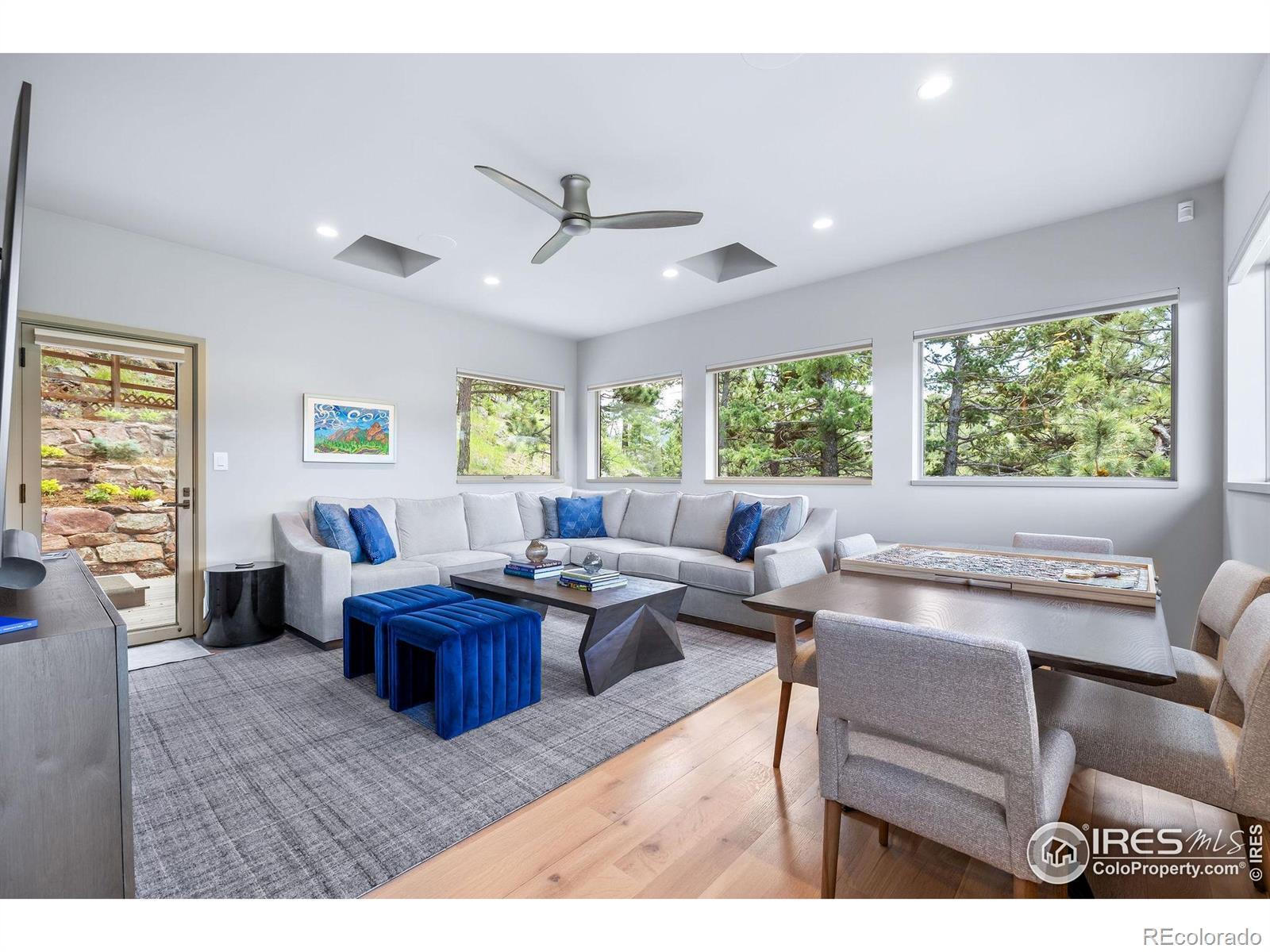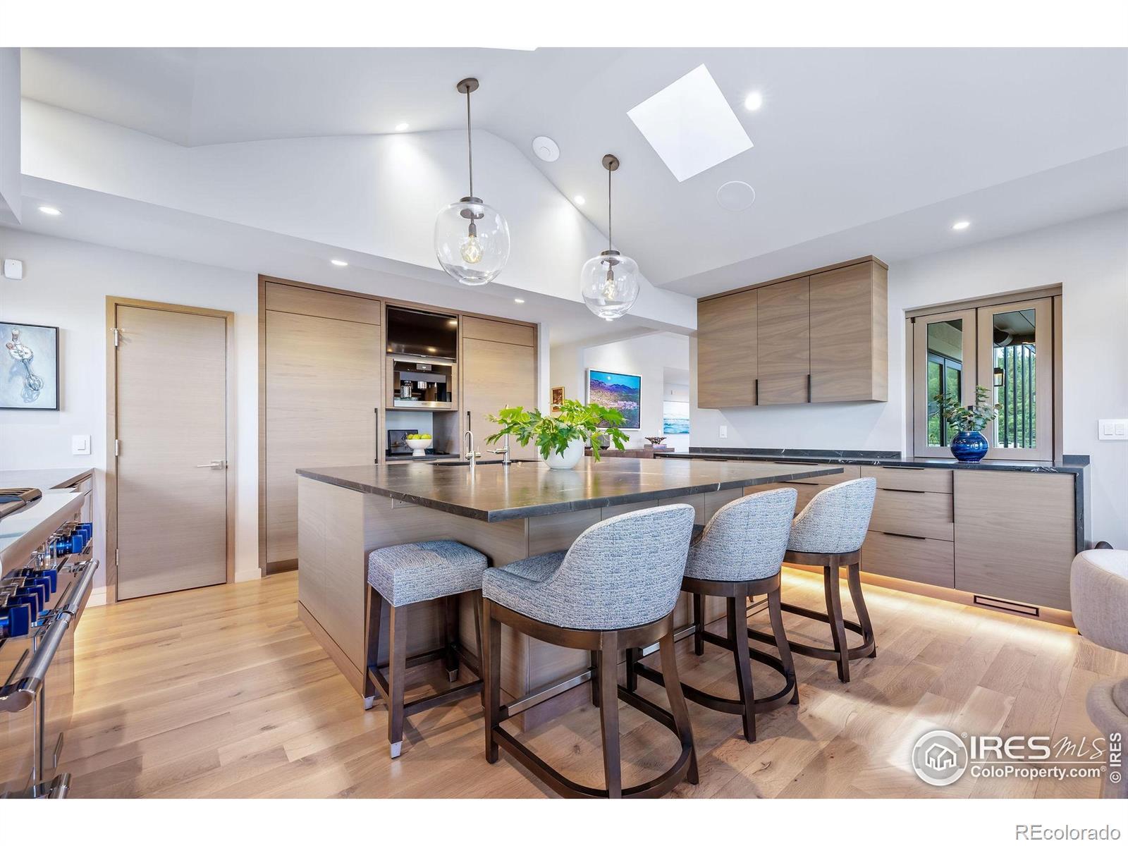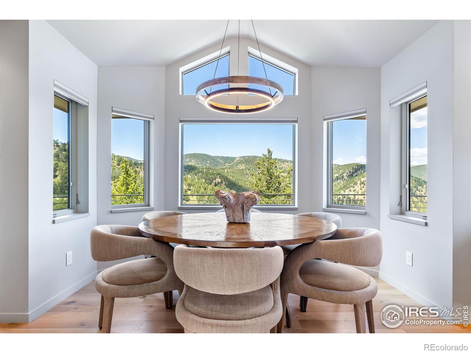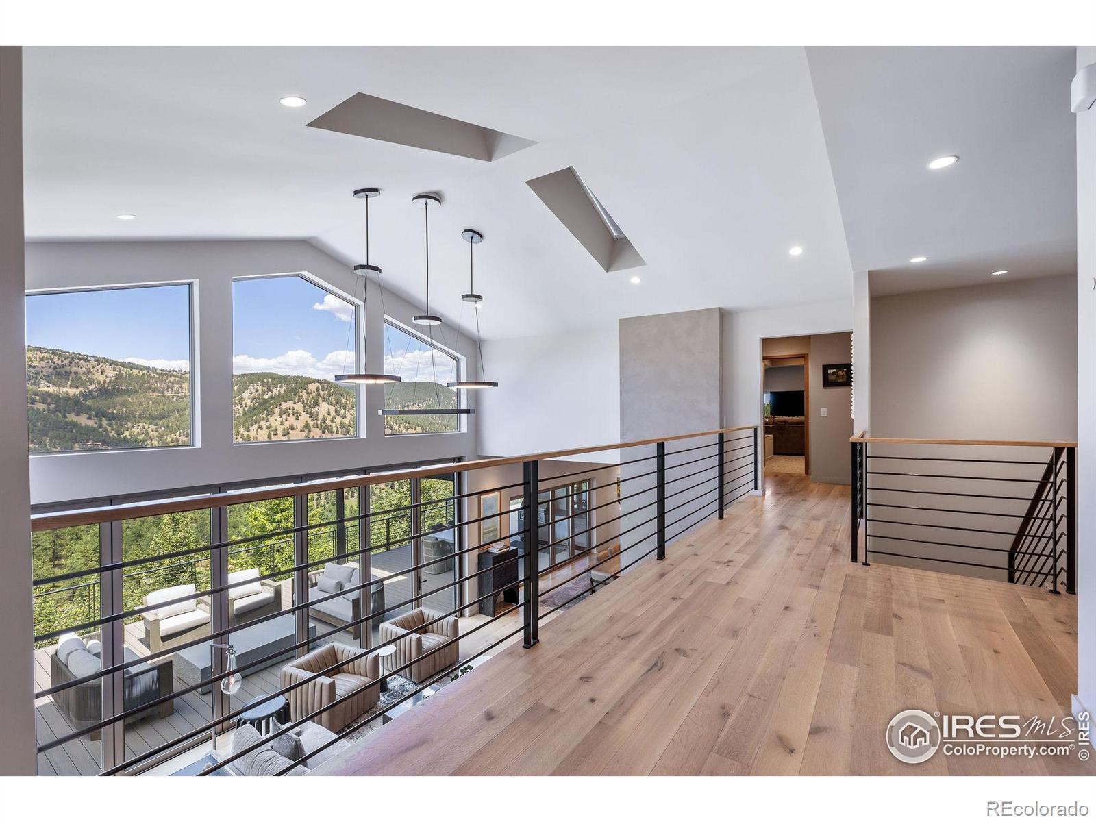 Perched majestically on a mountainside in the serene Pine Brook Hills neighborhood, this mountain luxury retreat at 50 Wildwood Lane is a private sanctuary, meticulously rebuilt and completed in 2023. Offering a seamless blend of natural beauty and modern design, this home features 4 spacious bedrooms, 2 versatile offices or dens, and a home theater room, ensuring ample space for work and play. This residence is designed for those who cherish the best of Boulder's indoor-outdoor living. All main floor living spaces open fully with accordion doors to a sprawling deck, offering massive views and creating an ideal setting for entertaining. The deck is equipped with heaters, fans, a gas grill, firepit, and retractable awning for year-round enjoyment. Inside, the eat-in kitchen shines with vaulted ceilings and skylights, fitted with premium appliances and a cozy breakfast nook. A two-sided fireplace elegantly separates the dining area from the great room, which features a wet bar and expansive windows and doors framing the breathtaking vistas. The main floor primary suite is a secluded haven, complete with a fireplace, his and her walk-in closets, a private patio, and a spa-like oasis of a bathroom. An adjacent den enhances the private quarters, offering additional flexibility. Upstairs, a home office, three secondary bedrooms all with ensuite baths, and a theater room cater to every need. Where refined design meets intelligent living, this home is fully Control4 automated. Don't miss the home gym in the detached garage area or flat grassy yard adjacent to the driveway. Conveniently located just 5 minutes from Broadway, yet a world apart, this home offers the pinnacle of mountain living with the utmost privacy on over 3 acres. Welcome to your mountain paradise!
