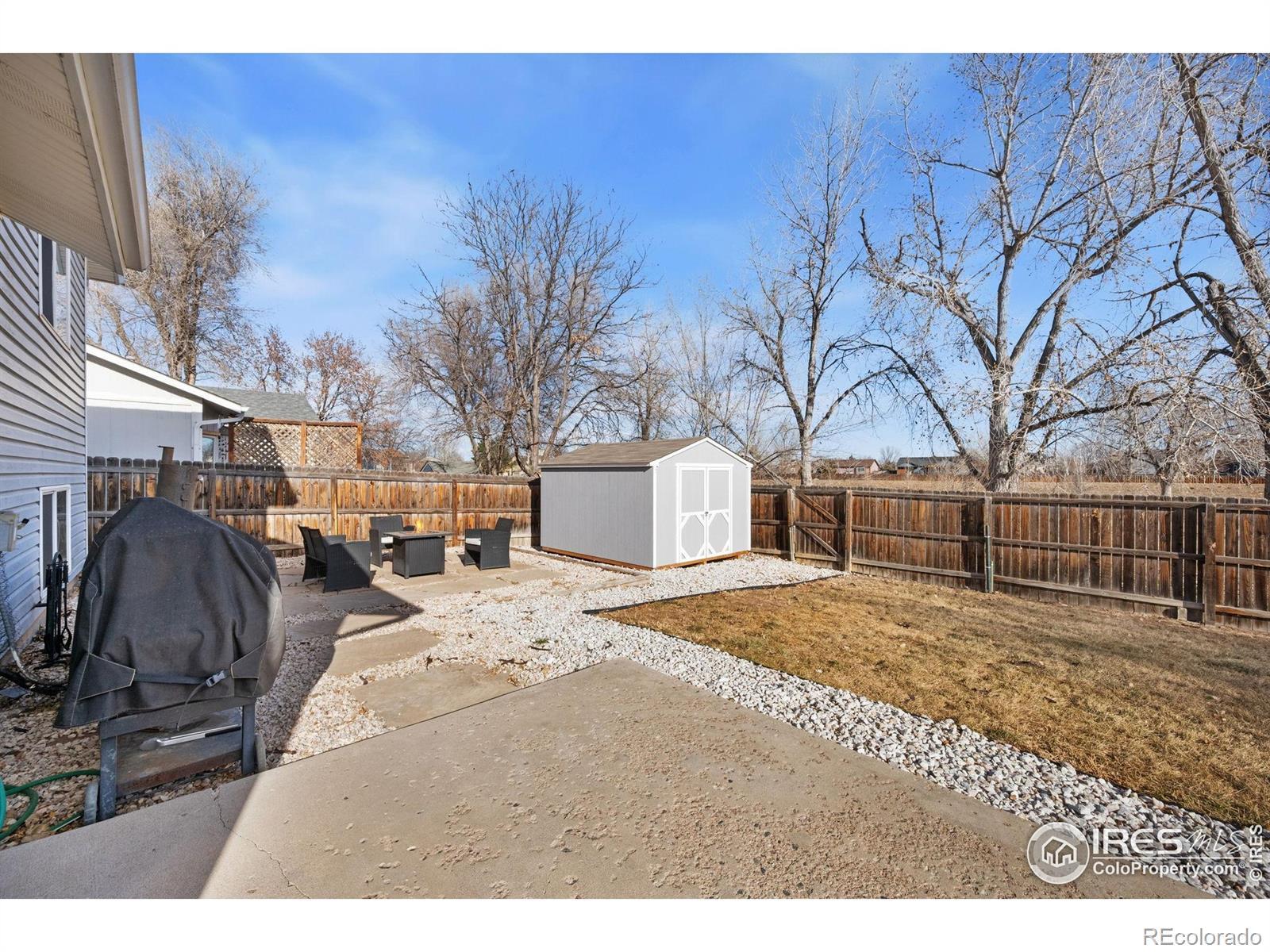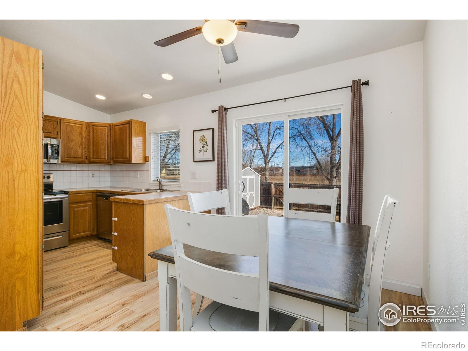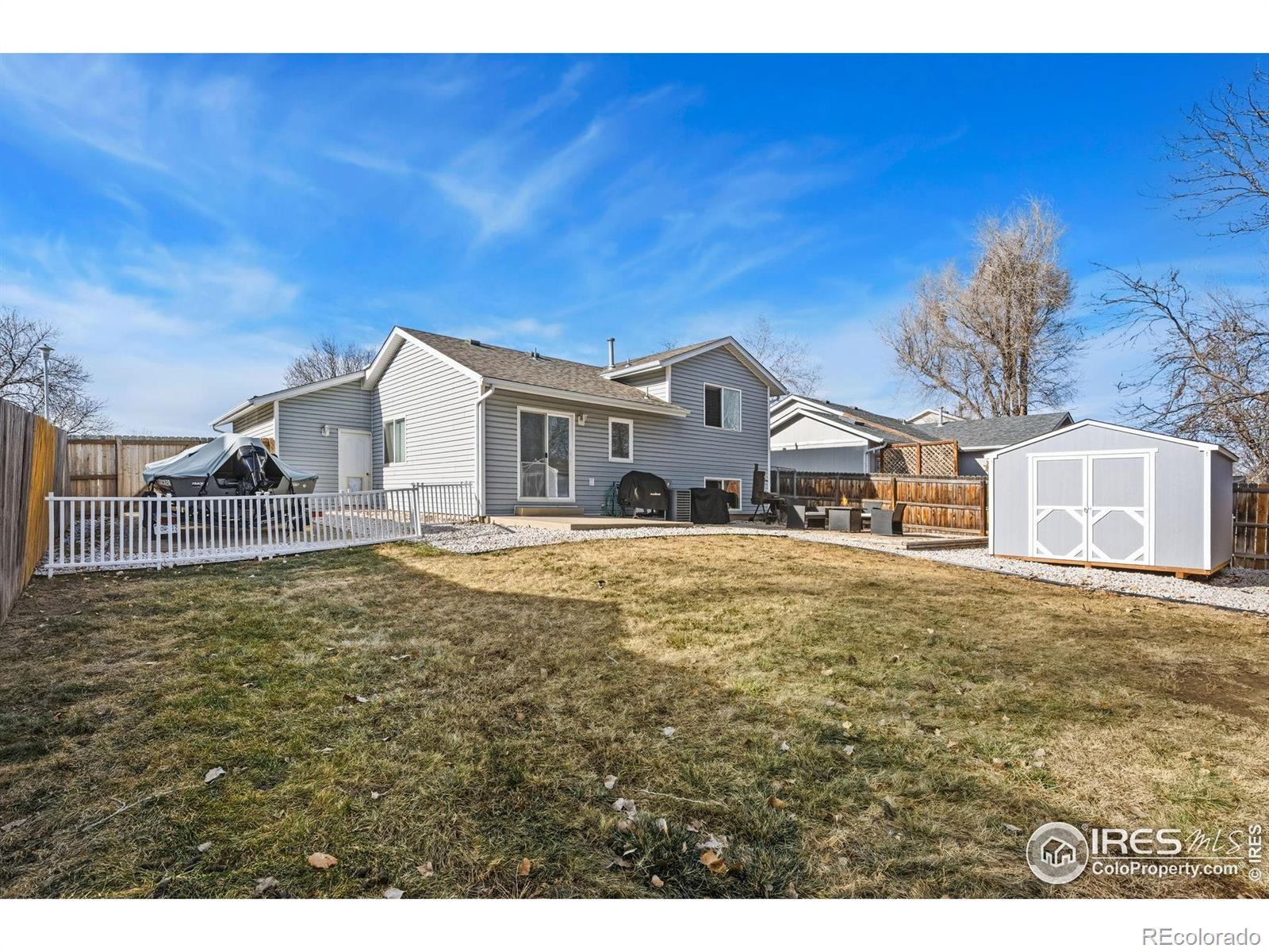 Welcome to 881 Columbine Dr in the heart of Windsor - a meticulously maintained home offering comfort, functionality, and a prime location close to downtown with easy access throughout town. The interior features a well-designed main level with a living room that flows seamlessly into the eat-in kitchen, complete with stainless steel appliances. The adjacent dining area is located just off the kitchen and includes sliding doors that open to the backyard, creating a smooth transition between indoor and outdoor living. Upstairs are two bedrooms and an upgraded full bathroom. The lower level provides additional living space with another bedroom, an upgraded 3/4 bathroom, and a spacious utility room with laundry hookups. Outside, the home offers a large backyard that backs to open space, providing privacy and a peaceful setting. A nice patio is ideal for outdoor enjoyment, and a large storage shed adds extra storage. Additional highlights include vinyl siding and a two-car garage. Conveniently located near downtown Windsor, this home combines thoughtful interior updates with a private outdoor setting and easy access to local amenities.