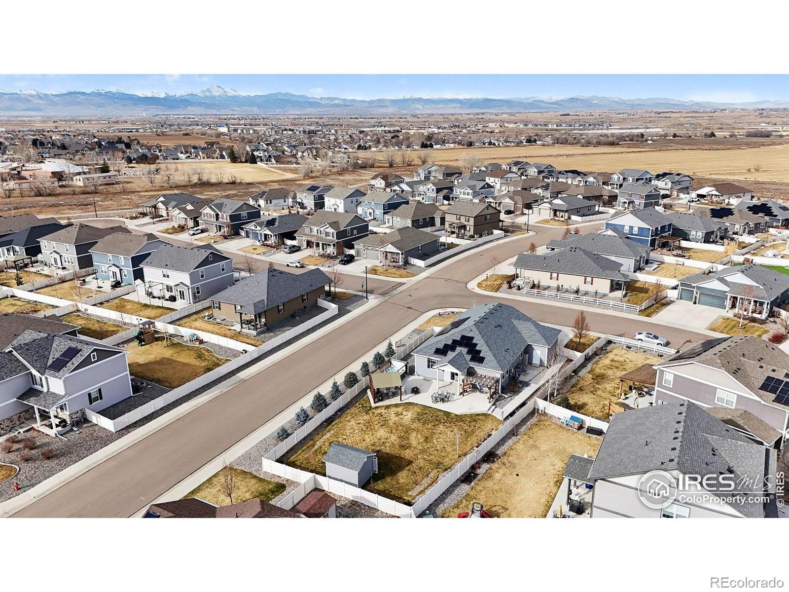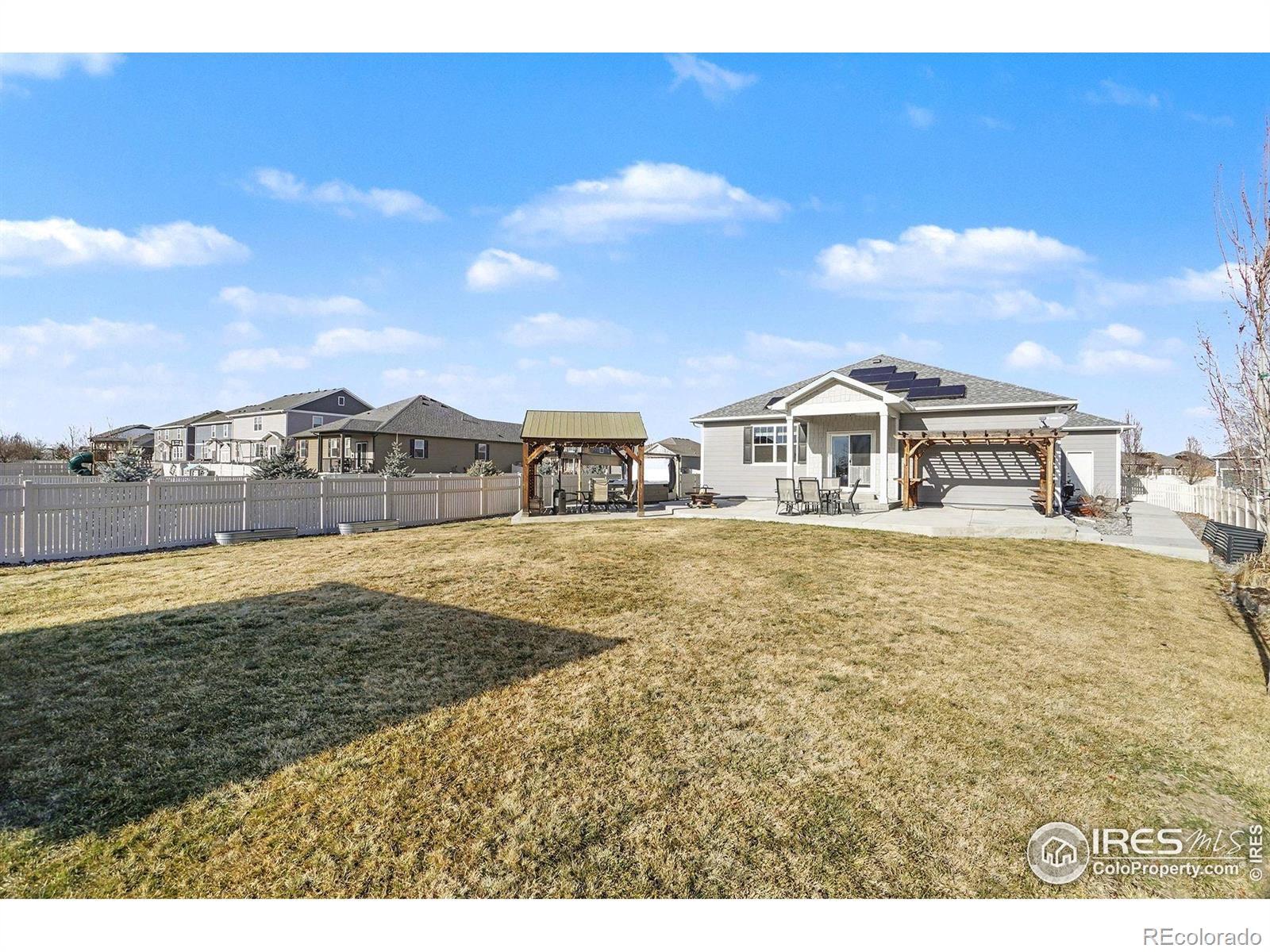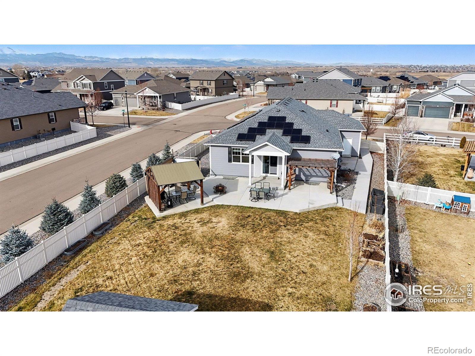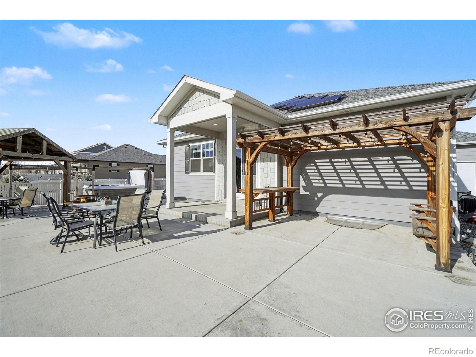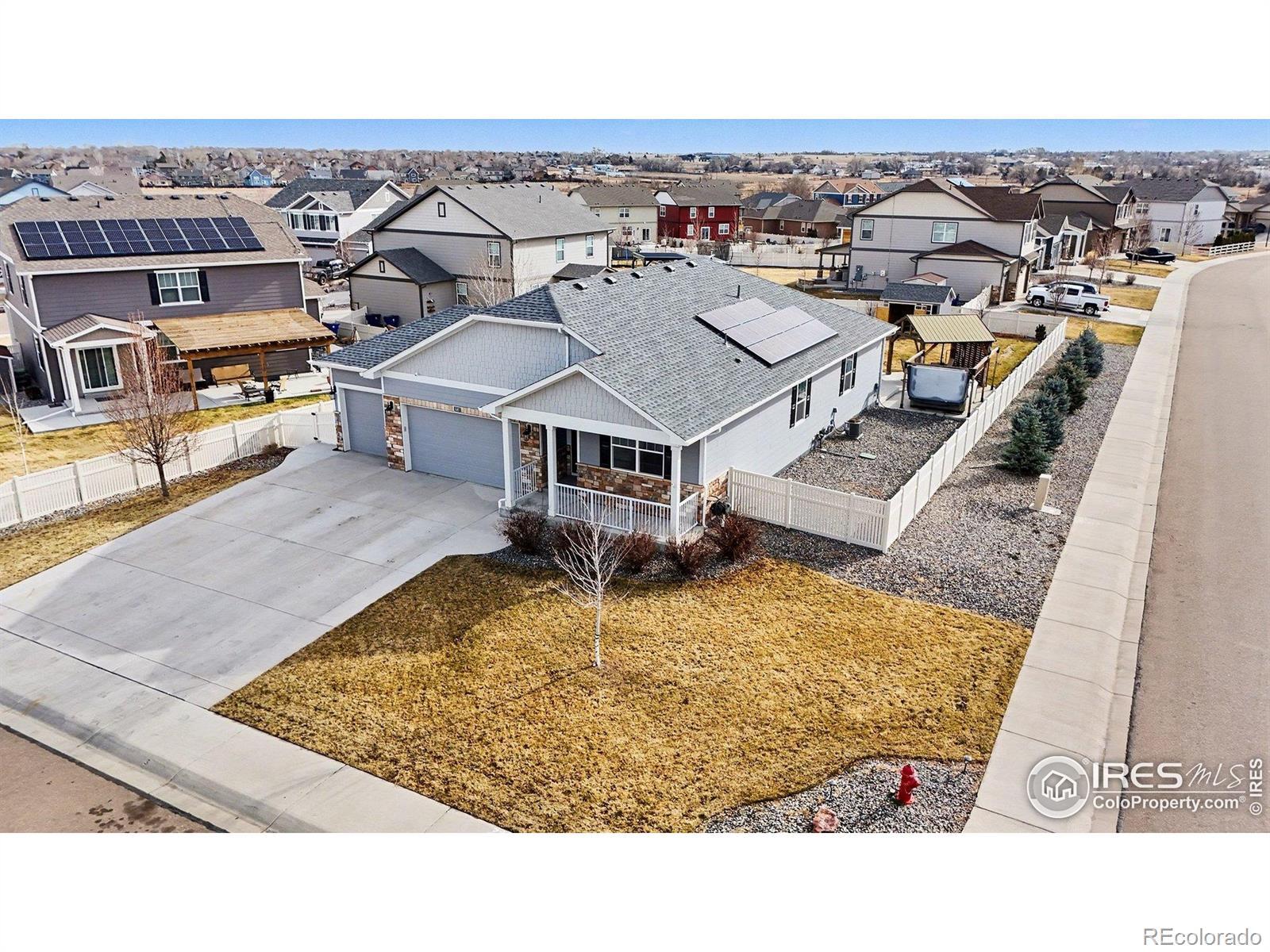 Welcome to Neighbor's Point, where each day feels like a retreat.One-owner, semi-custom home sits on the 2nd lgst lot in the neighborhood,Owned Solar powers the home & Hot Tub for min.electric cost,privacy landscaping frames the backyard made for entertaining and unwinding.Host gatherings on the wrap around patio,sit around the cozy wood heated fire pit,relax in the XL 8-person hot tub beneath its pergola w/ mood lights and roll down shades,or simply enjoy quiet evenings under the stars.3 beautiful pergolas,with wired lighting,a 10x12 shed, and an XL fully fenced grassy backyard complete the outdoor oasis.Small lights can be controlled either with a push of a button or in the App. The open-concept main level flows effortlessly from kitchen to dining & living areas, all bathed in natural light.Front bedrooms share a full bath.Primary Bedroom has a connecting Ensuite bath complete with double sinks,a private toilet room with a BIDET also features a large walk-in closet & a large 2nd closet. Kitchen features an XL walk in PANTRY with upgraded Stainless appliances.Post build upgrades include the above & under kitchen cabinet lighting.Hue smart lighting brings a modern & luxury touch.Lighting can be controlled with the Philips lighting remote on the microwave, or your voice home controller (Alexa or Google) The unfinished basement offers endless possibilities.Ethernet is wired throughout the home, with a centralized networking hub for modern connectivity. The 3-car garage is enhanced with partial insulation, attic access, a pedestrian door for ease and convenience, and additional 24'x24' LED lights added create an effective workshop or just VERY well lit garage.No shadows here! With over $85,000 in post-build upgrades, this home isn't just a place to live, it's a lifestyle.Neighbor's Point offers walking trails, playgrounds, and soccer fields, all minutes from I-25, shopping, and dining. Buyer to verify all measurements and information provided. CHECK 3D TOUR XTRA FEAT