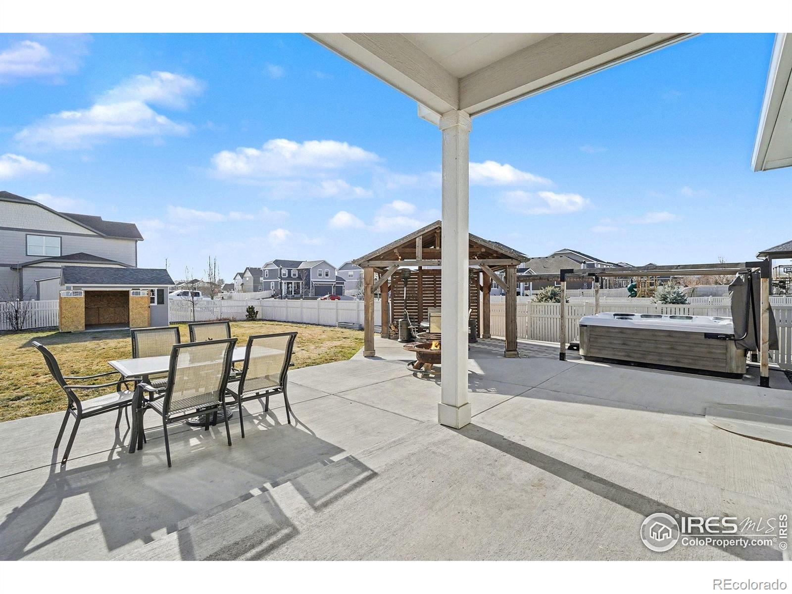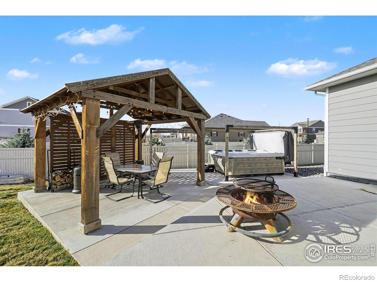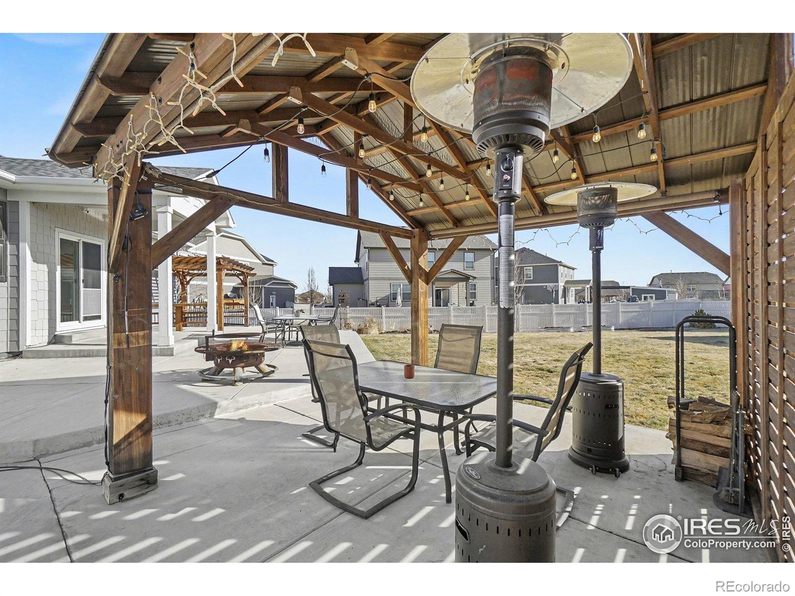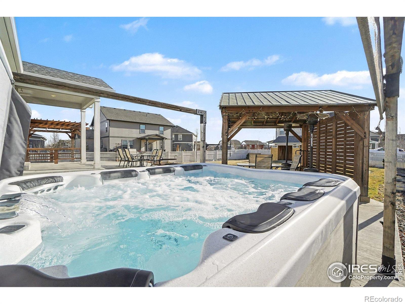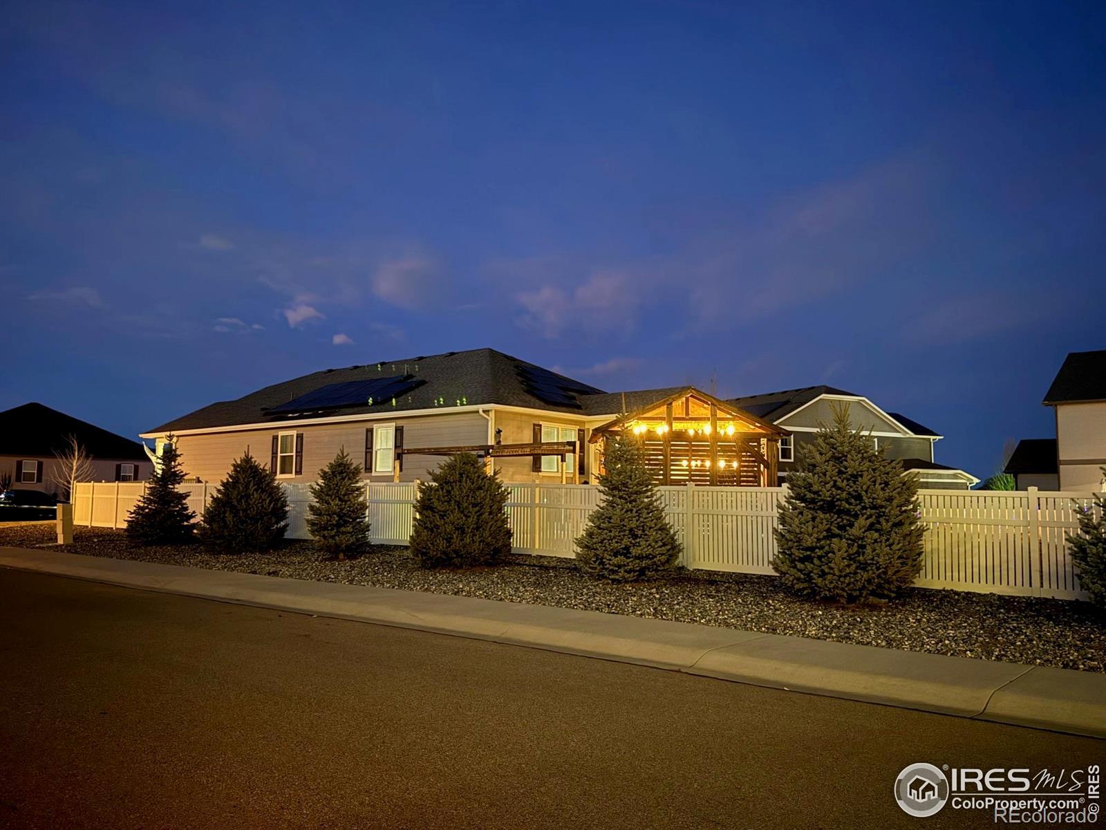 Welcome to Neighbor's Point, where each day feels like a retreat.One-owner, semi-custom home sits on the 2nd lgst lot in the neighborhood,Owned Solar powers the home & Hot Tub for min.electric cost,privacy landscaping frames the backyard made for entertaining and unwinding.Host gatherings on the wrap around patio,sit around the cozy wood heated fire pit,relax in the XL 8-person hot tub beneath its pergola w/ mood lights and roll down shades,or simply enjoy quiet evenings under the stars.3 beautiful pergolas,with wired lighting,a 10x12 shed, and an XL fully fenced grassy backyard complete the outdoor oasis.Small lights can be controlled either with a push of a button or in the App. The open-concept main level flows effortlessly from kitchen to dining & living areas, all bathed in natural light.Front bedrooms share a full bath.Primary Bedroom has a connecting Ensuite bath complete with double sinks,a private toilet room with a BIDET also features a large walk-in closet & a large 2nd closet. Kitchen features an XL walk in PANTRY with upgraded Stainless appliances.Post build upgrades include the above & under kitchen cabinet lighting.Hue smart lighting brings a modern & luxury touch.Lighting can be controlled with the Philips lighting remote on the microwave, or your voice home controller (Alexa or Google) The unfinished basement offers endless possibilities.Ethernet is wired throughout the home, with a centralized networking hub for modern connectivity. The 3-car garage is enhanced with partial insulation, attic access, a pedestrian door for ease and convenience, and additional 24'x24' LED lights added create an effective workshop or just VERY well lit garage.No shadows here! With over $85,000 in post-build upgrades, this home isn't just a place to live, it's a lifestyle.Neighbor's Point offers walking trails, playgrounds, and soccer fields, all minutes from I-25, shopping, and dining. Buyer to verify all measurements and information provided. CHECK 3D TOUR XTRA FEAT
