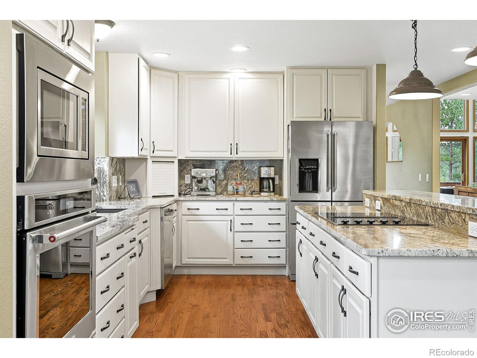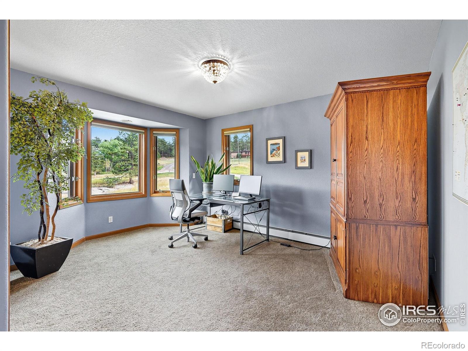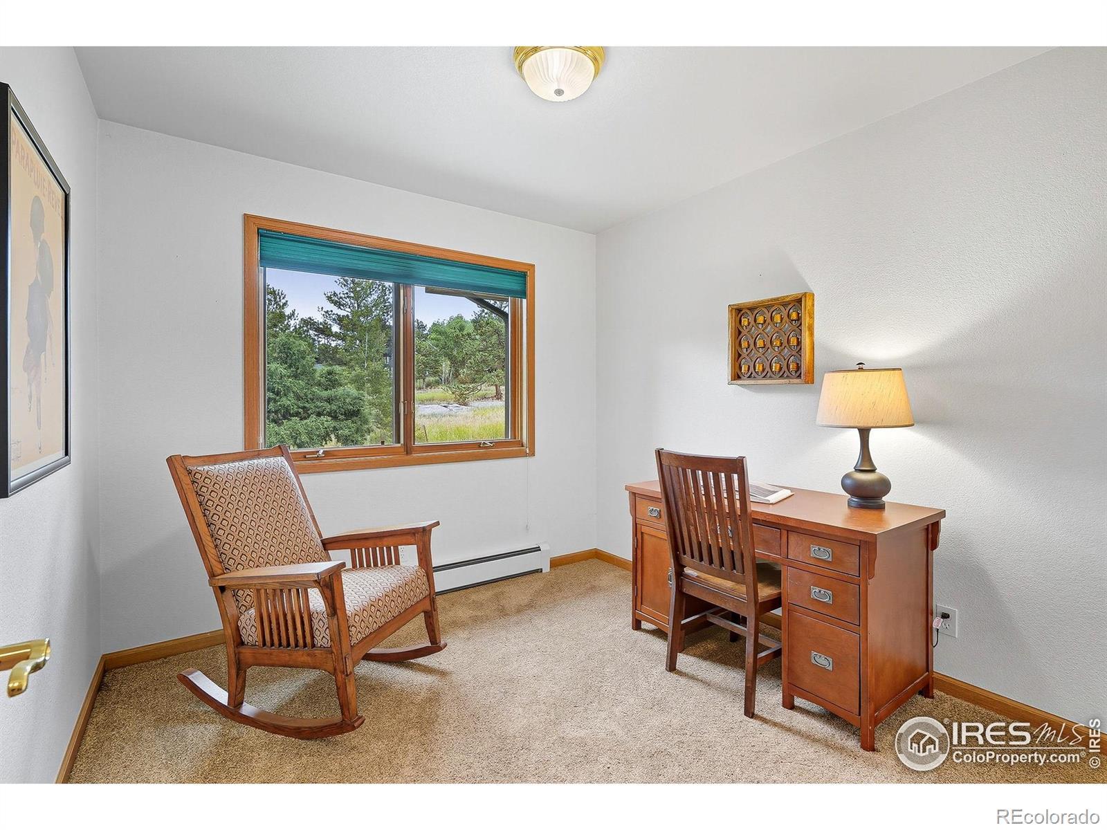 Retreat to the majestic mountains just outside Lyons, where this delightful home awaits with stunning vistas and visits from local wildlife, creating a pine-scented haven. With direct access to hiking and biking trails and Rocky Mountain National Park nearby, adventures await right outside your door. The main level features an inviting great room adorned with a wall of windows that perfectly frames the serene pines, allowing natural light to illuminate the space. The updated kitchen shines with granite countertops, modern appliances, and generous room for entertaining family and friends. A cozy wood-burning fireplace serves as the heart of the home, providing warmth and charm during the chilly months. A bright office space offers an inspiring setting for remote work or creative pursuits. Step outside to the expansive 1,000+ sq ft wrap-around deck, perfect for outdoor gatherings, complete with hanging swings for ultimate relaxation. Upstairs, find three spacious bedrooms, including a primary suite with a large walk-in closet and its own private deck. The luxurious en-suite bath features a soaking tub and a glass-walled shower for your comfort. The fully finished walkout basement presents an excellent investment opportunity, with an additional bedroom, bathroom, living area, and kitchenette, ideal for an in-law or au-pair suite with a separate entrance. Nestled on a beautifully landscaped 2-acre lot, this home boasts a three-car garage, a new roof (2025), a newer water heater, a radon mitigation system, and a fenced dog run, ensuring peace of mind for years to come. Located in the friendly, community-oriented neighborhood of Pinewood Springs, home to the Ute Indian Tubs. This property is perfectly positioned for easy access to the charm of both Lyons and Estes Park, yet only one hour from DIA for quick access to wherever you journey leads you next!