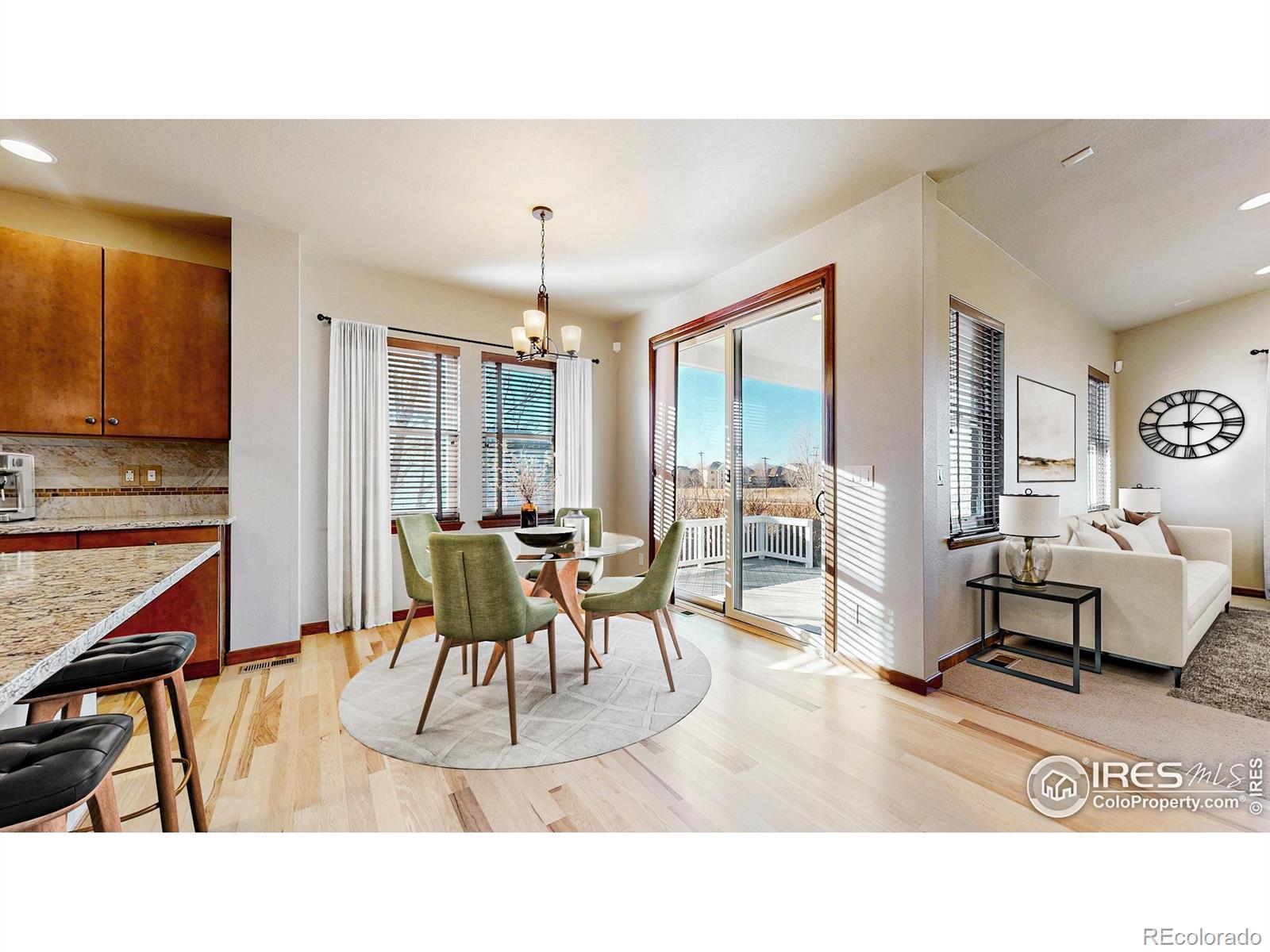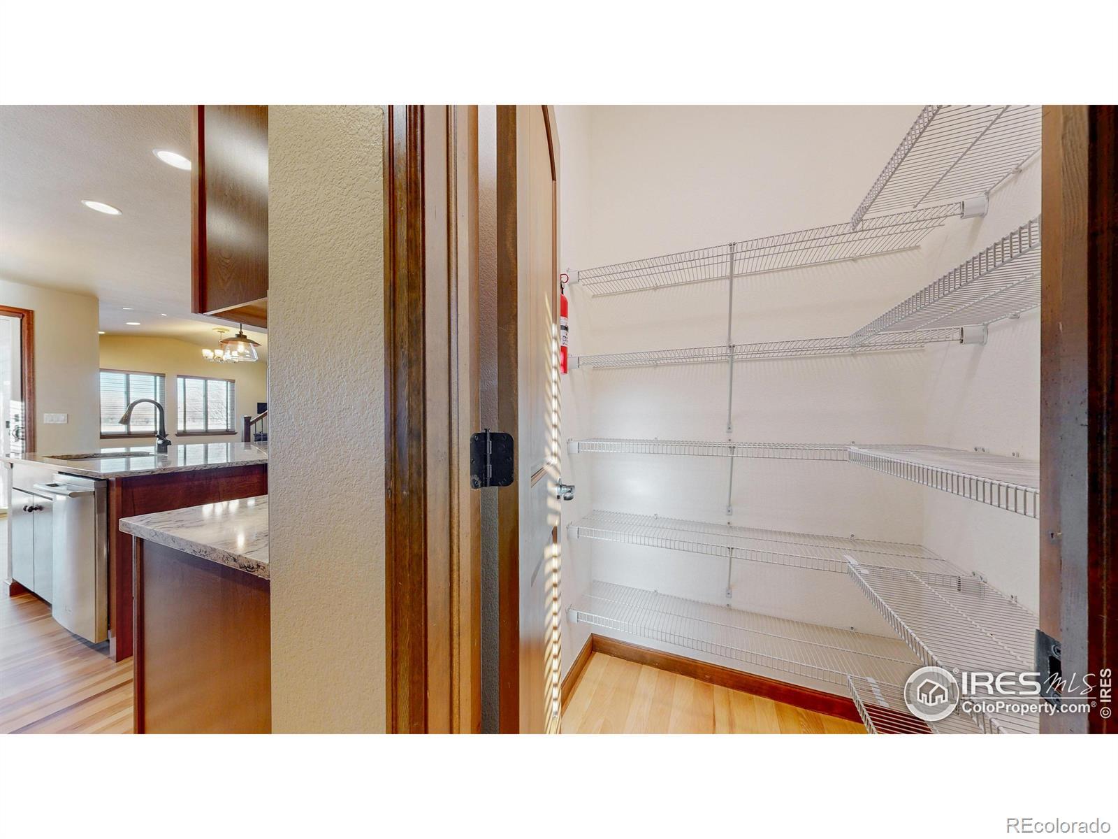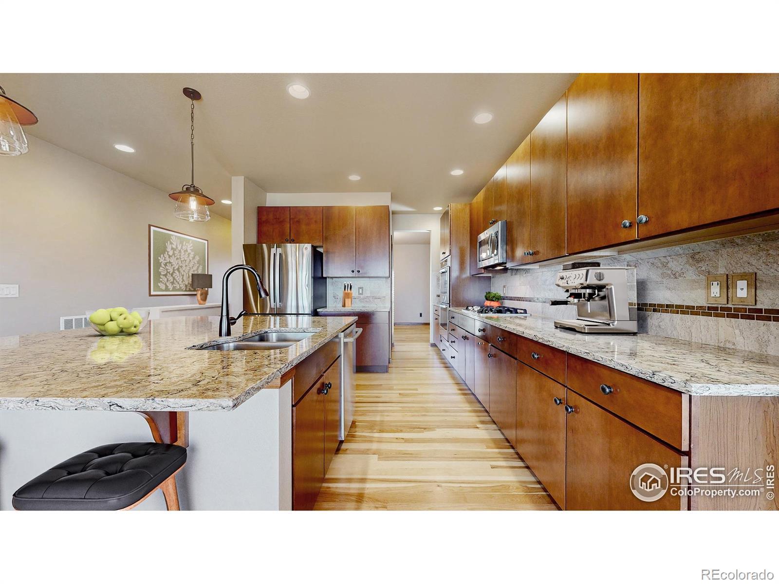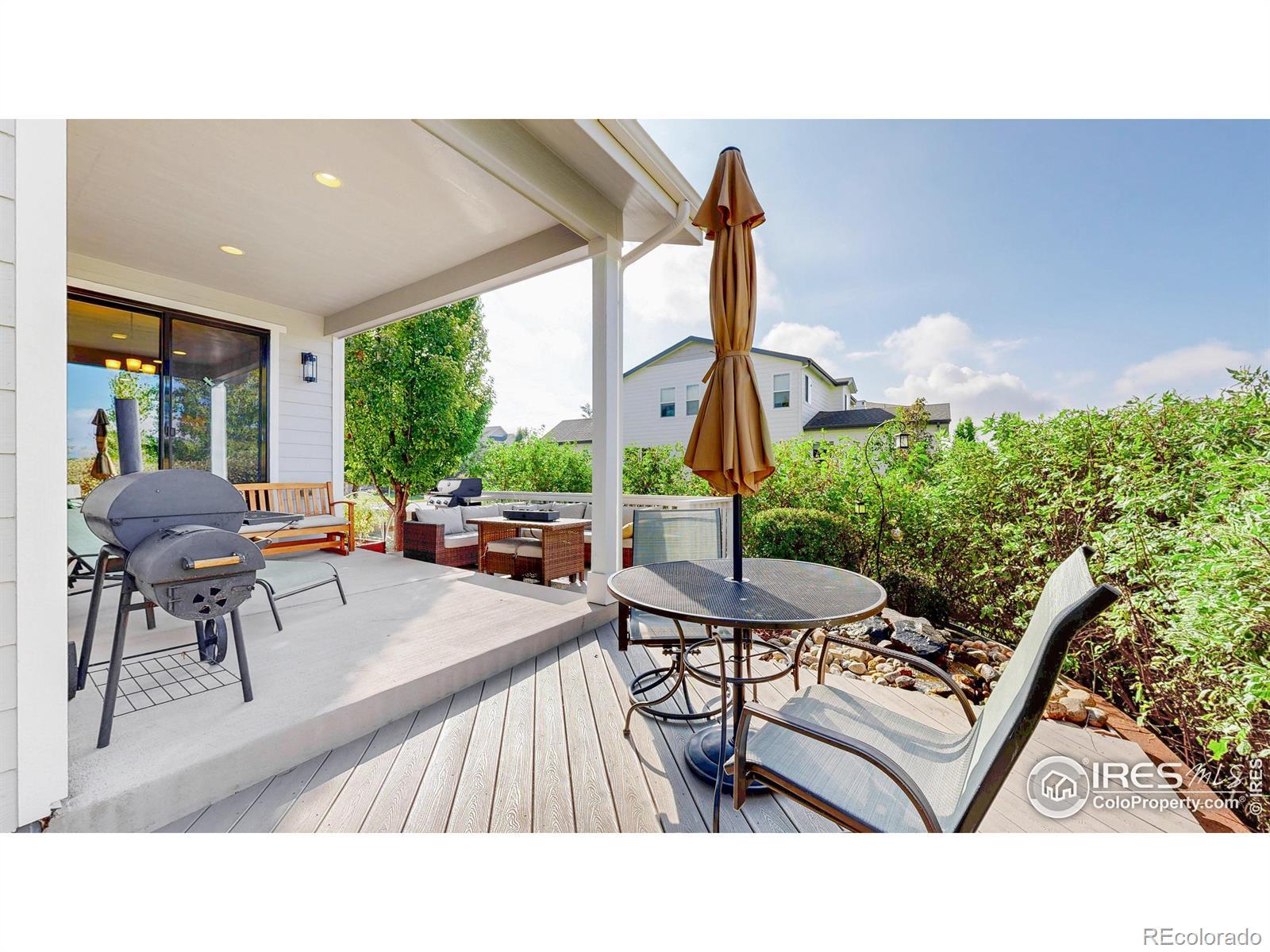 A must-see gem in McClelland's Creek-this beautifully upgraded 5-bedroom, 4-bath home. Backing to Zach Elementary, the property offers stunning mountain views and to the south, direct access to green space and trails connecting to Radiant and Twin Silos Park. Inside, the home showcases thoughtful craftsmanship and high-end finishes: granite countertops, stained trim, wrought-iron stair railing, and custom cabinetry in the finished basement. The chef's kitchen is a true centerpiece, featuring stainless steel appliances, double ovens, 5-burner gas cooktop, walk-in pantry, and a large island perfect for entertaining. The flexible layout includes two primary suites-one on the main floor that functions as a luxury guest/in-law suite, office, or dream kids' retreat with its own 3/4 bath and living area. The main level also features a formal dining room and cozy living room with a cast iron gas fireplace. Upstairs, the primary suite offers mountain views, a coffered ceiling, and a spa-like five-piece bath with an extra-deep soaking tub. A spacious loft provides room for a home office, playroom, or media space. Two additional bedrooms, a dual-sink bathroom, and a convenient upstairs laundry room complete the level. The finished basement adds a large living area, wet bar with wine cooler and fridge, rec space, another bedroom, and 3/4 bath-perfect for multigenerational living. Step outside to a beautifully landscaped backyard with a covered patio, composite deck, water feature, garden beds, grapevine, blackberries, and a split rail fence with wire mesh-ready for pets and play. Custom garage cabinetry provides ample storage. Perfectly positioned in one of South Fort Collins' most desirable neighborhoods, with top rated schools, this home blends luxury, location, and lifestyle-ready to welcome you home!