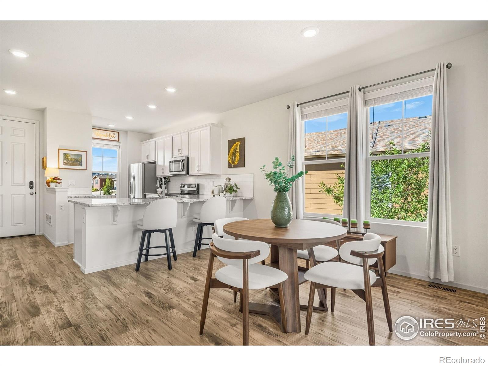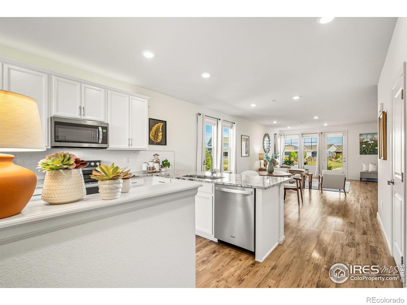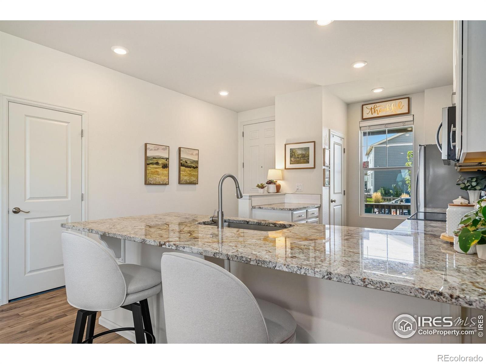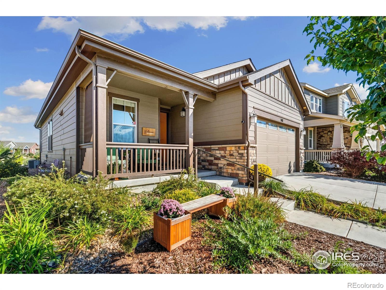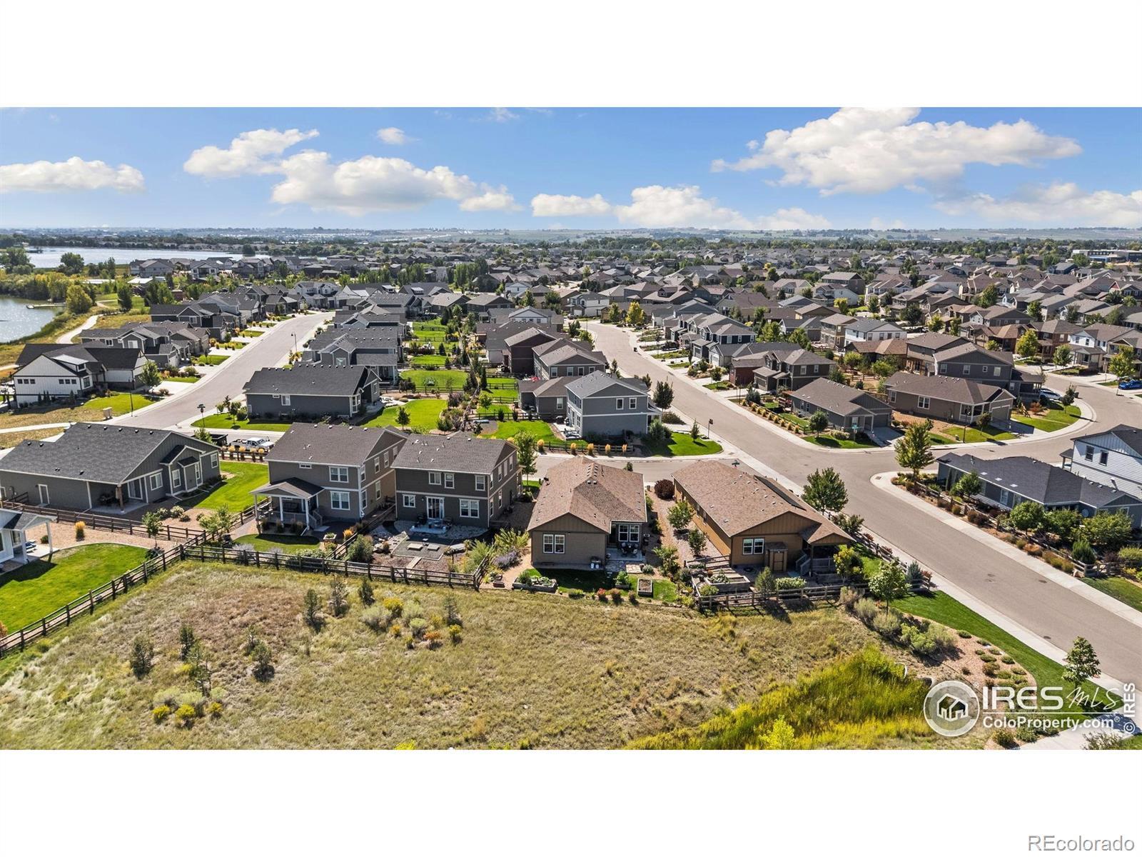 Nature right at your back door! This beautifully maintained single-level home backs to open space and sits just a stone's throw from Houts Reservoir, offering a serene living environment with abundant outdoor activities right at your doorstep. Located in Loveland's Lakes at Centerra neighborhood-Colorado's only Certified Community Wildlife Habitat, you'll enjoy hundreds of acres of open water for kayaking and fishing, along with miles of scenic trails for bird watching and tranquil walks. Inside, the 3-bedroom, 2-bath layout is open and inviting, enhanced by higher ceilings, oversized doors, and ADA-compliant spaces that provide both comfort and accessibility. The upgraded kitchen package features stainless steel appliances, gleaming granite countertops, a convenient pantry, and a breakfast bar with seating for casual dining or entertaining guests. The primary suite includes its own ensuite bathroom that has a wider door opening. Step outside to the landscaped backyard, where you'll find a concrete patio equipped with a remote-controlled sunsetter awning, perfect for enjoying the outdoors in comfort. The raised garden beds provide an opportunity for gardening enthusiasts to cultivate their own plants. The extended 2-car garage not only fits vehicles with ease but also provides additional storage space for gear, tools, or hobbies. Perfectly situated, this home offers peaceful surroundings while keeping you close to shopping, dining, and Loveland's best amenities, all within Centerra's beautiful setting.