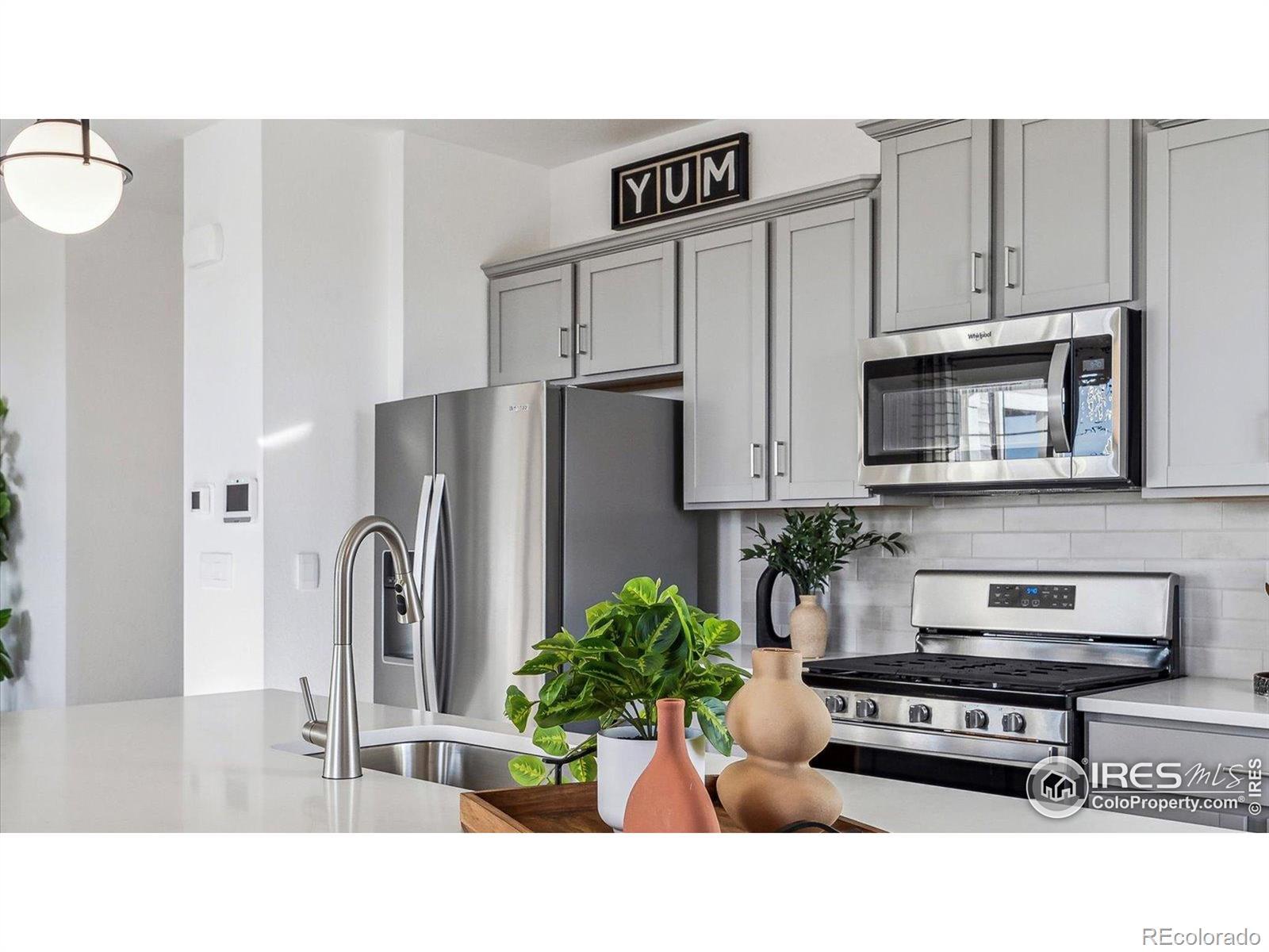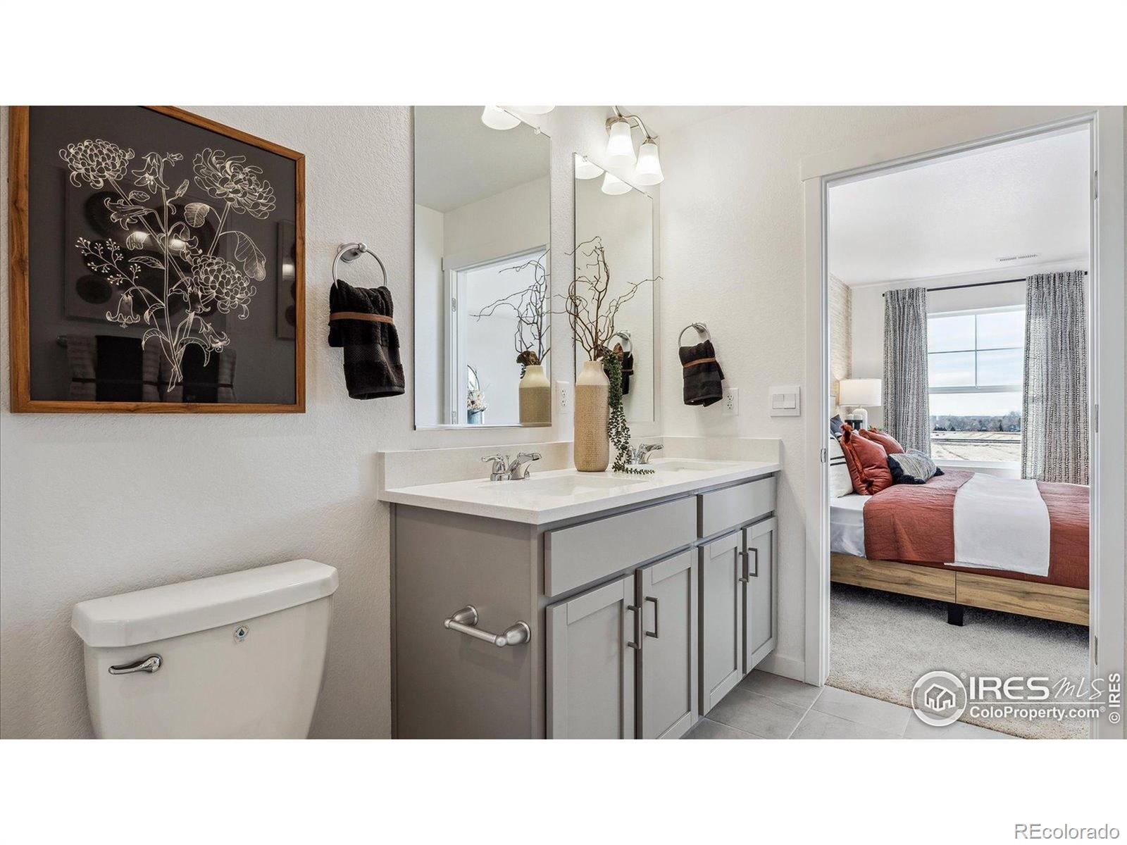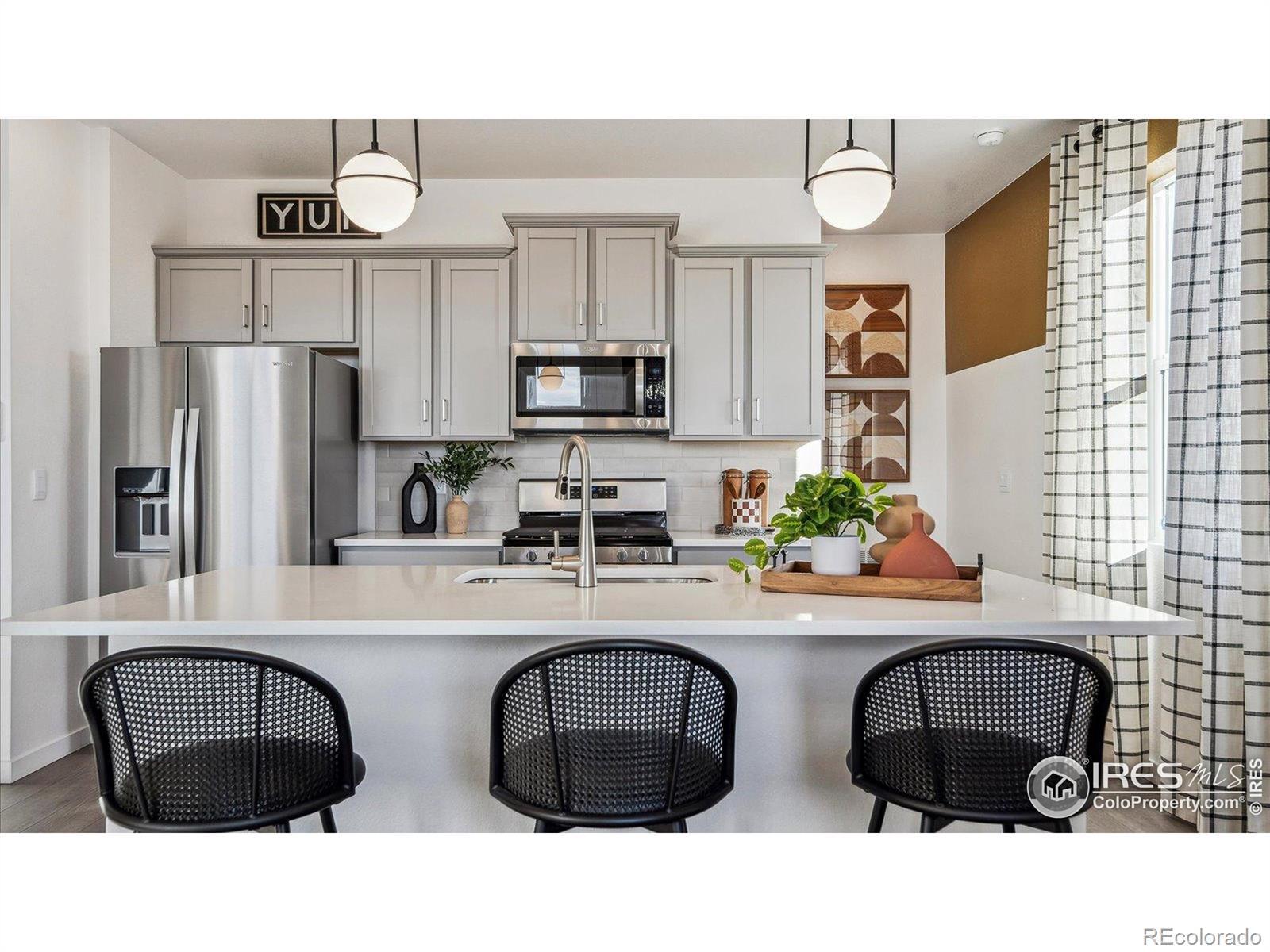 This home features 4 beds, a loft, 2.5 baths, and a 2 car garage. This home also fronts onto a large grassed common courtyard with maintenance-free front yard landscaping, tankless water heater, active Radon system, blinds, and Smart Home technology with remote capabilities in a location backdropped by water and mountain views. Also includes incredible amenities such as TPC Colorado privileges including use of their world-class Fitness Center, Resort Style Pool with swim-up bar and hot tub, and restaurants. Use of Vantage Pool, Splashpad, Grilling Area, Playground and 2 Dog Parks in the 5-acre, on-site complex are also included in the HOA. ***Photos are representative and not of actual property***