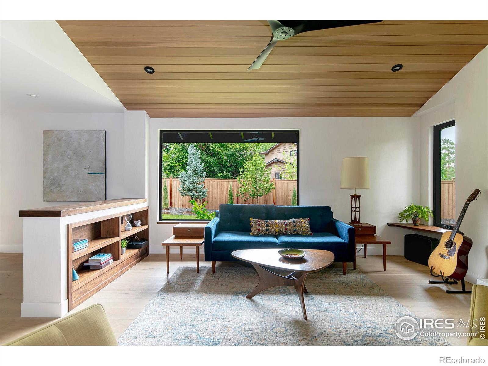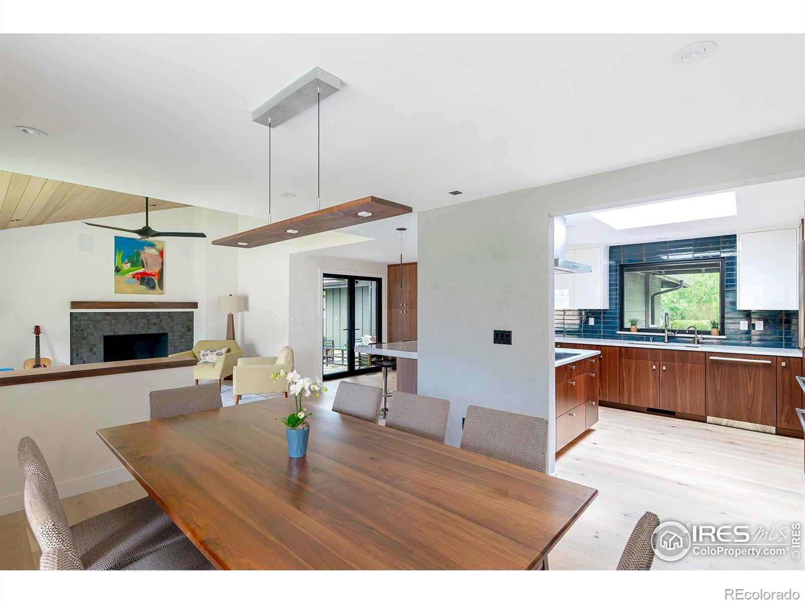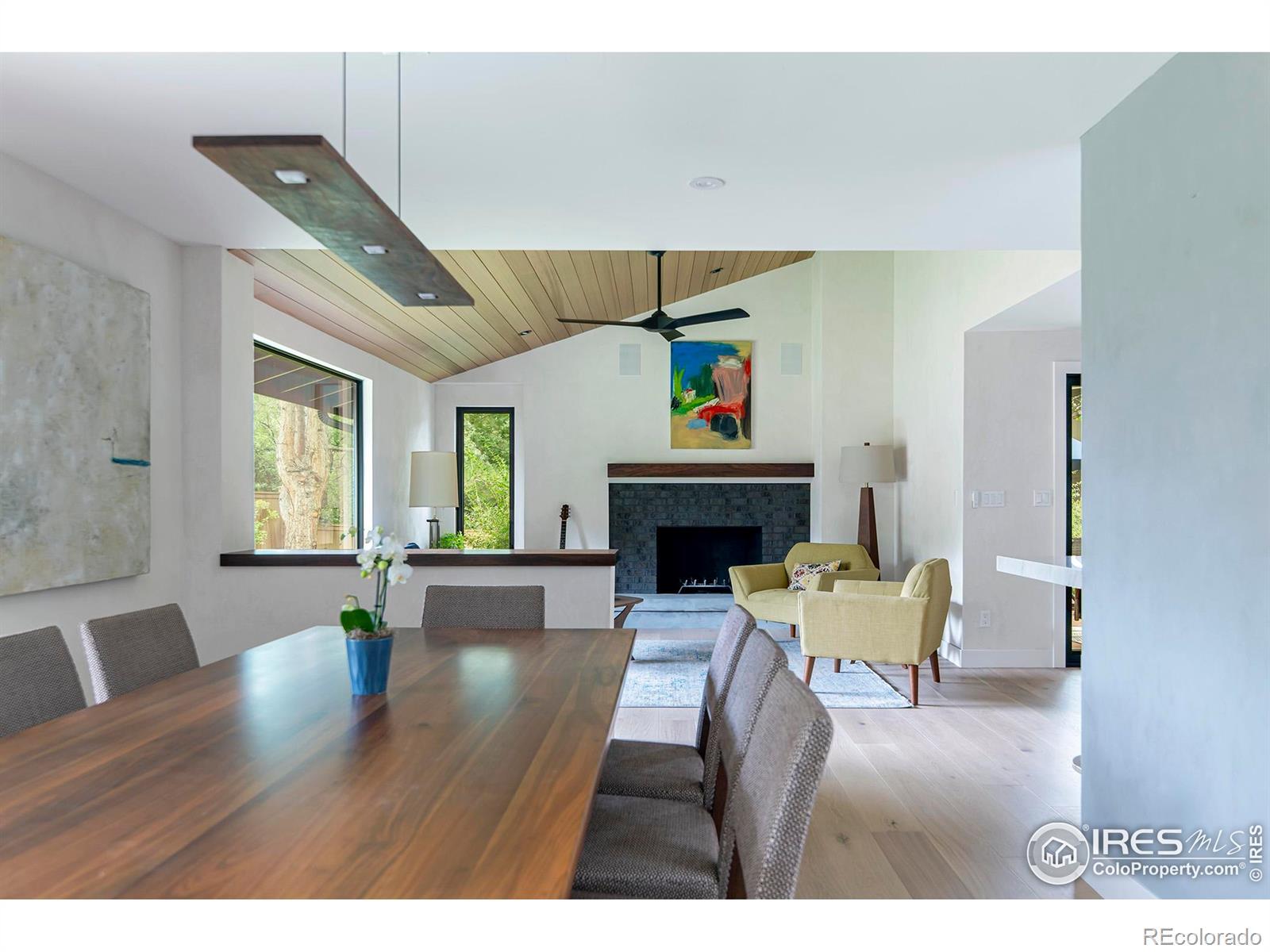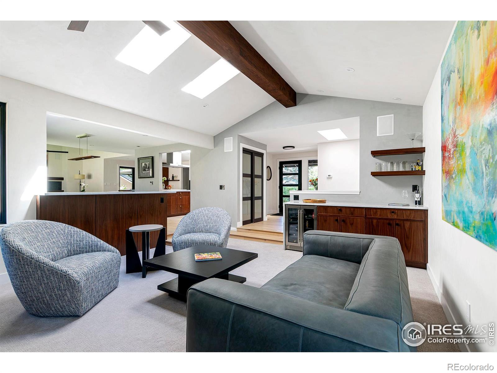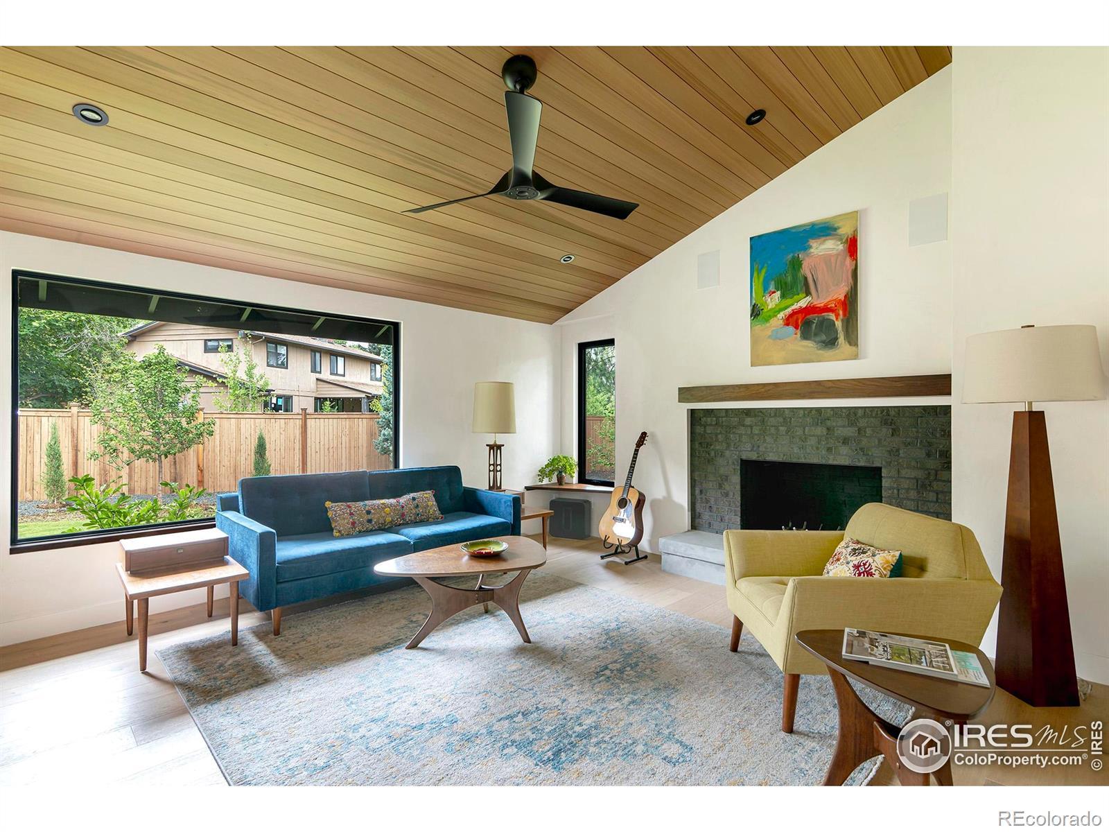 Warm, architectural, and effortlessly livable, this extensively renovated ranch offers a sophisticated reimagining of mid-century modern design in Boulder Country Club. Set on a quiet cul-de-sac, the home features stained brick, cedar accents, translucent glass garage doors, and mature landscaping-an understated introduction to the quality found within.Inside, vaulted ceilings and skylights bring in abundant natural light through expansive new Marvin windows, while handcrafted clay walls and wide-plank white oak flooring add warmth and texture. The living room is anchored by a custom gas fireplace, walnut beam, and elegant bar area.The kitchen is thoughtfully designed for both casual gathering and serious cooking, featuring a generous center island, rich walnut cabinetry, natural quartzite and quartz countertops, Thermador appliances, and imported tile accents. Adjacent living and dining areas offer open sight lines and natural flow. A light-filled family room features oversized picture windows, wood-paneled ceilings, and a sleek fireplace.The main-level primary suite is a private retreat with vaulted ceilings, a custom fireplace, spa-inspired bath with soaking tub, dual vanities, oversized shower, and an expansive walk-in closet. Three additional bedrooms provide flexibility for guests, home office, or creative use. The finished lower level includes sound-dampening ceilings, walnut acoustic panels, and a full bath-ideal for media, studio, or guest space.Outdoor living includes multiple patios and a landscaped, fenced backyard offering privacy and usability. A three-car garage with EV wiring and ample storage adds everyday practicality. Located in Boulder Country Club with championship golf, tennis, swimming, and social amenities just steps away, this residence exemplifies today's Boulder luxury. Extensive renovations include a new roof, Marvin windows, electrical, HVAC, appliances, custom kitchen & baths, interior doors and baseboards, landscaping, and hardscaping.