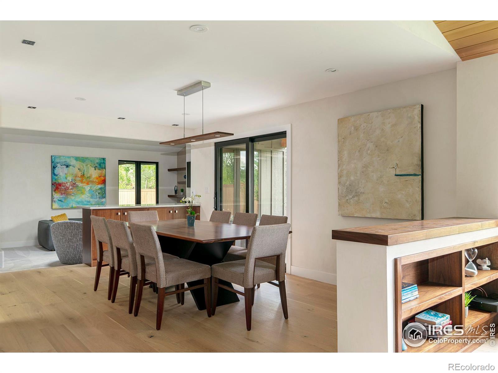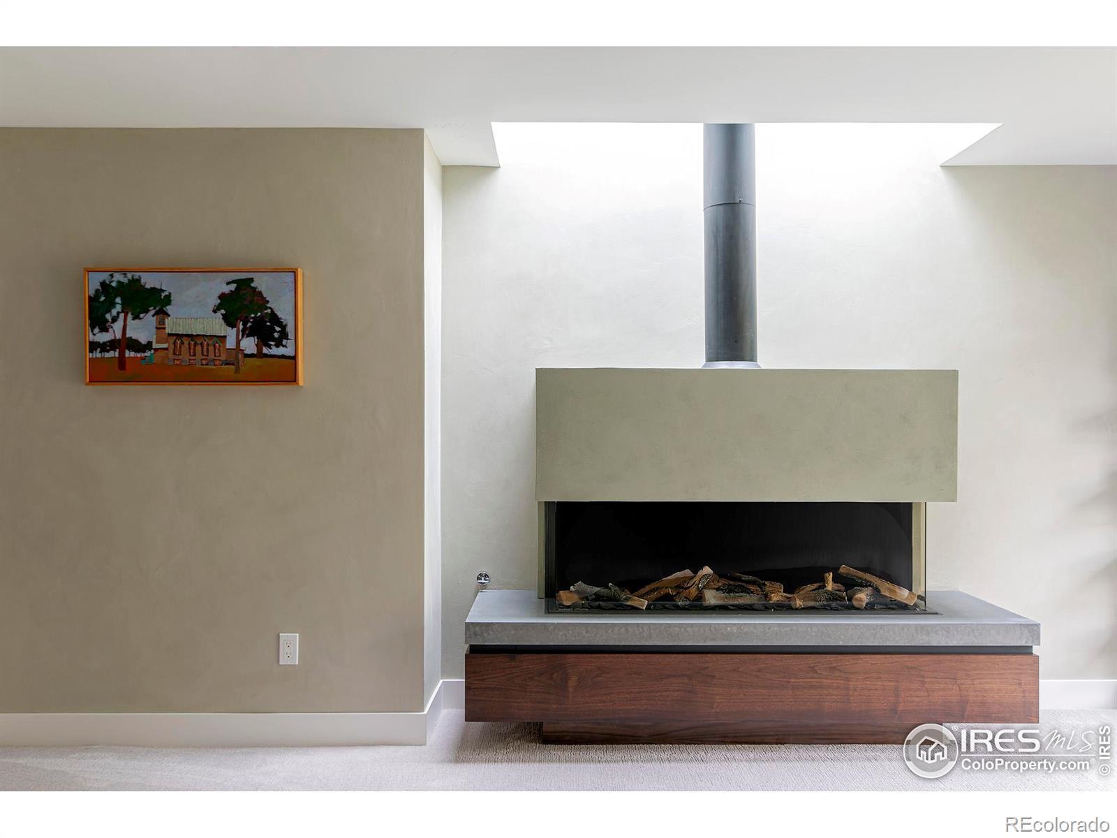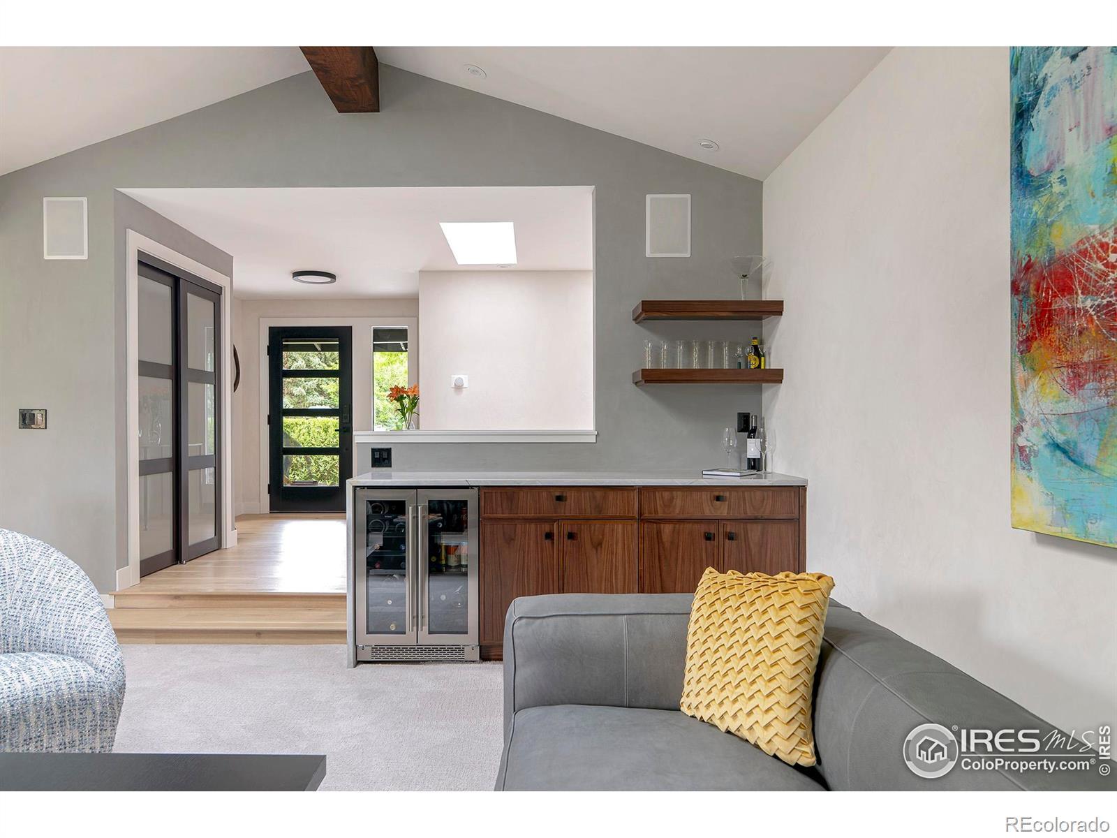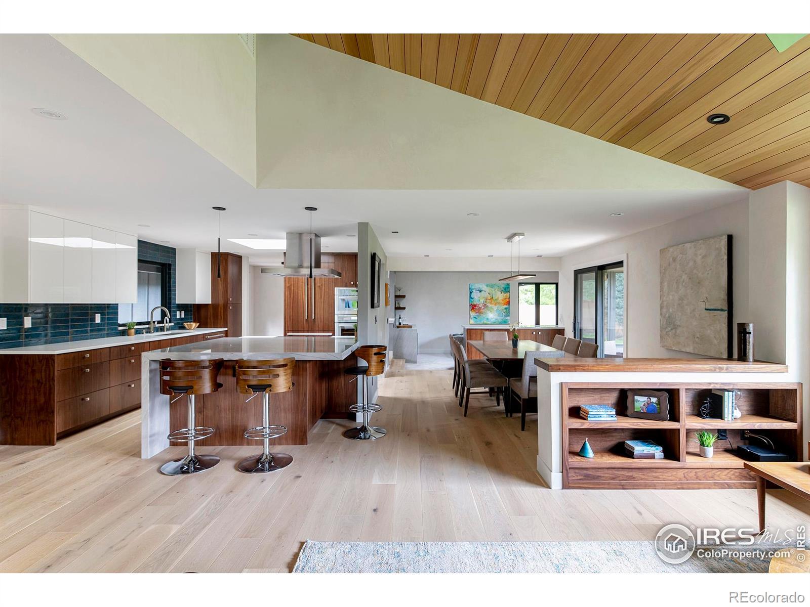 Warm, architectural, and effortlessly livable, this extensively renovated ranch offers a sophisticated reimagining of mid-century modern design in Boulder Country Club. Set on a quiet cul-de-sac, the home features stained brick, cedar accents, translucent glass garage doors, and mature landscaping-an understated introduction to the quality found within.Inside, vaulted ceilings and skylights bring in abundant natural light through expansive new Marvin windows, while handcrafted clay walls and wide-plank white oak flooring add warmth and texture. The living room is anchored by a custom gas fireplace, walnut beam, and elegant bar area.The kitchen is thoughtfully designed for both casual gathering and serious cooking, featuring a generous center island, rich walnut cabinetry, natural quartzite and quartz countertops, Thermador appliances, and imported tile accents. Adjacent living and dining areas offer open sight lines and natural flow. A light-filled family room features oversized picture windows, wood-paneled ceilings, and a sleek fireplace.The main-level primary suite is a private retreat with vaulted ceilings, a custom fireplace, spa-inspired bath with soaking tub, dual vanities, oversized shower, and an expansive walk-in closet. Three additional bedrooms provide flexibility for guests, home office, or creative use. The finished lower level includes sound-dampening ceilings, walnut acoustic panels, and a full bath-ideal for media, studio, or guest space.Outdoor living includes multiple patios and a landscaped, fenced backyard offering privacy and usability. A three-car garage with EV wiring and ample storage adds everyday practicality. Located in Boulder Country Club with championship golf, tennis, swimming, and social amenities just steps away, this residence exemplifies today's Boulder luxury. Extensive renovations include a new roof, Marvin windows, electrical, HVAC, appliances, custom kitchen & baths, interior doors and baseboards, landscaping, and hardscaping.