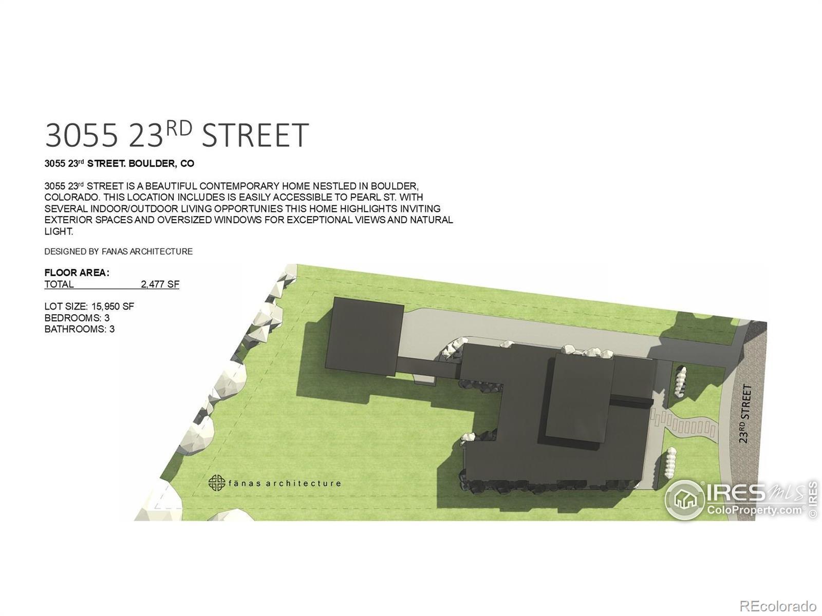 A rare opportunity in the heart of Boulder, 3055 23rd Street offers a nearly 1/3 acre, flat lot, ready for new construction. Situated on a desirable, established street, this exceptional property provides a sprawling canvas with water and sewer connections already in place. The expansive, level lot opens the door to a wide range of possibilities for creating a truly special home. The generous size of the property is particularly well suited for a spacious single-level design, making it an excellent option for those seeking the convenience of main-level living. If you've been searching for the ideal setting to build a home with room to spread out both indoors and out, this lot offers outstanding flexibility. Bring your architect and your vision, or explore the potential of the site through the sample renderings by Fanas Architecture included in the photos. These concepts highlight just two possibilities: an expansive one-level retreat with an oversized garage, or a multi-story home featuring two primary suites, a rooftop deck, and nearly 3,500 square feet of living space. Beyond the property itself, enjoy the very best of the Boulder lifestyle. World-class hiking and biking trails are moments away, with Ideal Market Shopping Center just a short walk and the dining, culture, and energy of Pearl Street only a five-minute drive. This is a rare opportunity to build a custom home on a generously sized lot in one of Boulder's most sought-after locations.