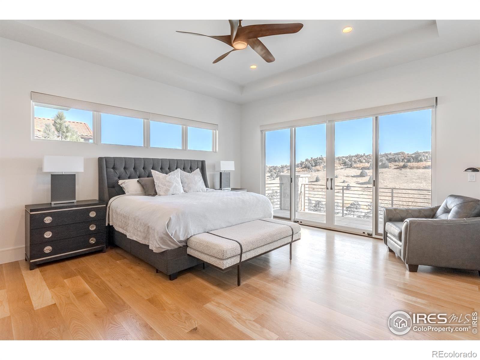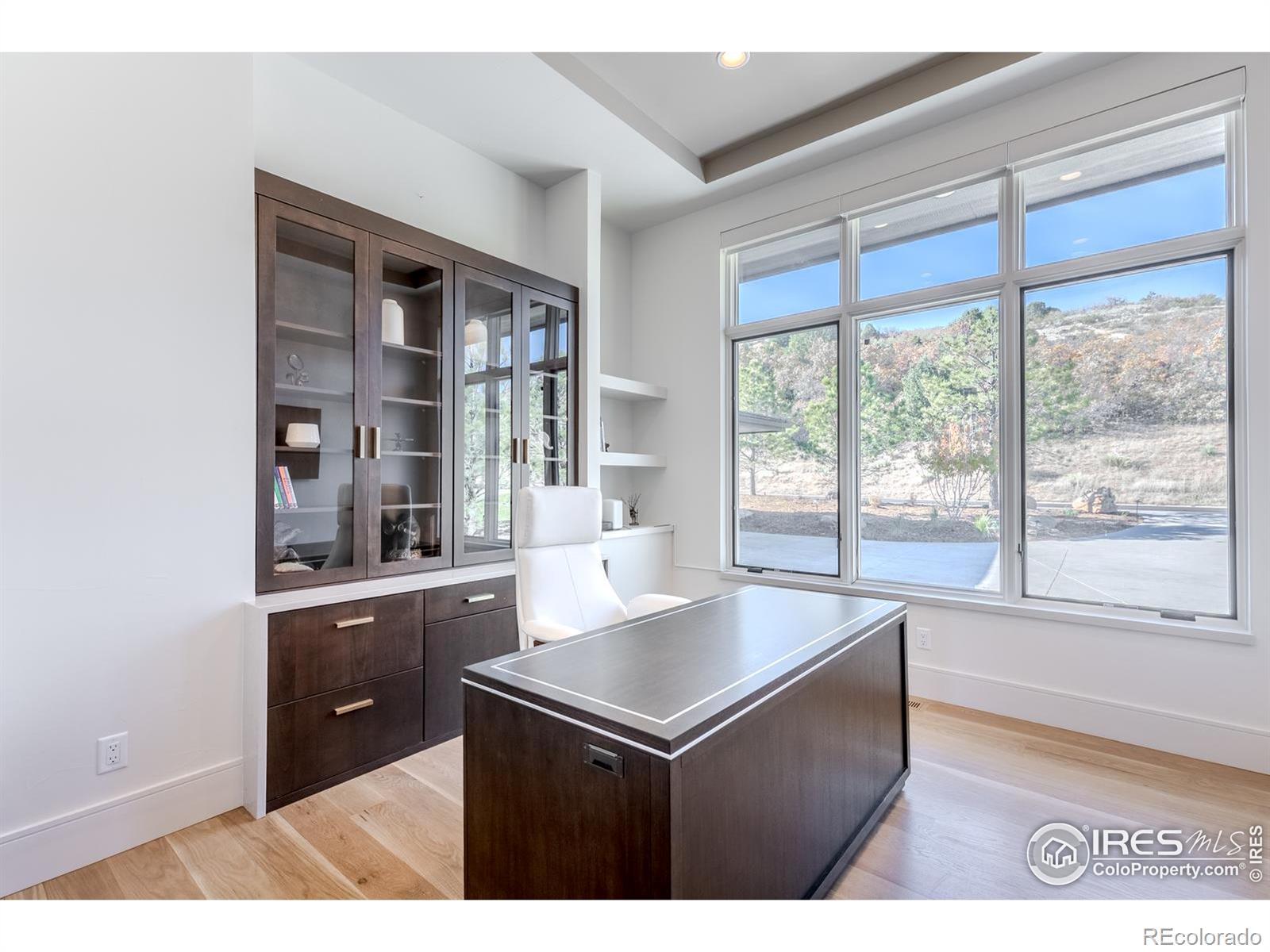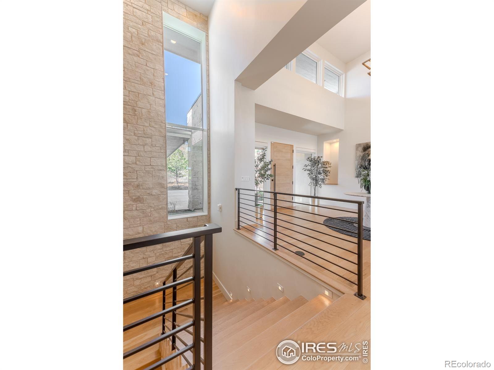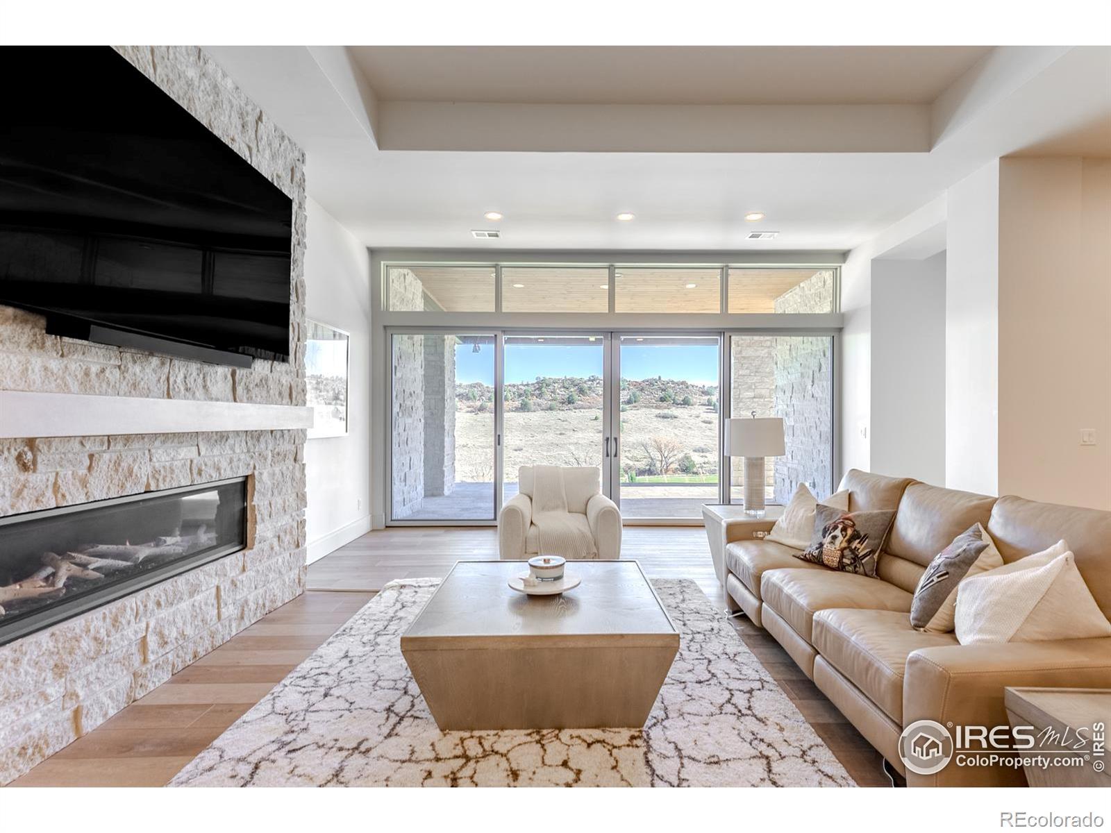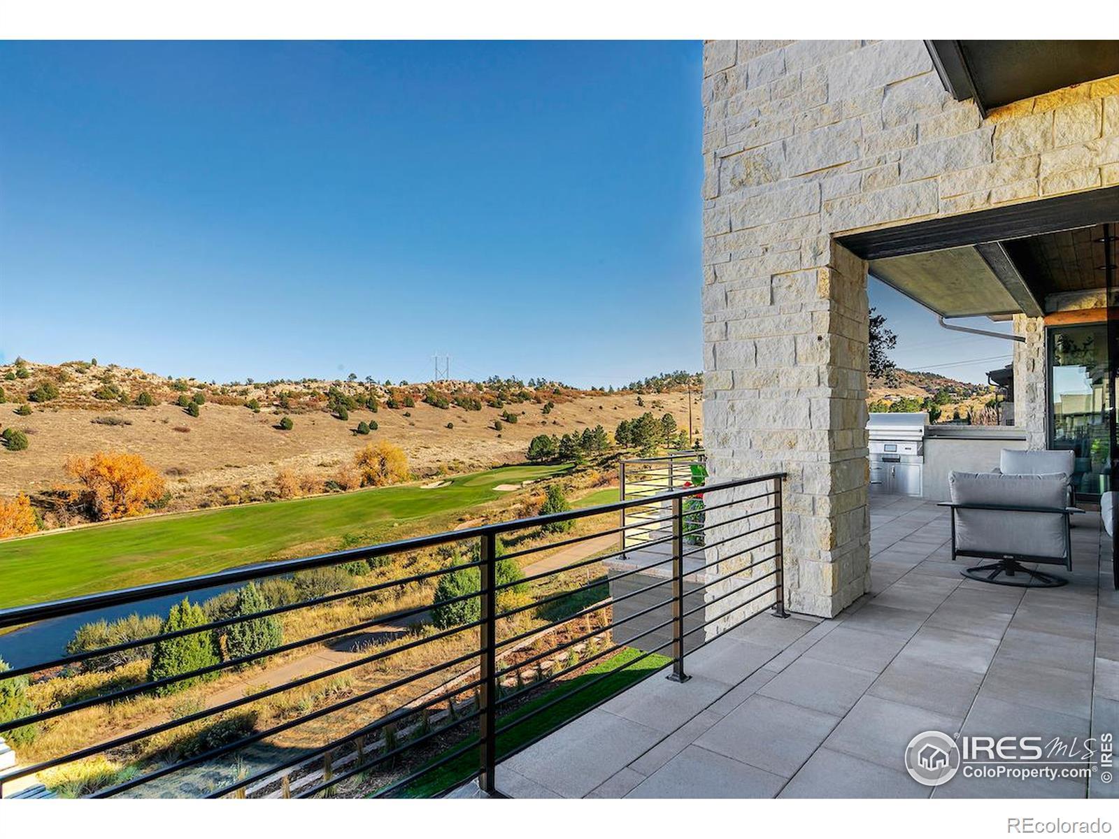 Privately elevated above the 12th and 15th fairways of the award-winning Ravenna Golf Club, this contemporary ranch estate commands an irreplaceable panorama of emerald greens undulating toward sparkling ponds, framed by dramatic red-rock formations and the Front Range beyond. Behind Ravenna's gates lies an elevated lifestyle of wellness, social connection and refined luxury where fine dining, fitness and nature exist in perfect harmony. An architectural statement, the modern facade fuses smooth stucco planes, limestone accents and linear rooflines for a composition both contemporary and timeless. Inside, white oak floors lead through voluminous sun-filled spaces where light and clean lines converge in sophisticated balance. The great room rises twenty feet beneath beamed ceilings and clerestory windows anchored by a sleek fireplace and wall of glass opening to a vast terrace overlooking the golf course and mountains. The kitchen presents as a culinary studio blending an ethereal palette with design precision, featuring a floating white-oak drop ceiling, eleven-foot quartz island, a suite of professional-grade appliances and a wet bar seamlessly connecting to the great room for effortless entertaining. The dining area, office and dramatic powder bath each continue the theme of artistry and polish. The primary suite is a sanctuary of calm with terrace access and breathtaking views, complemented by a spa bath with freestanding tub, poured-concrete vanities and boutique-style dressing closet. A statement staircase guides to the walk out lower level-a world of leisure with a billiards and media lounge, flagstone fireplace and a luminous back-lit quartzite bar with an impressive wine column. Three bedroom suites and a rejuvenating dry sauna room complete the level. Outside, over $100,000 in new landscaping introduces a lush lawn, cascading terraced gardens and a full-length patio offering multiple destinations for gathering and savoring the home's spectacular setting.