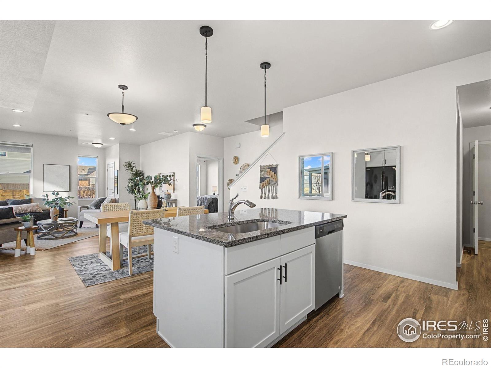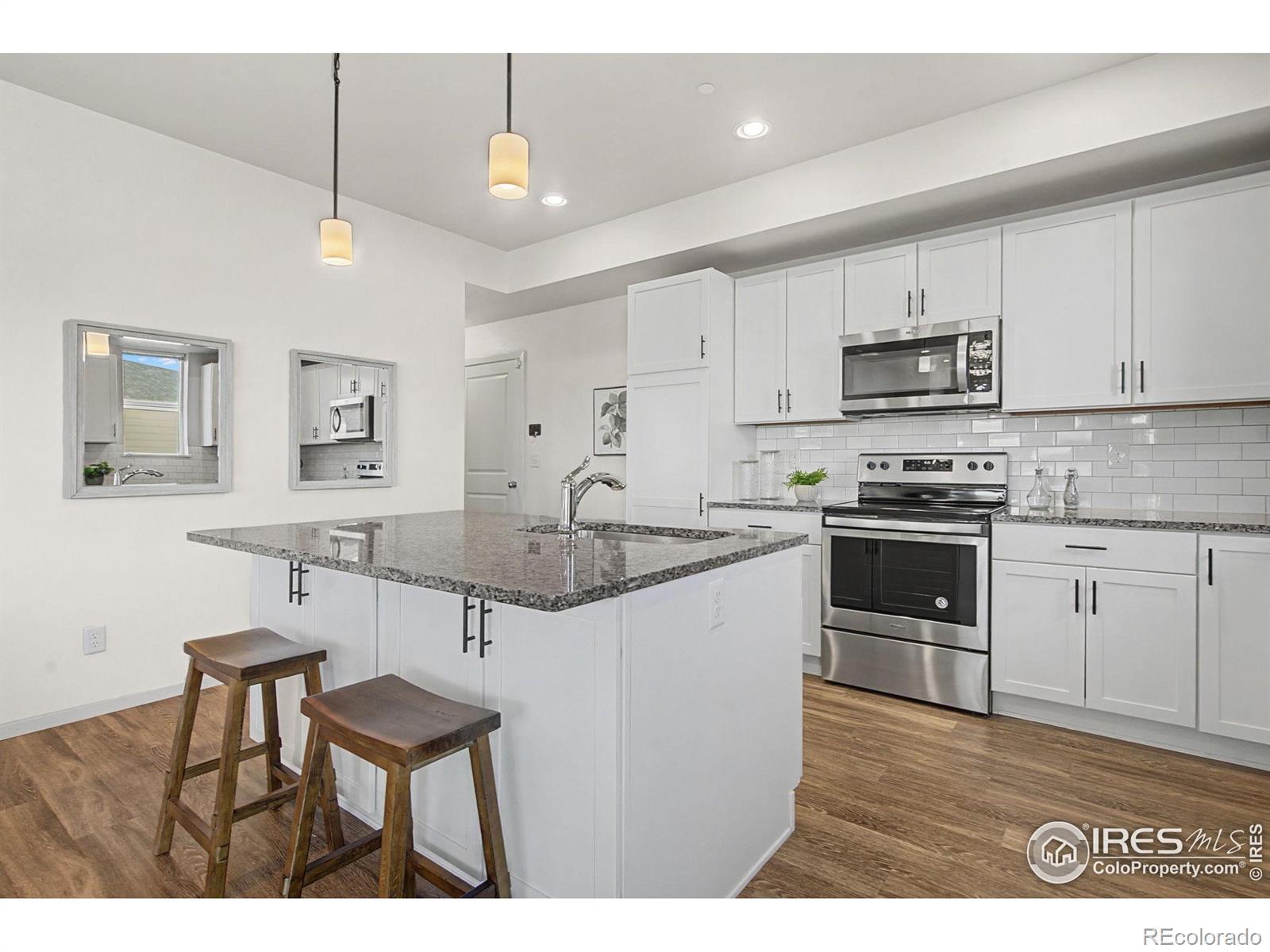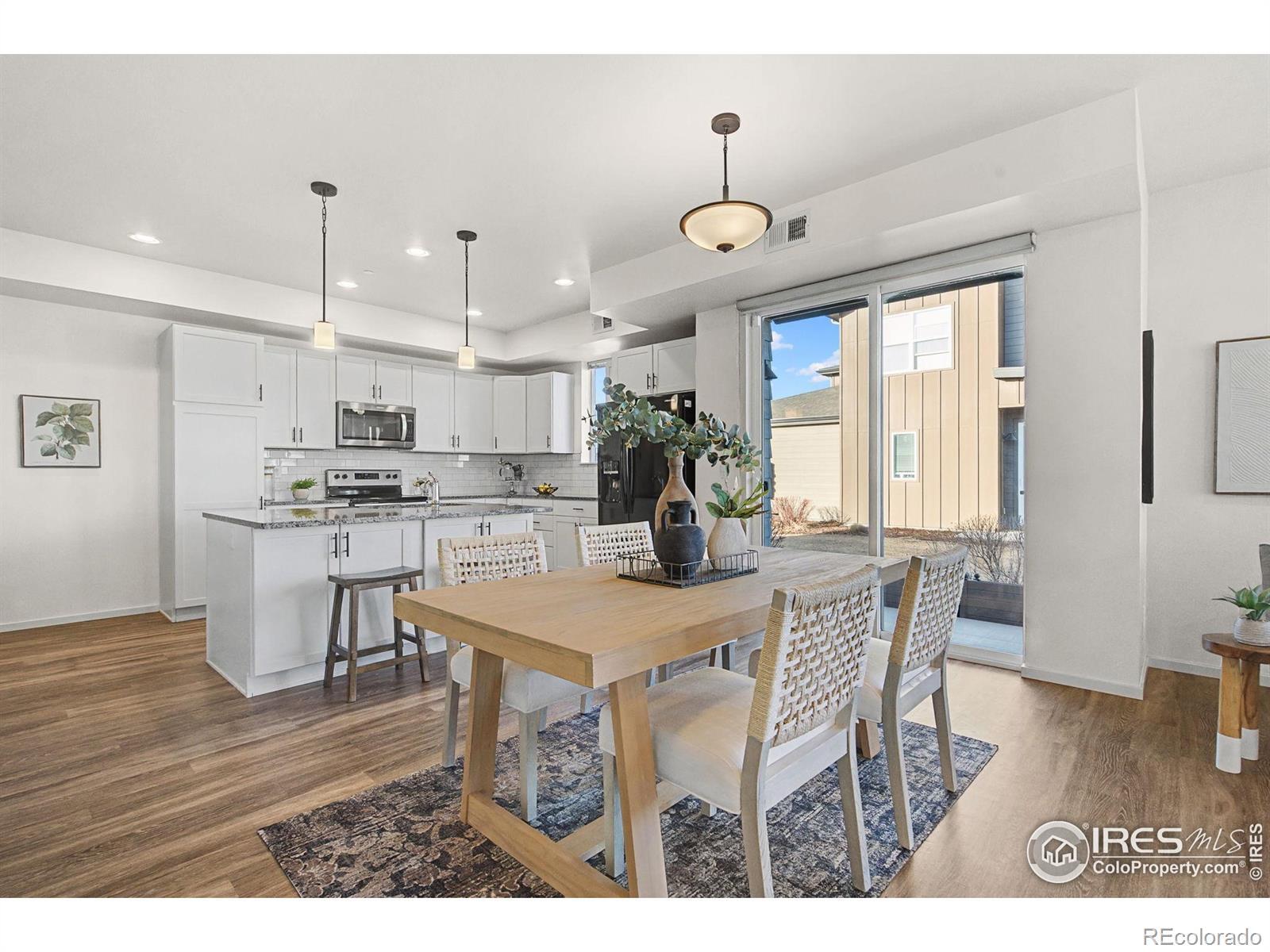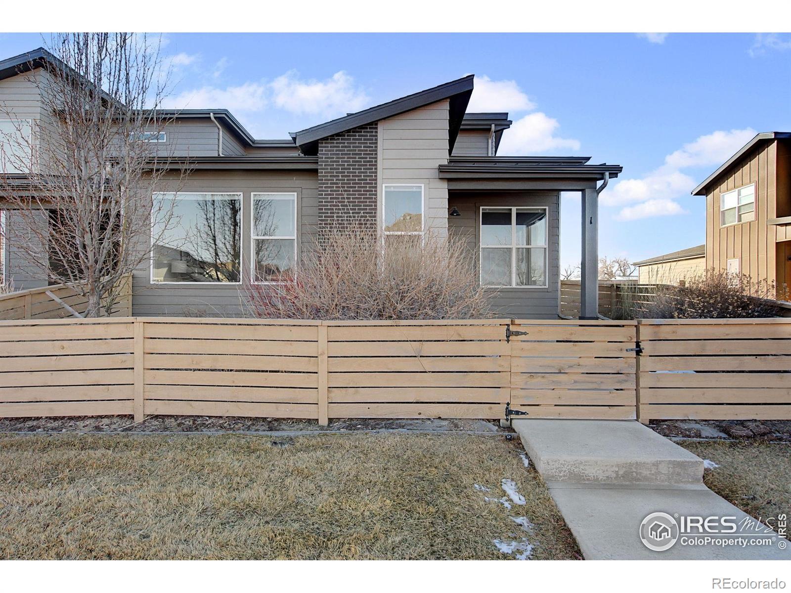 Main-floor primary. End unit. Two features that almost never show up together in Mosaic, and they change how this home lives! The open main level is bright and functional, with luxury vinyl plank flooring throughout and extra windows from the end-unit placement bringing in natural light. The kitchen anchors the space with white cabinetry/black hardware, quartz countertops, and a spacious island, flowing easily into the dining and living areas. The main-floor primary suite adds everyday ease, with a comfortable bath, and well-planned closet space. Upstairs, two additional bedrooms share a full bath and offer flexibility for guests, work-from-home needs, or hobbies. A main-floor washer and dryer add another layer of convenience to daily life. Outdoor space is a true bonus here. A fenced front courtyard provide room for your personalization, while a side patio offers a second outdoor option that feels private and usable. The oversized two-car garage offers extra depth and width, functioning more like a 2.5-car setup, with room for storage, bikes, gear, or a workshop. Located in Mosaic with access to trails, pools, and a future city park, and just minutes from Old Town. If main-floor living and an end-unit layout are priorities, this one deserves a closer look. No Metro District!