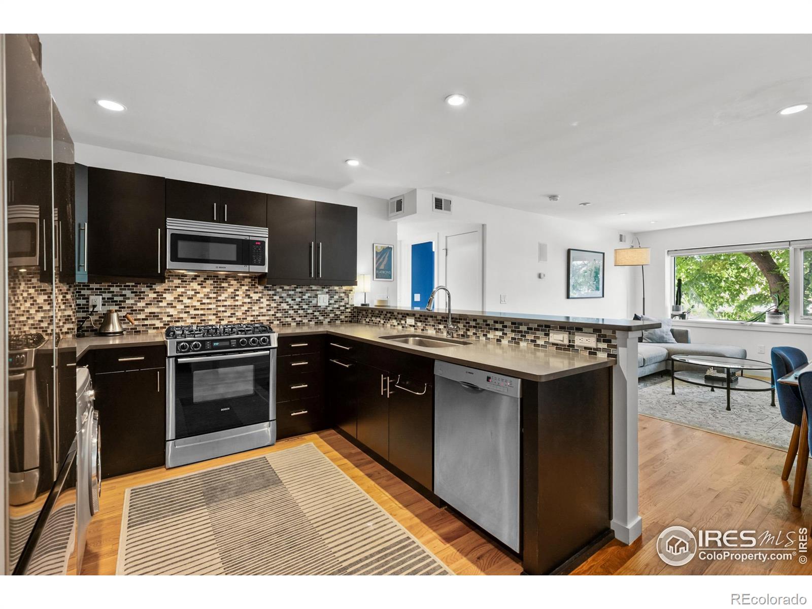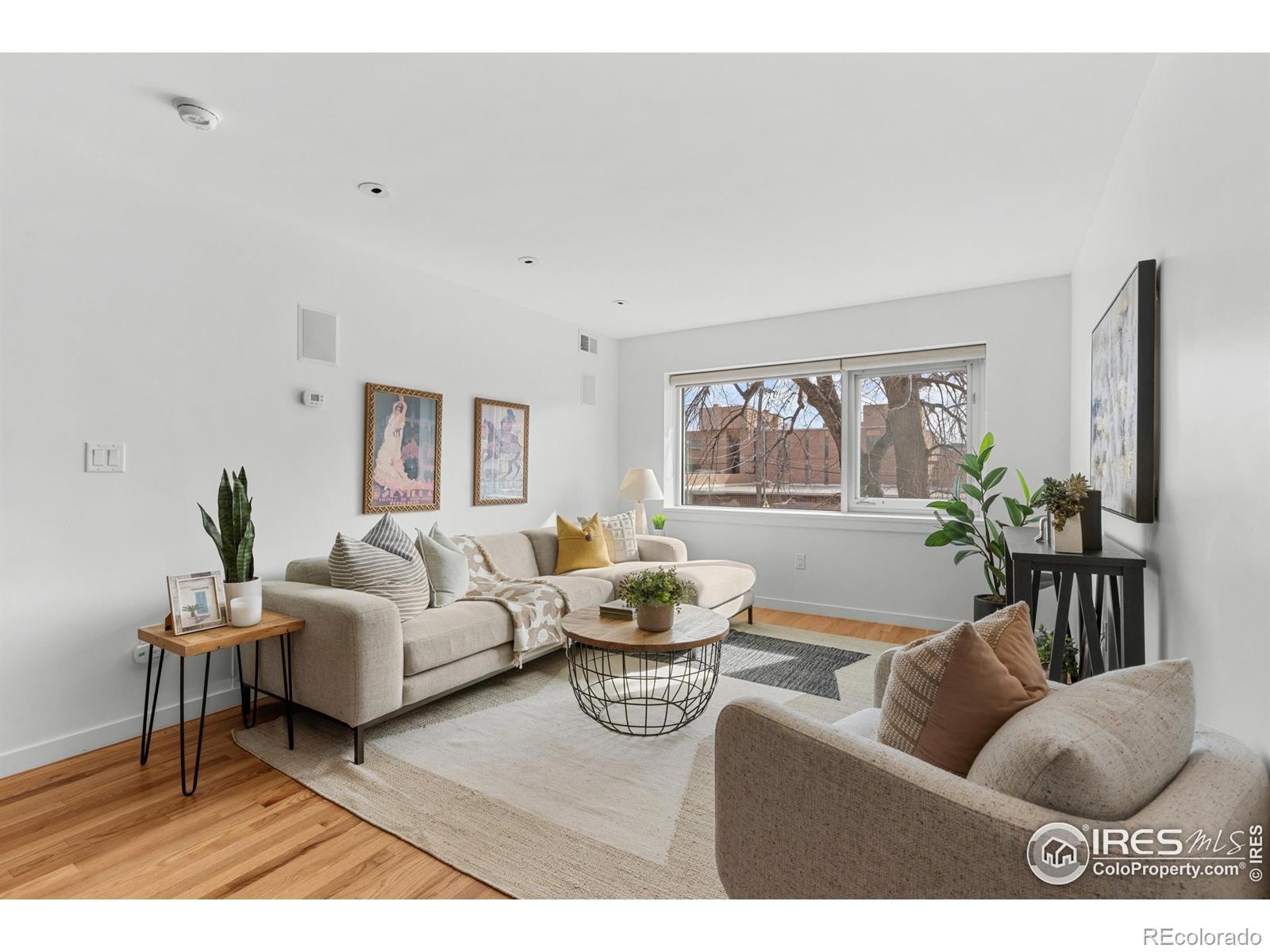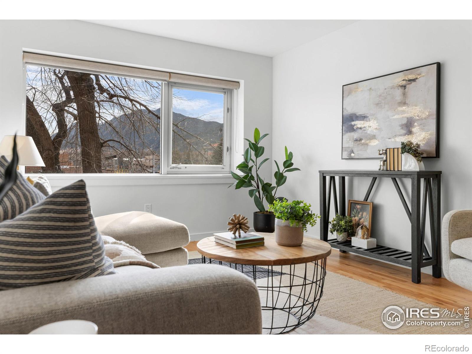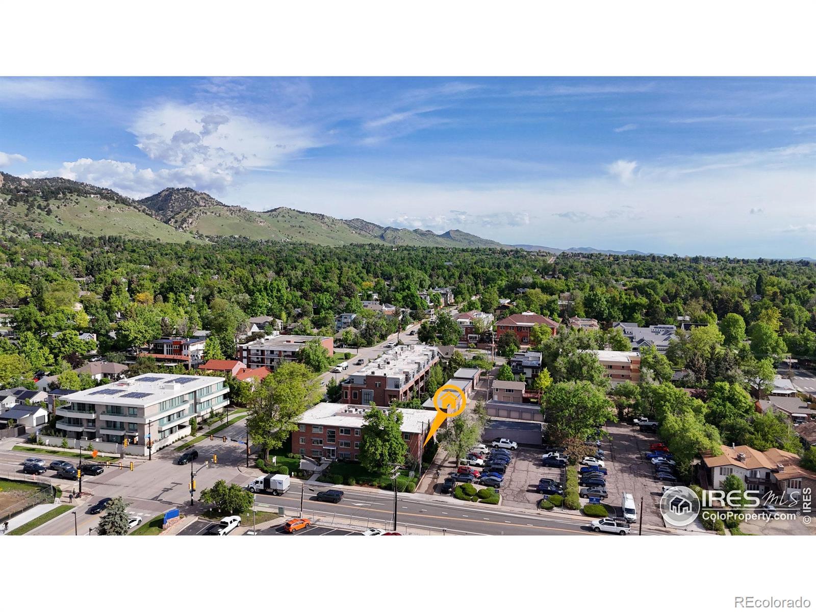 A rare find in North Boulder, this beautifully renovated, sound-proofed 2-bedroom condo offers quiet living just steps from everything Boulder has to offer. Located in a peaceful and secure community, the home includes a detached 1-car garage, central A/C, and a layout designed for everyday ease. The kitchen shines with Bosch and stainless-steel appliances, granite counters, and hardwood flooring, complemented by fresh interior paint, a new refrigerator, built-in speakers, a combo washer/dryer, custom mudroom built-ins, and a newly added pantry. Soundproofing through the unit creates an unexpectedly serene interior. Sunlight pours through large windows, and Winter brings views of the Southern Flatirons. Spend your days enjoying the community patio, BBQ area, garden, and green space, or step outside to Boulder's best amenities: Ideal Market, Sweet Cow, Santos, and Moe's Bagels are just one block away. North Boulder Park is two blocks away, Pearl Street and trail systems are within walking distance, and Mt. Sanitas is minutes from your door. Whether you're looking for a full-time residence or a lock-and-leave escape, this home delivers. Pet-friendly too! HOA includes water, sewer, trash, snow removal, exterior maintenance (including roof), security, and a dedicated storage closet.