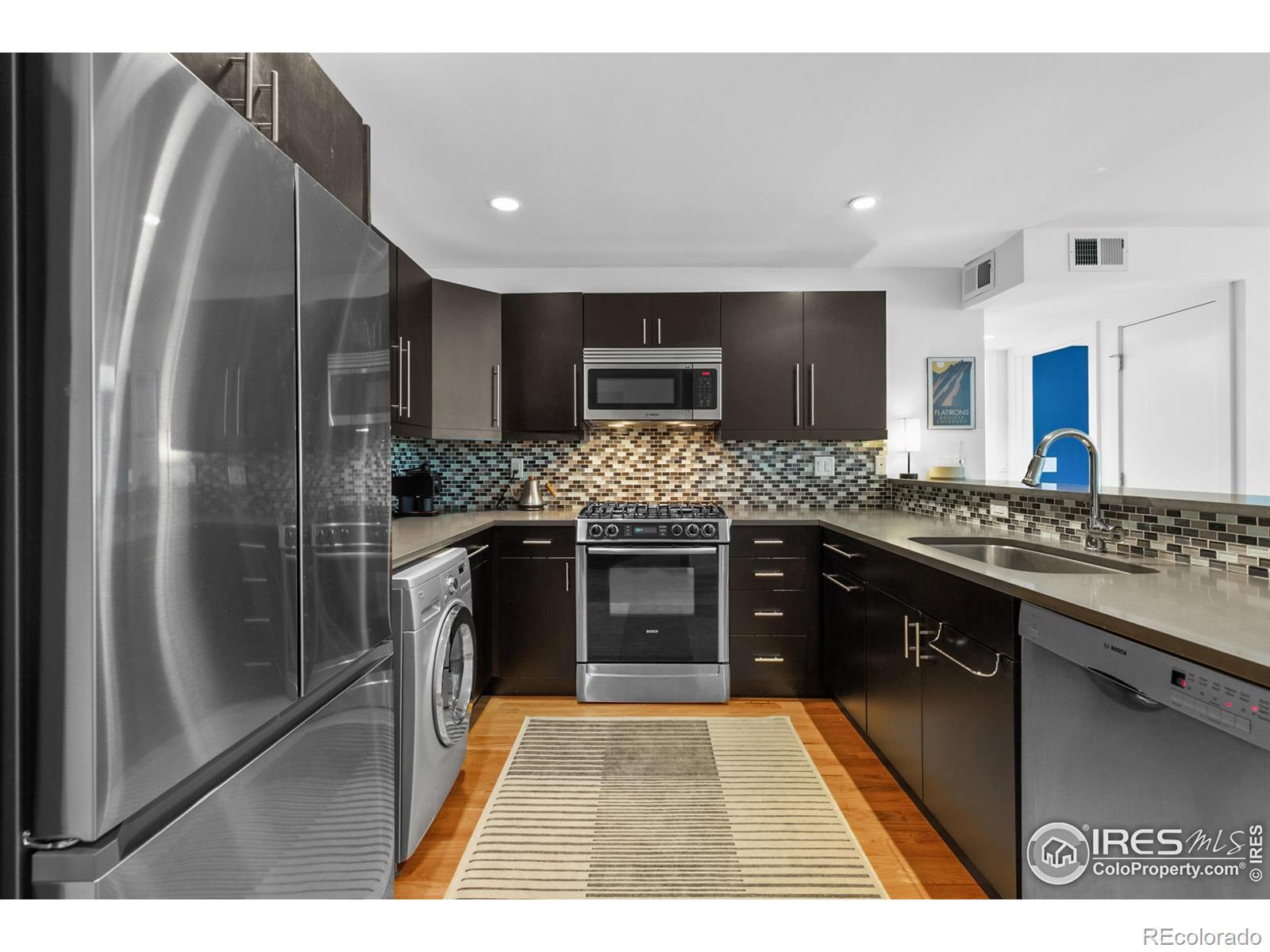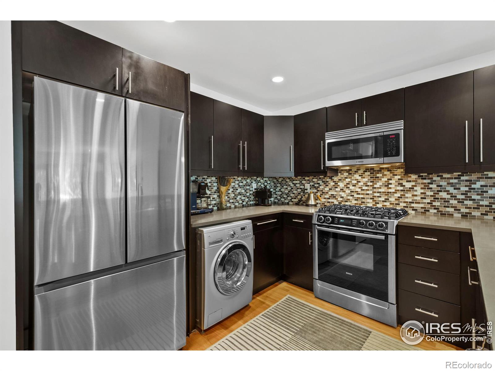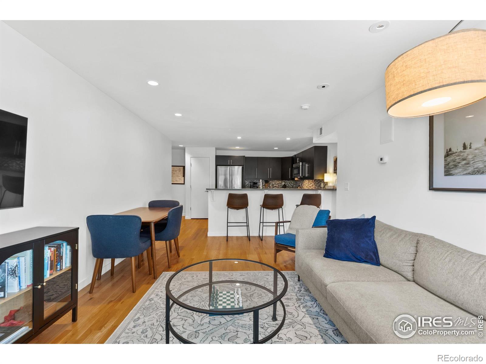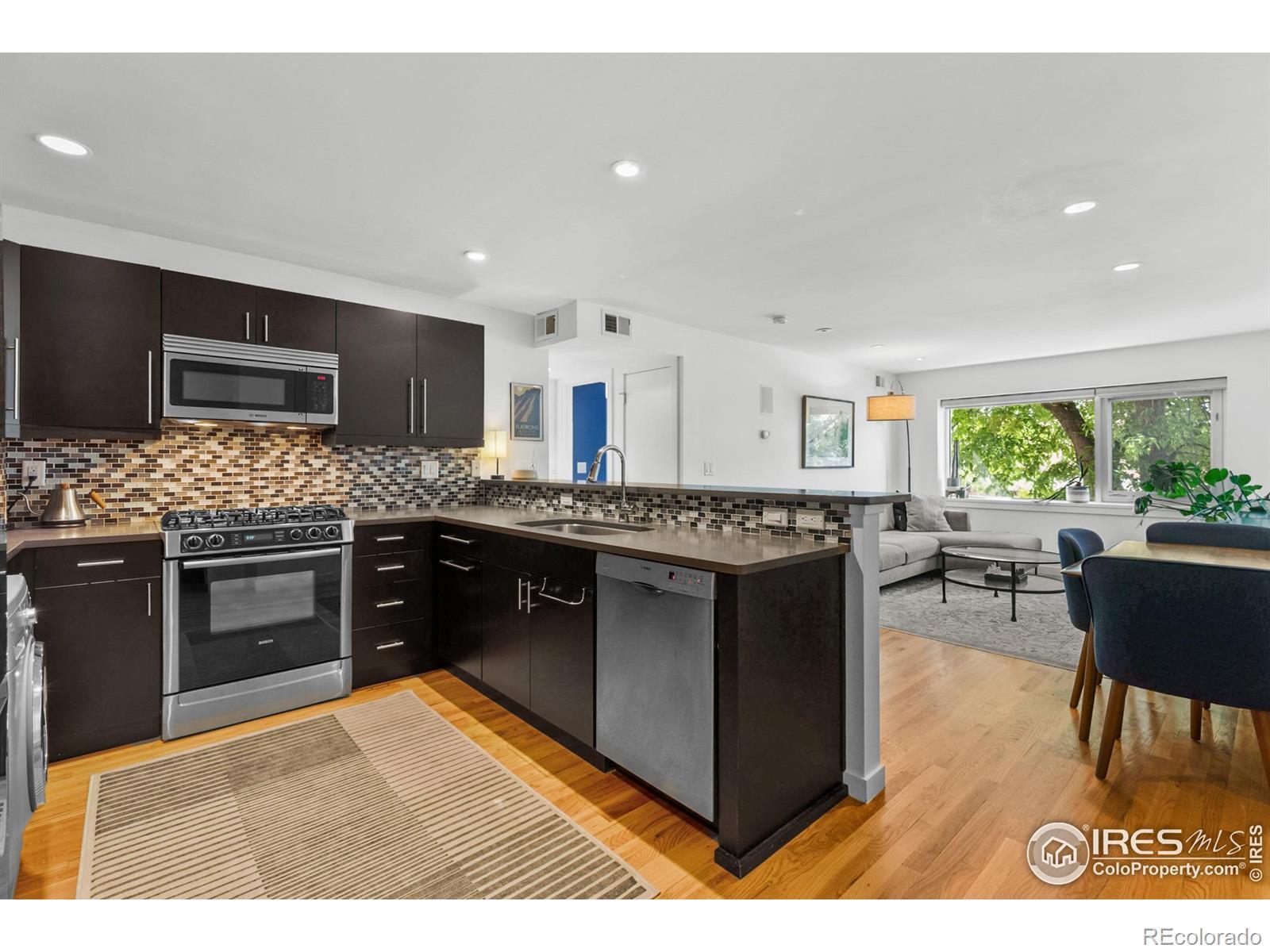 A rare find in North Boulder, this beautifully renovated, sound-proofed 2-bedroom condo offers quiet living just steps from everything Boulder has to offer. Located in a peaceful and secure community, the home includes a detached 1-car garage, central A/C, and a layout designed for everyday ease. The kitchen shines with Bosch and stainless-steel appliances, granite counters, and hardwood flooring, complemented by fresh interior paint, a new refrigerator, built-in speakers, a combo washer/dryer, custom mudroom built-ins, and a newly added pantry. Soundproofing through the unit creates an unexpectedly serene interior. Sunlight pours through large windows, and Winter brings views of the Southern Flatirons. Spend your days enjoying the community patio, BBQ area, garden, and green space, or step outside to Boulder's best amenities: Ideal Market, Sweet Cow, Santos, and Moe's Bagels are just one block away. North Boulder Park is two blocks away, Pearl Street and trail systems are within walking distance, and Mt. Sanitas is minutes from your door. Whether you're looking for a full-time residence or a lock-and-leave escape, this home delivers. Pet-friendly too! HOA includes water, sewer, trash, snow removal, exterior maintenance (including roof), security, and a dedicated storage closet.