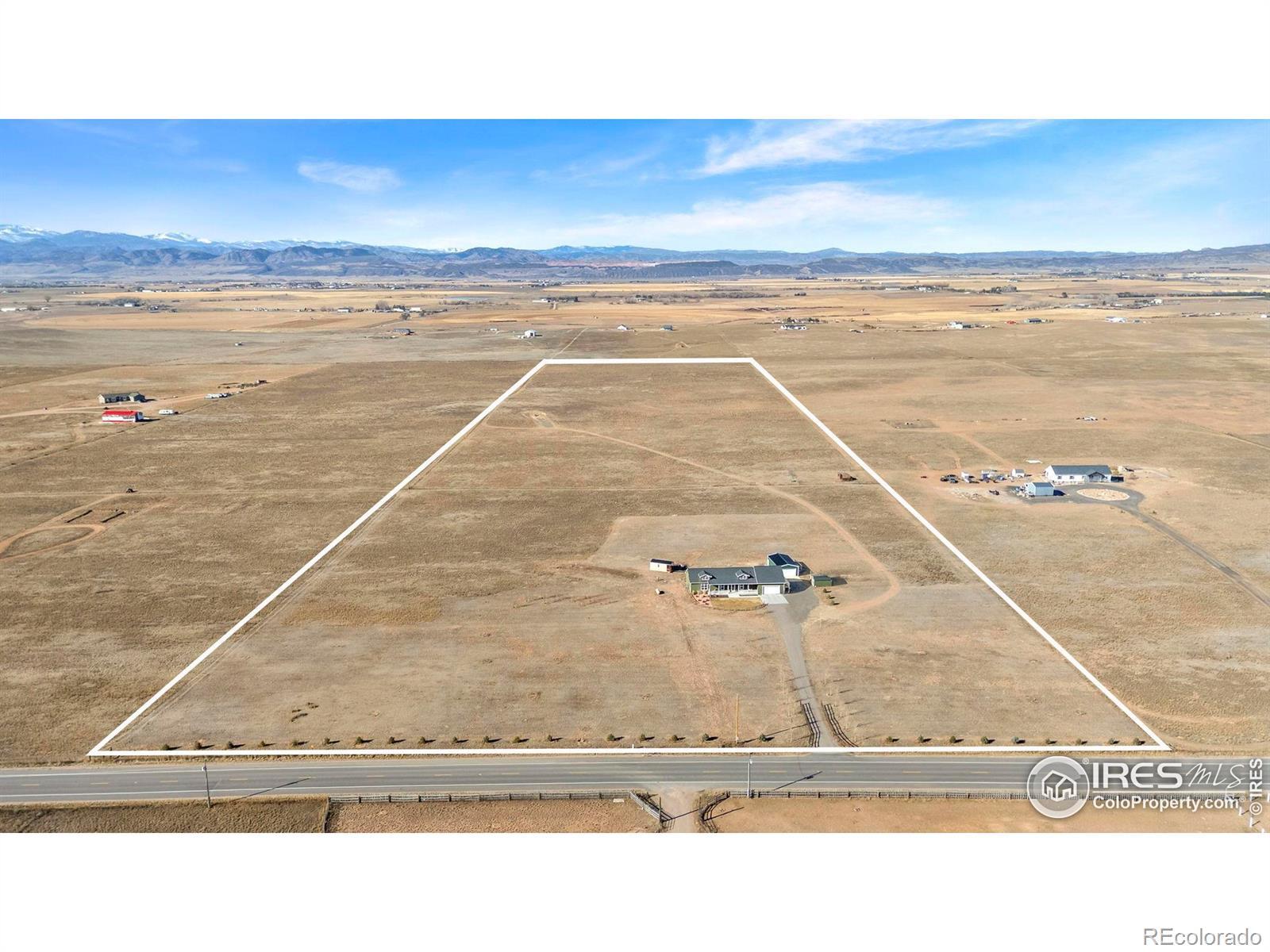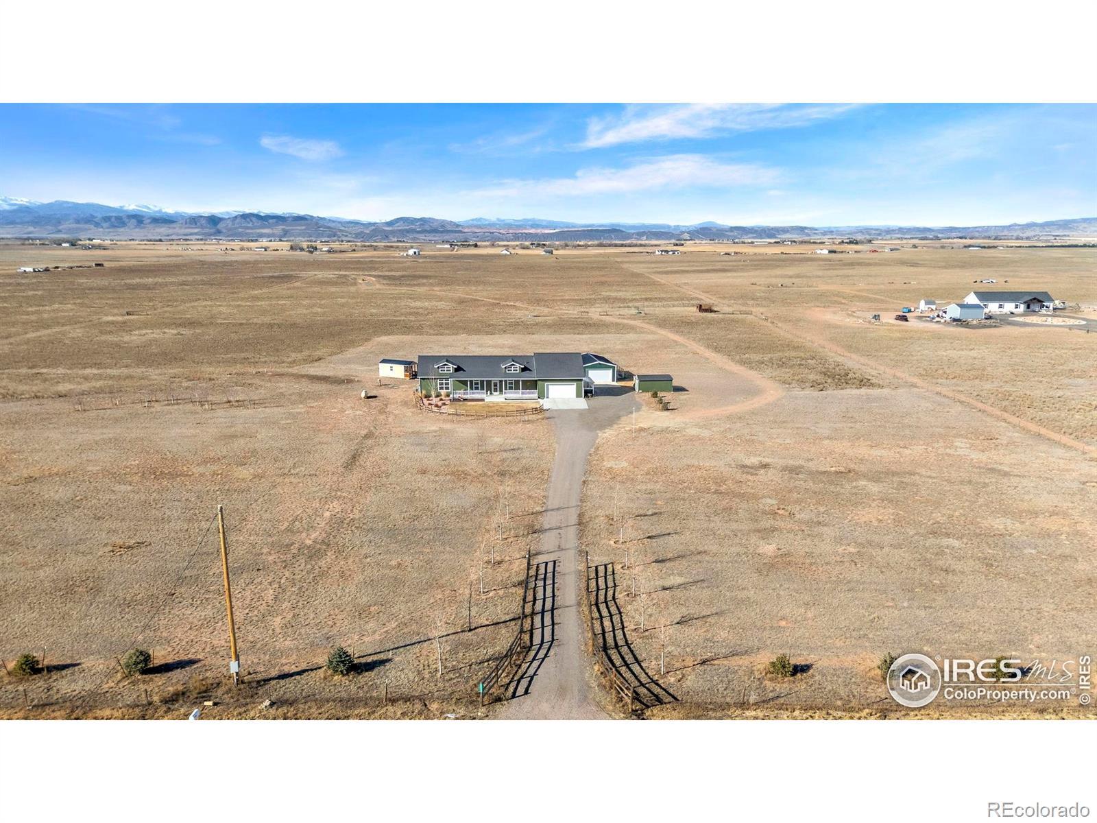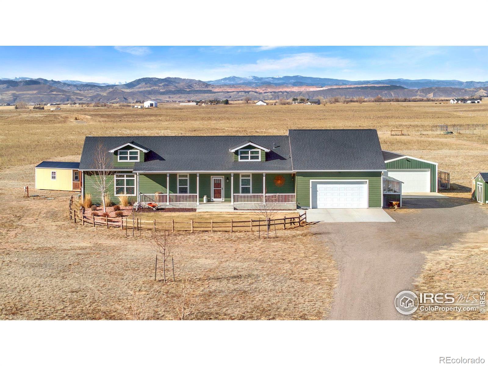 The country acreage you have been waiting for! Located on 40 acres with breathtaking Front Range mountain views, this well-maintained property features a beautifully cared-for 3-bedroom, 2-bath home with an attached 4-car tandem garage, detached 40' x 21' shop, multiple storage buildings, greenhouse, chicken coop and much more. Interior features include a spacious open layout with large windows providing abundant natural light, a gas fireplace, can lighting and upgraded fixtures throughout. The kitchen offers stainless steel appliances, cityscape whitewash cabinetry, ample cabinet space, under-cabinet lighting, a large pantry, custom tile backsplash, drop-in farmhouse sink and a large island with seating. A separate formal dining room features updated lighting. The primary suite includes a large walk-in closet, double sinks, tile shower and tile backsplash. Two additional generously sized bedrooms offer large closets and share a full second bathroom on the main level. The oversized laundry room provides extensive cabinet storage and a dryer bar, with washer and dryer included. The home is in immaculate condition and includes a massive attic storage area with stairway access. The attached insulated 4-car tandem garage is equipped w/220V electricity. Outdoor amenities include a stamped concrete back patio with pergola overlooking the acreage & capturing unparalleled mountain views, along with a large covered front porch perfect for enjoying quiet mornings. An attached greenhouse provides space for gardening or additional storage. Property also includes an 18' x 10' storage shed with covered porch, a 16' x 16' storage shed and a 40' x 21' detached shop with concrete floor-ideal for workshop space, equipment storage or recreational use. Beautifully landscaped grounds feature fruit trees, blue spruce, cottonwood, aspen trees and more, w/drip system and irrigation in place. Rare opportunity to own a versatile 40-acre property w/exceptional views.