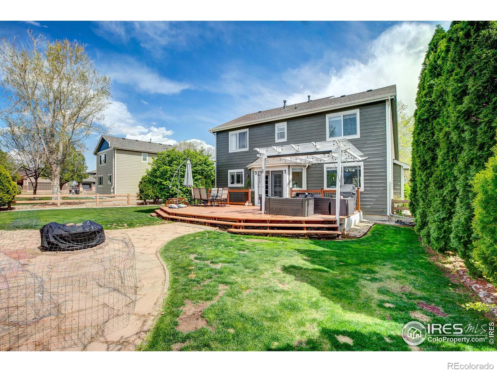 Discover comfort, space, and serenity in this beautifully updated 4-bedroom, 4-bathroom home located in the highly desirable Millennium neighborhood. Set on a private lot with no rear neighbors, this property offers a rare blend of privacy and convenience just minutes from Centerra shopping and top-rated schools. Step inside to soaring vaulted ceilings, rich hardwood floors, and a light-filled layout ideal for everyday living. The remodeled kitchen features granite countertops, custom cabinets, stainless steel appliances and a seamless flow into outside to the expansive patio, re-built with a pergola in 2023. Upstairs, you'll find three generous bedrooms perfect for work or relaxation. The finished basement adds flexibility with a spacious bonus room and a fourth bedroom. All bathrooms have been tastefully upgraded. Step outside to a peaceful backyard retreat framed by mature trees and quaking aspens-ideal for entertaining or unwinding. Spend this summer lounging by the neighborhood pool! Schedule your showing today!