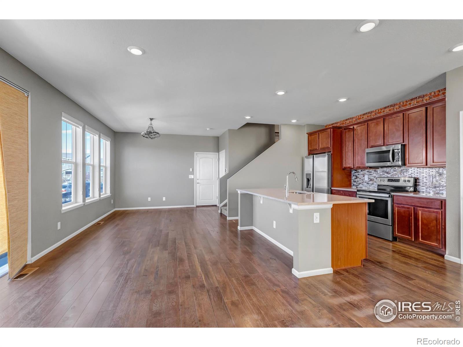 Discover effortless Colorado living in this beautifully updated 4-bedroom, 3.5-bath, two-story paired home with a fully finished basement and bonus room, all set against stunning mountain views. Thoughtfully designed with space, style, and functionality in mind, this home offers room to grow, relax, and entertain. Step inside to an open-concept main level highlighted by luxury plank flooring, modern recessed lighting, and abundant natural light. The chef's kitchen is the heart of the home, featuring stainless steel appliances, a generous center island with casual bar seating, and seamless flow into the dining and living areas-perfect for everyday living or hosting guests. Rustic charm shines through with unique touches including a corrugated steel entry foyer, faux brick accent wallpaper, and added character throughout. Upstairs, retreat to your spacious primary suite complete with a private ensuite bath and walk-in closet. Two additional bedrooms, a versatile loft ideal for a media room, play space, or home gym, and convenient upstairs laundry complete the upper level. The finished basement expands your living space with a bonus room perfect for a home office, guest suite, or recreation area. Enjoy peaceful Colorado mornings and evenings on your private patio with a low-maintenance yard, ideal for BBQs, relaxing, or sipping coffee while taking in the views. Located in the amenity-rich Copperleaf Master Planned Community, you'll enjoy over 100 acres of parks and open space, miles of scenic trails, and access to the Arboretum Pool and Clubhouse. Plus, you're minutes from Aurora Reservoir, shopping, dining, light rail, major commuting routes, and Denver International Airport. All of this within the highly sought-after Cherry Creek School District, nationally recognized for academic excellence.