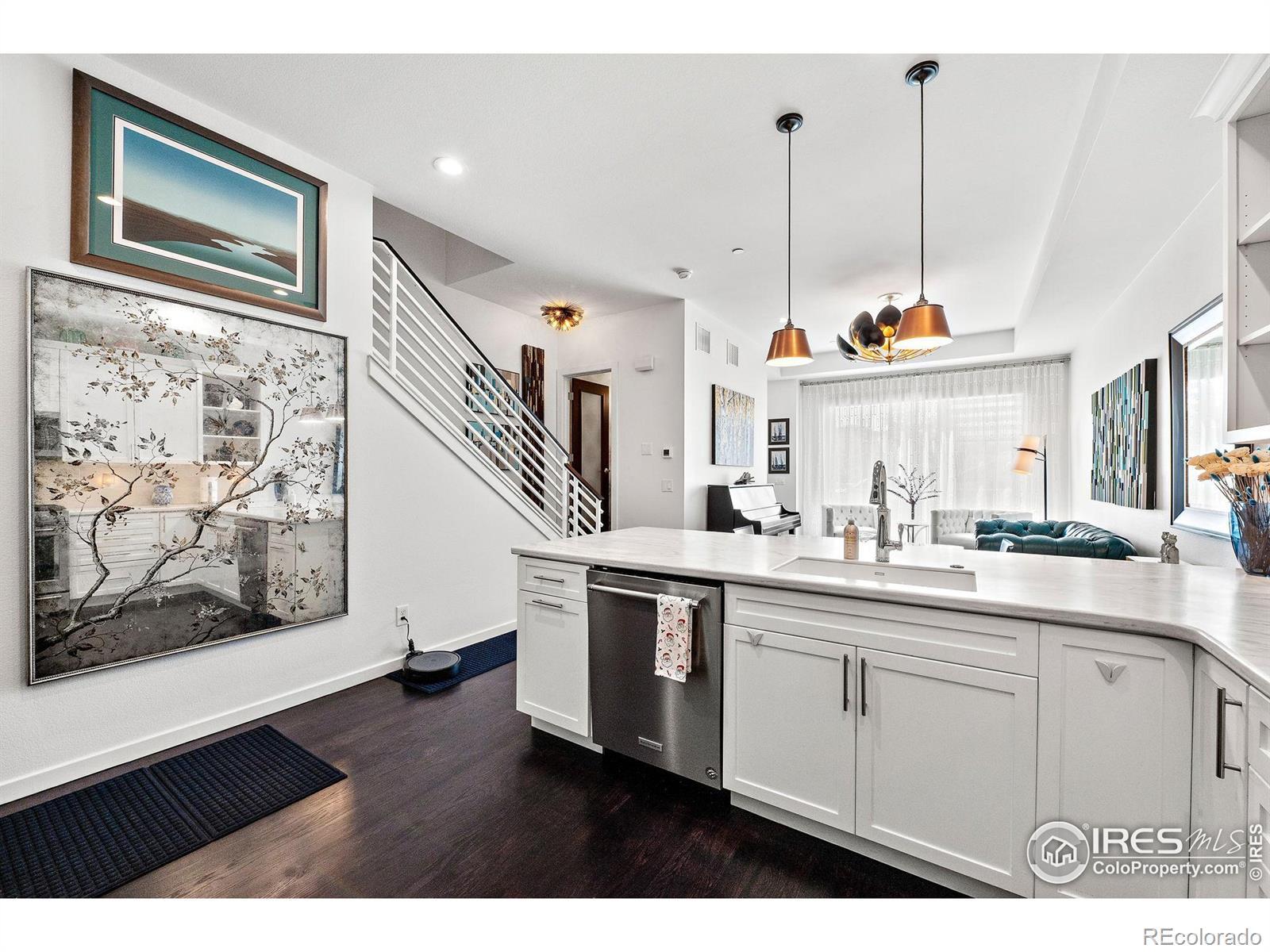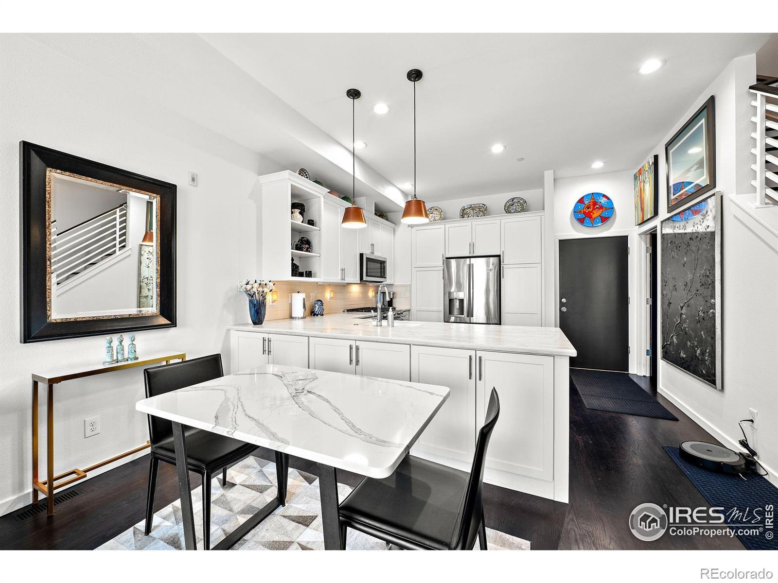 Don't miss this incredible Value in Northfield Village! This stunning, updated 3-bedroom, 4-bath home is loaded with high-end features and custom touches throughout. Enjoy a bright, open kitchen and living room with soaring 10-foot ceilings, large windows, and abundant natural light. The kitchen showcases upgraded cabinetry, countertops, appliances, and designer lighting - perfect for entertaining. Upstairs, you'll find an oversized primary suite with mountain views, a spa-inspired bath, and a custom walk in closet system. There is a second bedroom, as well as a converted loft that now serves as a stylish home office with barn doors. The finished basement offers a third (non-conforming) bedroom with new tile flooring and in-floor heat, a custom mini bar, and plenty of flexible space. This home shines with fresh paint, refinished hardwood floors, designer wallpaper, and 5 thoughtfully designed Elfa closets which elevate the home's livability. There is an attached 2-car garage. Step outside to a private enclosed courtyard, located across from a park with west-facing mountain views and in a dog-friendly neighborhood with multiple parks and endless biking and walking trails right out the door - this home truly has it all.