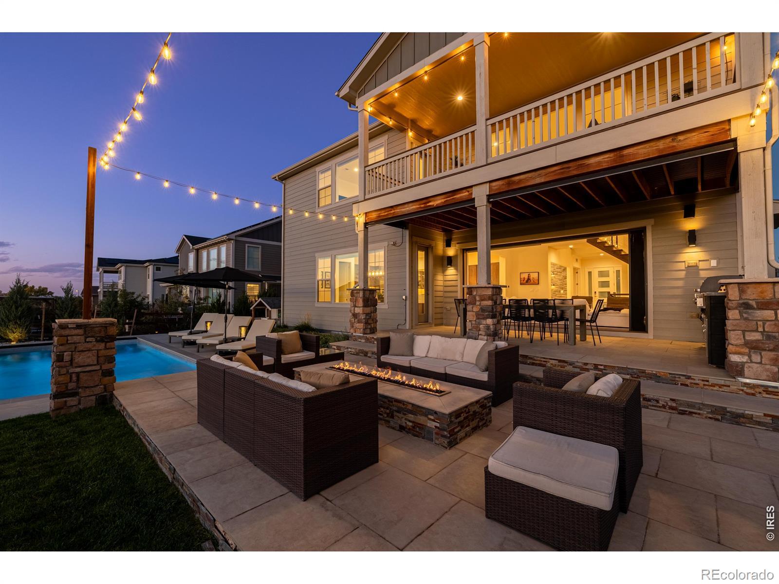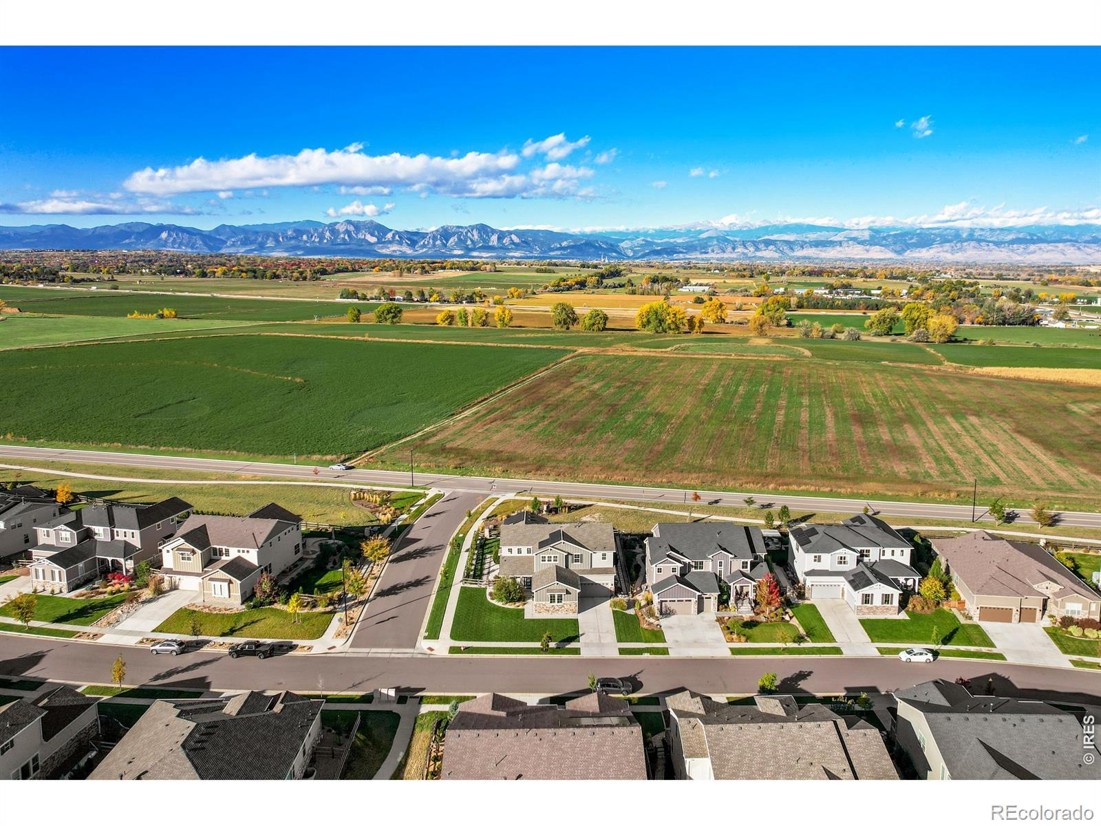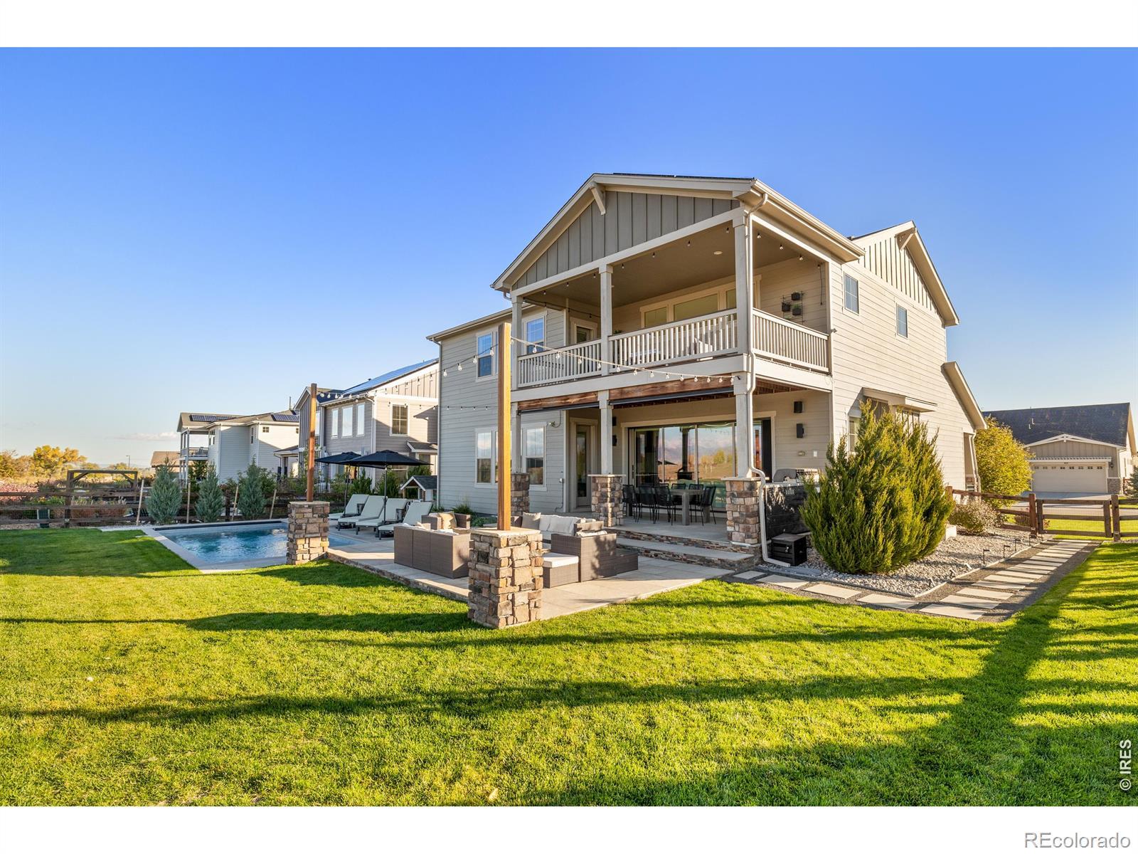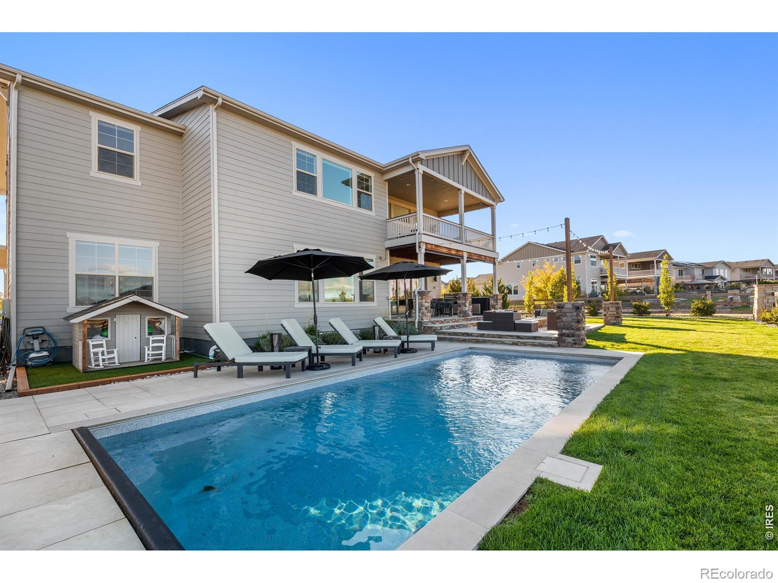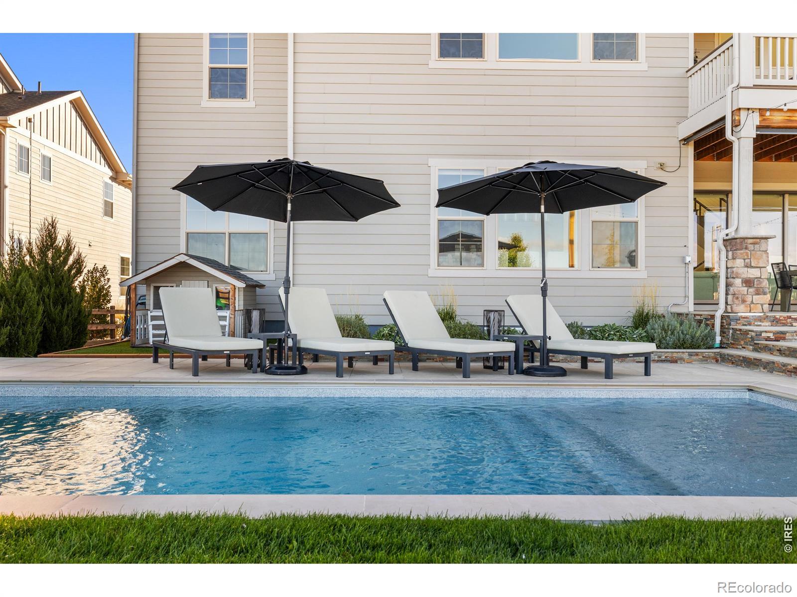 Turnkey luxury living awaits in this sun-drenched, newer-construction Erie 4BD/3.5BA featuring expansive, upgraded interiors and poolside outdoor space. Inside this 3,954SF home, soaring ceilings and oversized windows create a bright and airy ambiance, while crisp white walls, wide-plank flooring and a soaring staircase bordered by metal-and-wire handrails underscore the contemporary aesthetic. The double-height living room features a gas fireplace, floating built-ins and double exposures. Chefs will love the gourmet open kitchen's top-of-the-line KitchenAid appliance suite, custom cabinetry, breakfast nook, and island dining counter, topped by Restoration Hardware pendants. A walk-in pantry adds storage, while a butler's pantry with a wine refrigerator leads to the formal dining room. Off the kitchen, a secondary suite is perfect for guests. A home office, powder room and mudroom complete the well-planned main level. From the living room, oversized sliders tempt you outdoors. Enjoy barbecues on the covered patio flanked by a summer kitchen, or warm yourself near the built-in gas fire pit. Ahead, the heated saltwater pool is surrounded by a sun deck, manicured landscaping and unimpeded mountain views. Head to the upper level to discover a large family room with views over the living room. The stunning primary suite boasts a king-size bedroom, private deck, two extra-large custom closets and an en suite spa bathroom. Two spacious secondary bedrooms share a Jack-and-Jill bathroom, while a large utility room with a GE washer-dryer makes laundry day a breeze. A 2,070SF unfinished lower level provides room to grow, and an oversized four-car garage adds plenty of off-street parking. Located in Flatiron Meadows, a peaceful enclave featuring foothills views, walking/biking paths, parks and easy access to Erie and Louisville amenities and BVSD schools, including nearby Meadowlark School. Discover serene country living just 20 minutes from Boulder and 40 minutes from Denver.