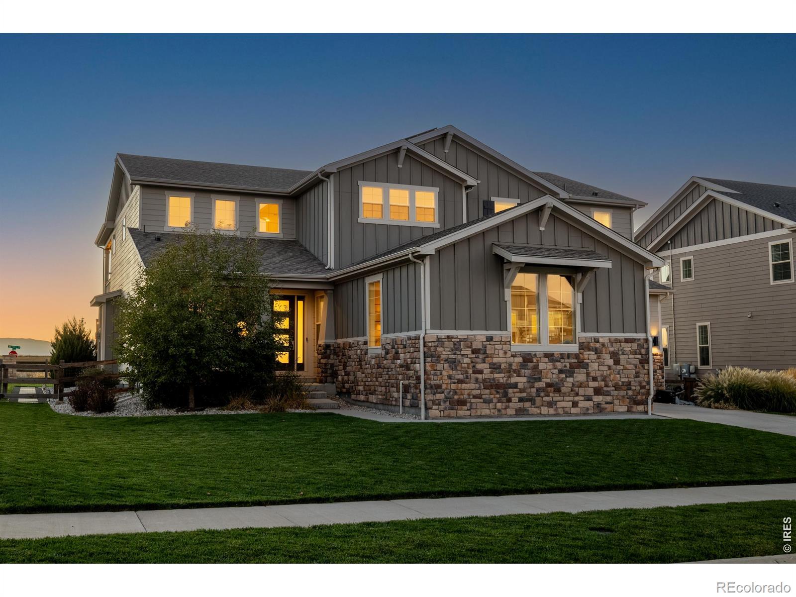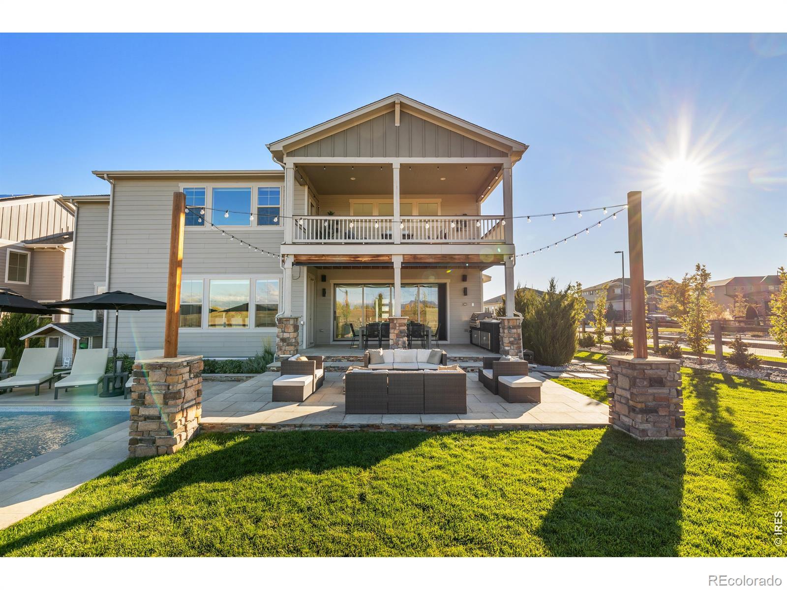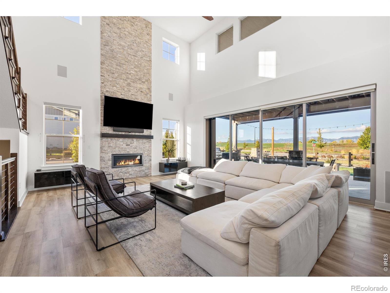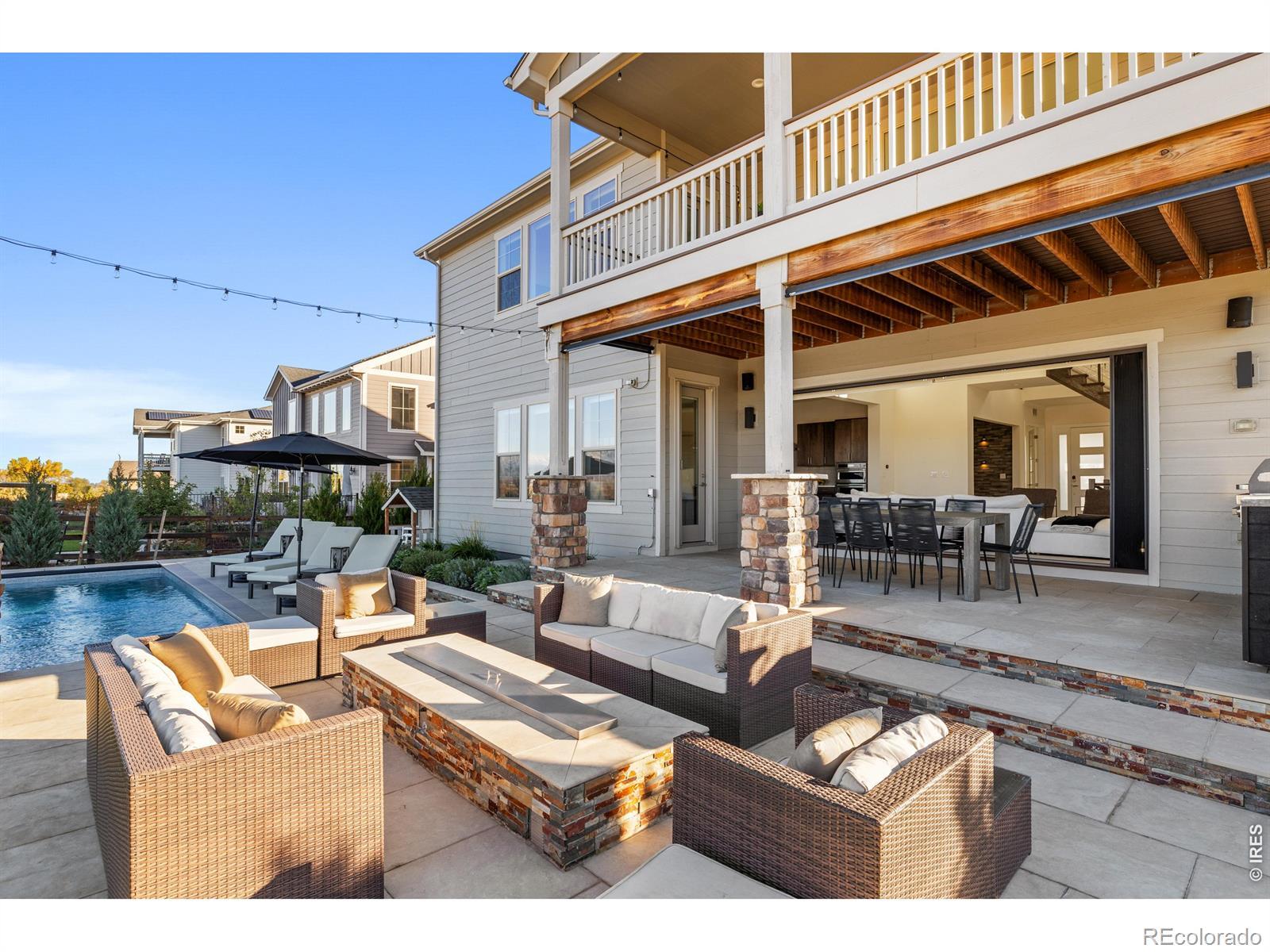 Turnkey luxury living awaits in this sun-drenched, newer-construction Erie 4BD/3.5BA featuring expansive, upgraded interiors and poolside outdoor space. Inside this 3,954SF home, soaring ceilings and oversized windows create a bright and airy ambiance, while crisp white walls, wide-plank flooring and a soaring staircase bordered by metal-and-wire handrails underscore the contemporary aesthetic. The double-height living room features a gas fireplace, floating built-ins and double exposures. Chefs will love the gourmet open kitchen's top-of-the-line KitchenAid appliance suite, custom cabinetry, breakfast nook, and island dining counter, topped by Restoration Hardware pendants. A walk-in pantry adds storage, while a butler's pantry with a wine refrigerator leads to the formal dining room. Off the kitchen, a secondary suite is perfect for guests. A home office, powder room and mudroom complete the well-planned main level. From the living room, oversized sliders tempt you outdoors. Enjoy barbecues on the covered patio flanked by a summer kitchen, or warm yourself near the built-in gas fire pit. Ahead, the heated saltwater pool is surrounded by a sun deck, manicured landscaping and unimpeded mountain views. Head to the upper level to discover a large family room with views over the living room. The stunning primary suite boasts a king-size bedroom, private deck, two extra-large custom closets and an en suite spa bathroom. Two spacious secondary bedrooms share a Jack-and-Jill bathroom, while a large utility room with a GE washer-dryer makes laundry day a breeze. A 2,070SF unfinished lower level provides room to grow, and an oversized four-car garage adds plenty of off-street parking. Located in Flatiron Meadows, a peaceful enclave featuring foothills views, walking/biking paths, parks and easy access to Erie and Louisville amenities and BVSD schools, including nearby Meadowlark School. Discover serene country living just 20 minutes from Boulder and 40 minutes from Denver.