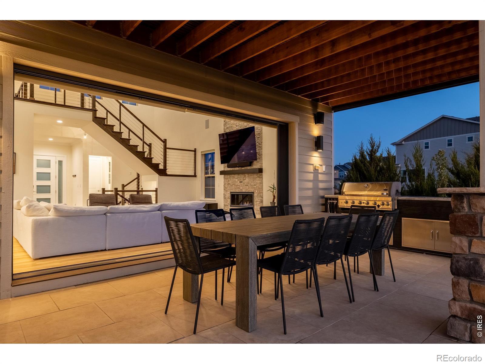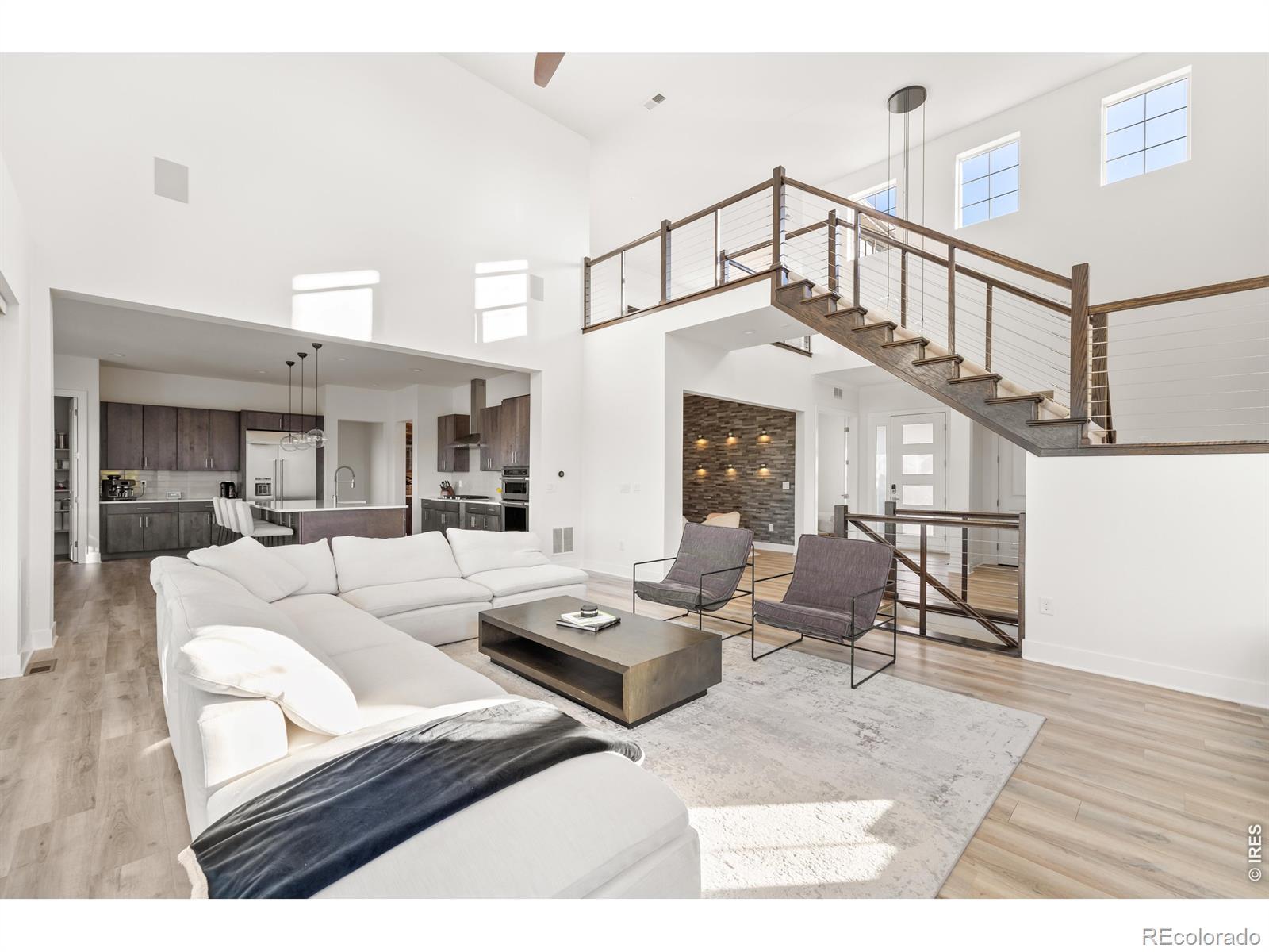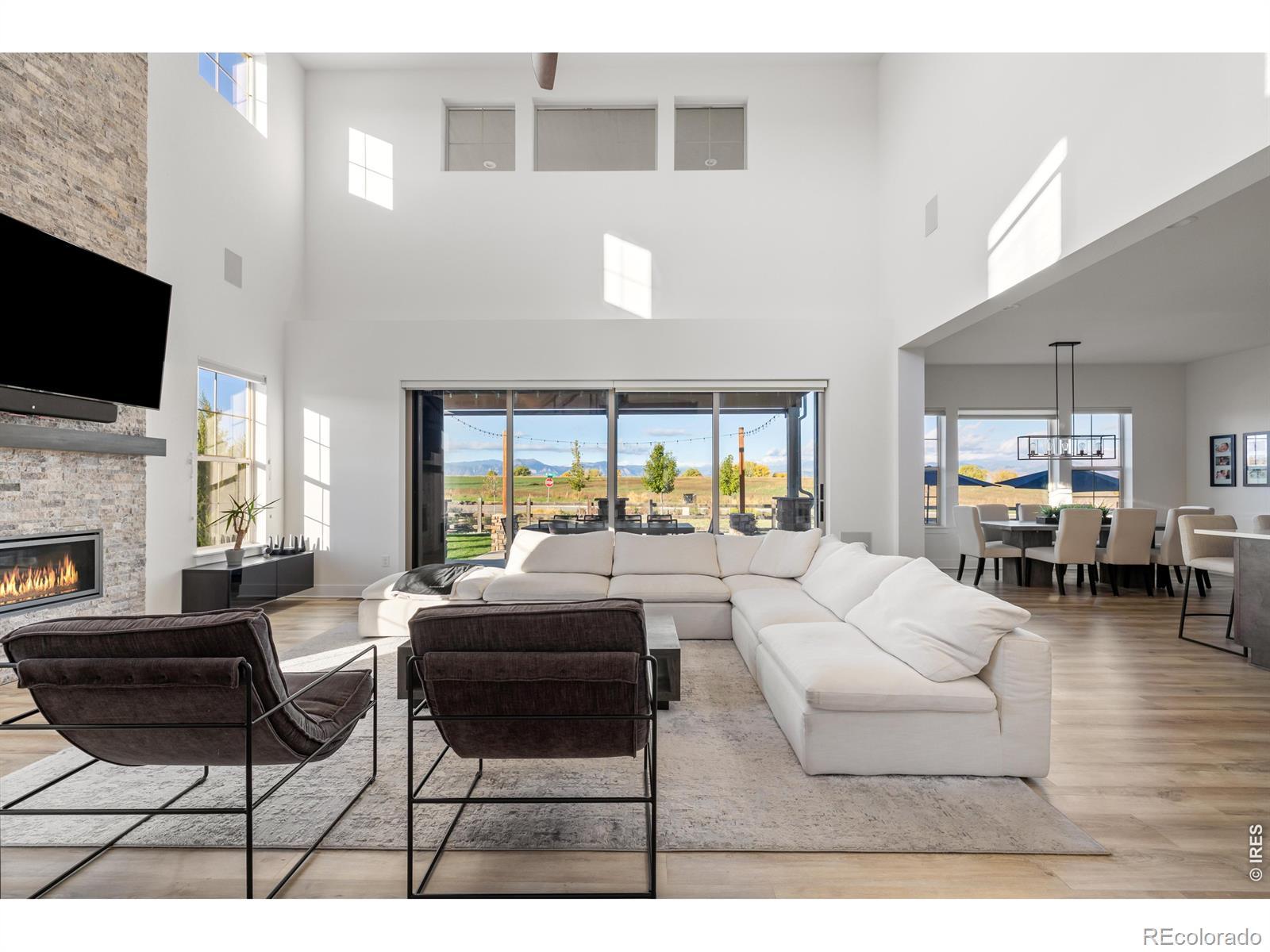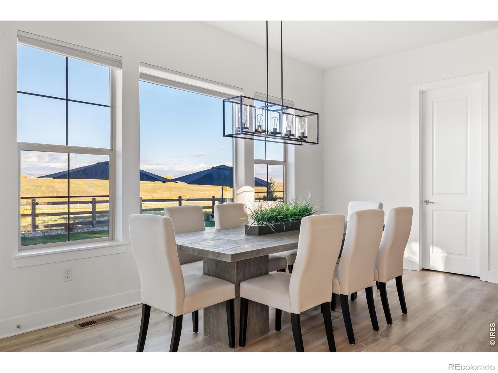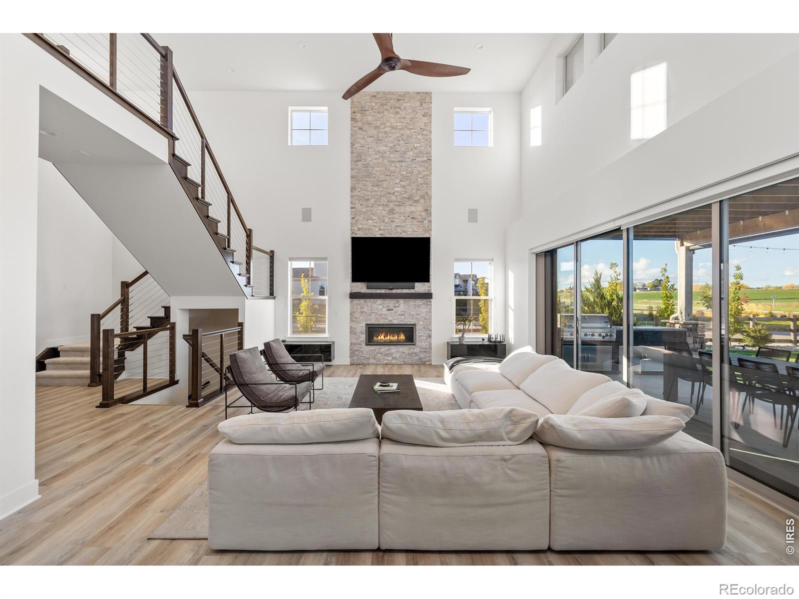 Turnkey luxury living awaits in this sun-drenched, newer-construction Erie 4BD/3.5BA featuring expansive, upgraded interiors and poolside outdoor space. Inside this 3,954SF home, soaring ceilings and oversized windows create a bright and airy ambiance, while crisp white walls, wide-plank flooring and a soaring staircase bordered by metal-and-wire handrails underscore the contemporary aesthetic. The double-height living room features a gas fireplace, floating built-ins and double exposures. Chefs will love the gourmet open kitchen's top-of-the-line KitchenAid appliance suite, custom cabinetry, breakfast nook, and island dining counter, topped by Restoration Hardware pendants. A walk-in pantry adds storage, while a butler's pantry with a wine refrigerator leads to the formal dining room. Off the kitchen, a secondary suite is perfect for guests. A home office, powder room and mudroom complete the well-planned main level. From the living room, oversized sliders tempt you outdoors. Enjoy barbecues on the covered patio flanked by a summer kitchen, or warm yourself near the built-in gas fire pit. Ahead, the heated saltwater pool is surrounded by a sun deck, manicured landscaping and unimpeded mountain views. Head to the upper level to discover a large family room with views over the living room. The stunning primary suite boasts a king-size bedroom, private deck, two extra-large custom closets and an en suite spa bathroom. Two spacious secondary bedrooms share a Jack-and-Jill bathroom, while a large utility room with a GE washer-dryer makes laundry day a breeze. A 2,070SF unfinished lower level provides room to grow, and an oversized four-car garage adds plenty of off-street parking. Located in Flatiron Meadows, a peaceful enclave featuring foothills views, walking/biking paths, parks and easy access to Erie and Louisville amenities and BVSD schools, including nearby Meadowlark School. Discover serene country living just 20 minutes from Boulder and 40 minutes from Denver.