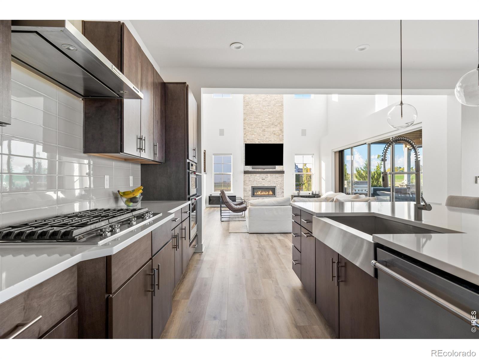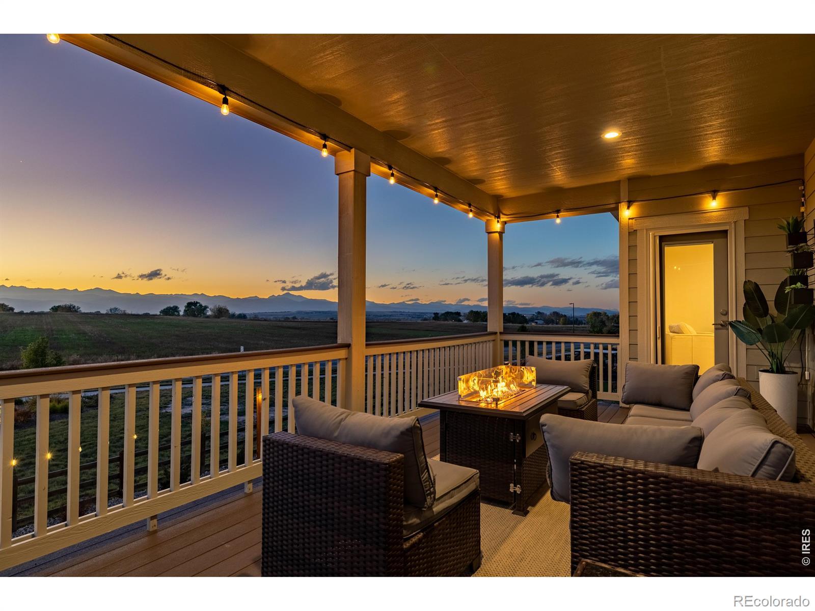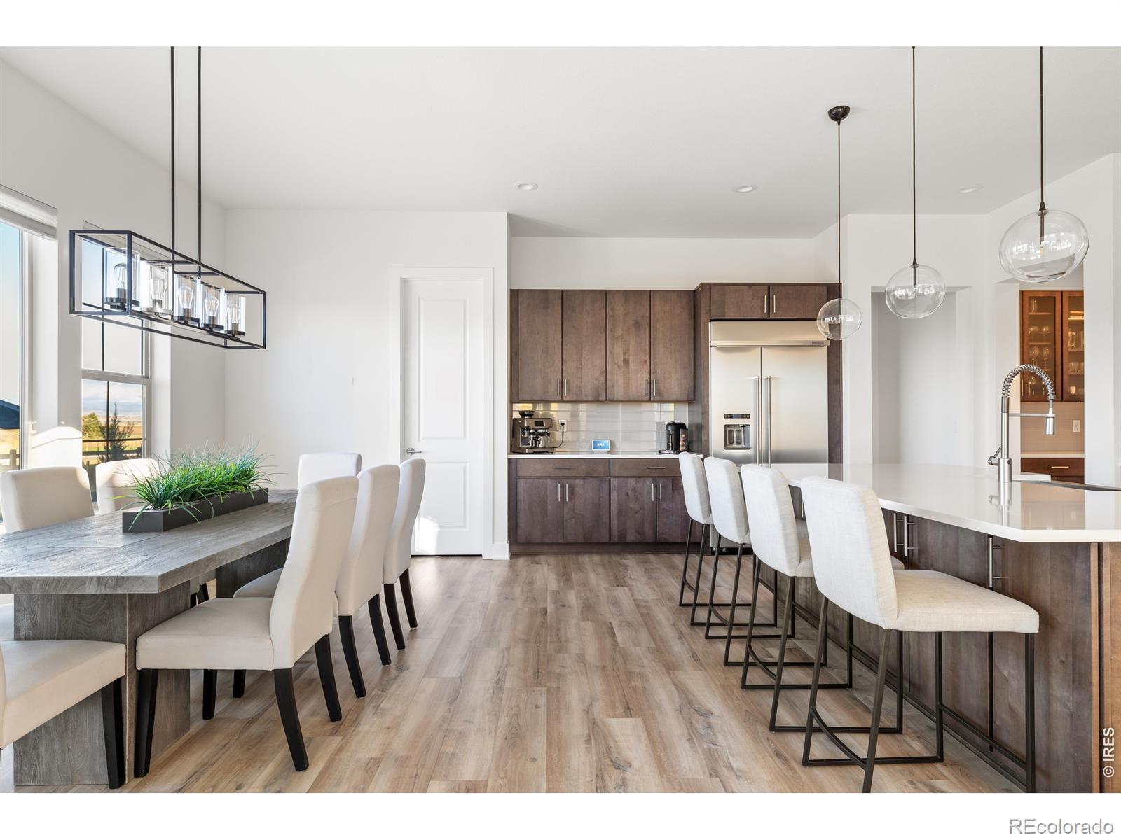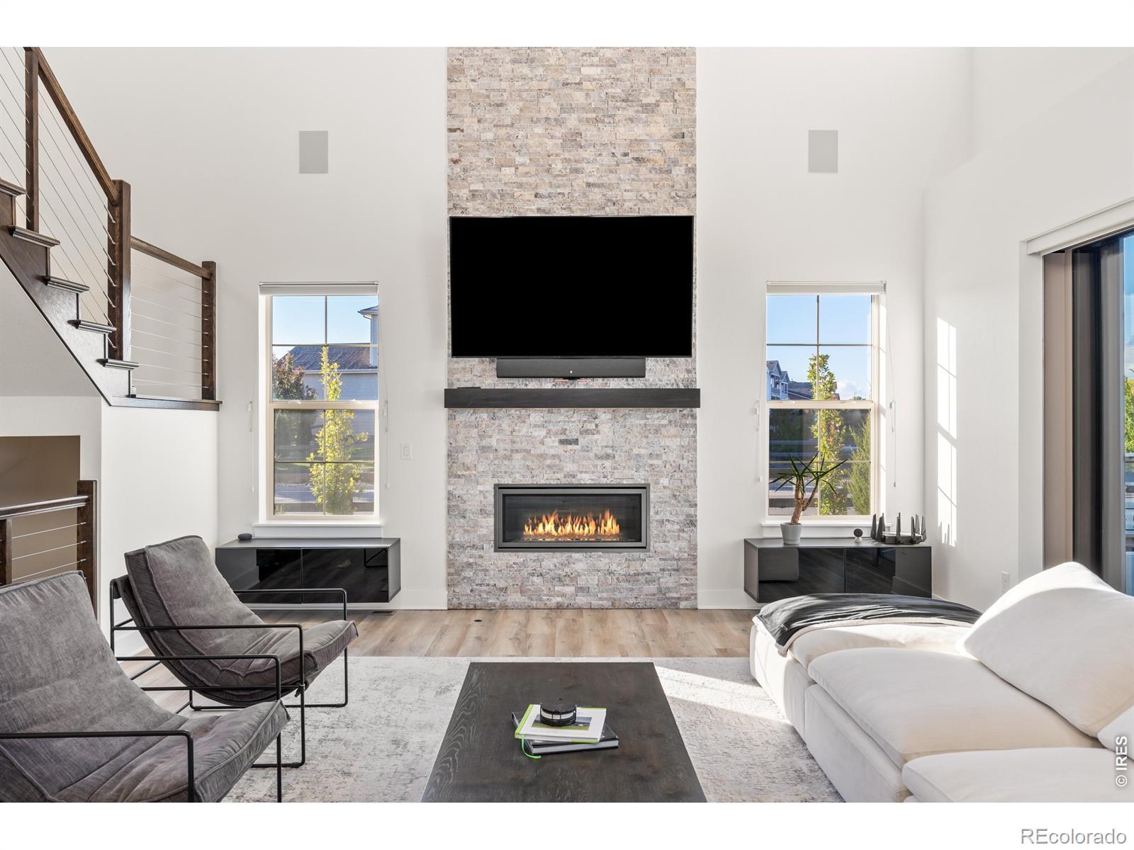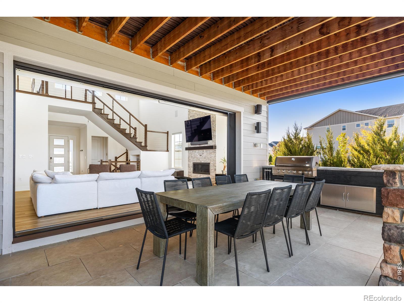 Turnkey luxury living awaits in this sun-drenched, newer-construction Erie 4BD/3.5BA featuring expansive, upgraded interiors and poolside outdoor space. Inside this 3,954SF home, soaring ceilings and oversized windows create a bright and airy ambiance, while crisp white walls, wide-plank flooring and a soaring staircase bordered by metal-and-wire handrails underscore the contemporary aesthetic. The double-height living room features a gas fireplace, floating built-ins and double exposures. Chefs will love the gourmet open kitchen's top-of-the-line KitchenAid appliance suite, custom cabinetry, breakfast nook, and island dining counter, topped by Restoration Hardware pendants. A walk-in pantry adds storage, while a butler's pantry with a wine refrigerator leads to the formal dining room. Off the kitchen, a secondary suite is perfect for guests. A home office, powder room and mudroom complete the well-planned main level. From the living room, oversized sliders tempt you outdoors. Enjoy barbecues on the covered patio flanked by a summer kitchen, or warm yourself near the built-in gas fire pit. Ahead, the heated saltwater pool is surrounded by a sun deck, manicured landscaping and unimpeded mountain views. Head to the upper level to discover a large family room with views over the living room. The stunning primary suite boasts a king-size bedroom, private deck, two extra-large custom closets and an en suite spa bathroom. Two spacious secondary bedrooms share a Jack-and-Jill bathroom, while a large utility room with a GE washer-dryer makes laundry day a breeze. A 2,070SF unfinished lower level provides room to grow, and an oversized four-car garage adds plenty of off-street parking. Located in Flatiron Meadows, a peaceful enclave featuring foothills views, walking/biking paths, parks and easy access to Erie and Louisville amenities and BVSD schools, including nearby Meadowlark School. Discover serene country living just 20 minutes from Boulder and 40 minutes from Denver.