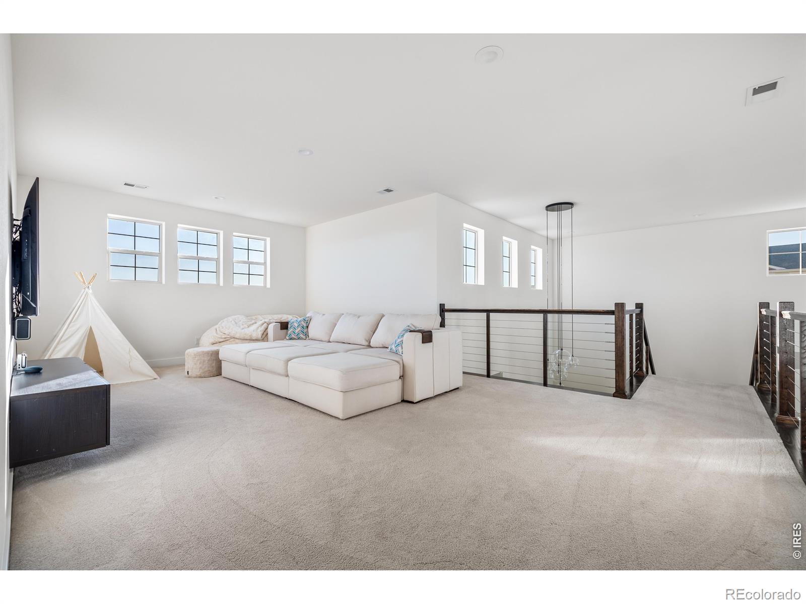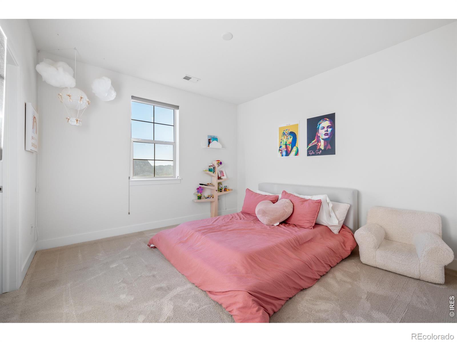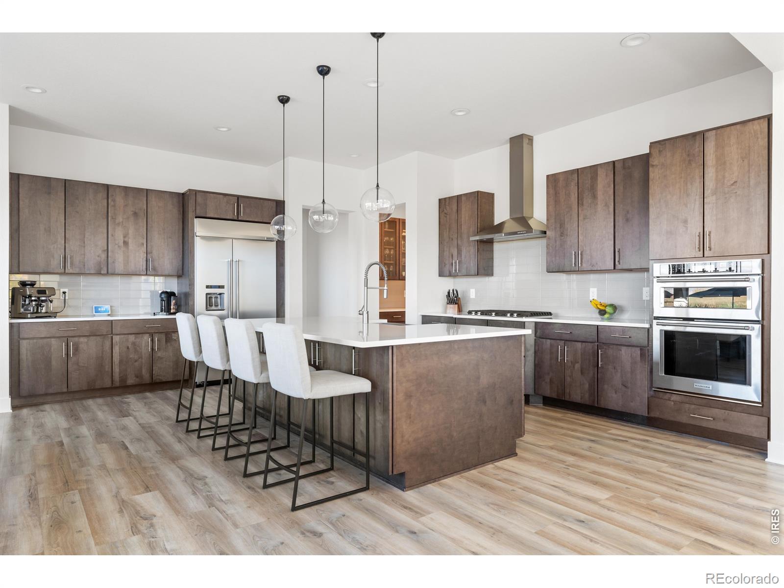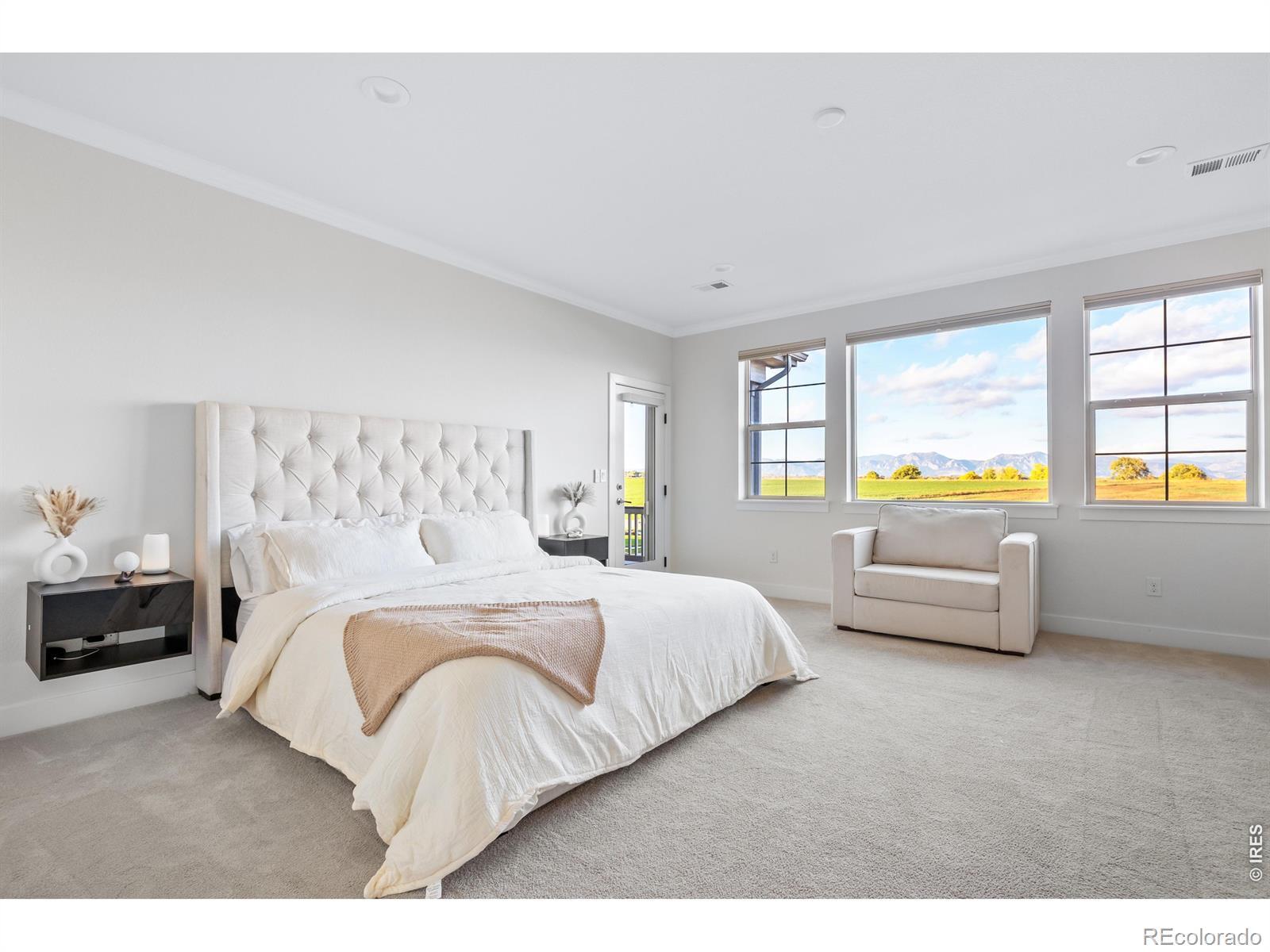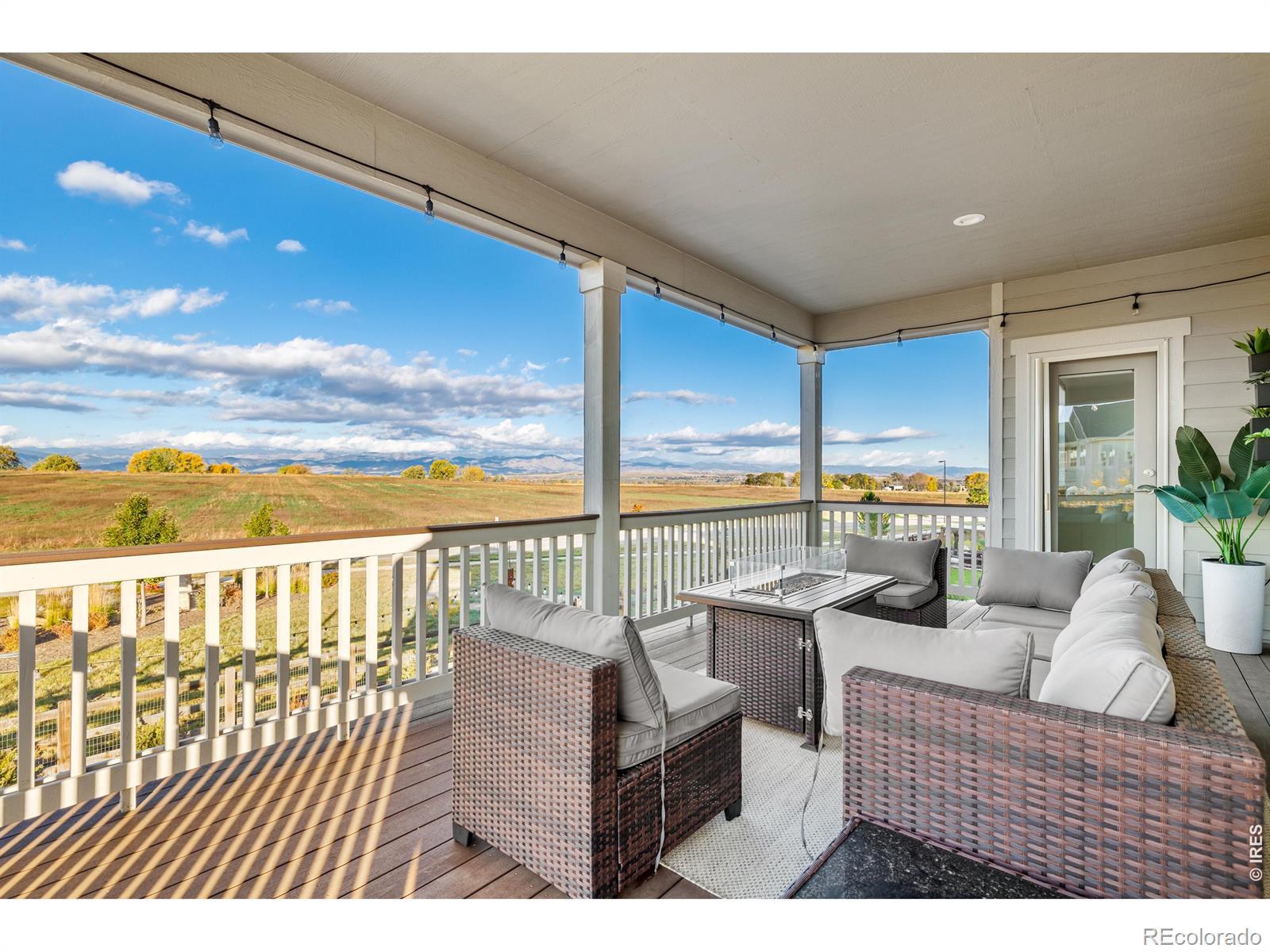 Turnkey luxury living awaits in this sun-drenched, newer-construction Erie 4BD/3.5BA featuring expansive, upgraded interiors and poolside outdoor space. Inside this 3,954SF home, soaring ceilings and oversized windows create a bright and airy ambiance, while crisp white walls, wide-plank flooring and a soaring staircase bordered by metal-and-wire handrails underscore the contemporary aesthetic. The double-height living room features a gas fireplace, floating built-ins and double exposures. Chefs will love the gourmet open kitchen's top-of-the-line KitchenAid appliance suite, custom cabinetry, breakfast nook, and island dining counter, topped by Restoration Hardware pendants. A walk-in pantry adds storage, while a butler's pantry with a wine refrigerator leads to the formal dining room. Off the kitchen, a secondary suite is perfect for guests. A home office, powder room and mudroom complete the well-planned main level. From the living room, oversized sliders tempt you outdoors. Enjoy barbecues on the covered patio flanked by a summer kitchen, or warm yourself near the built-in gas fire pit. Ahead, the heated saltwater pool is surrounded by a sun deck, manicured landscaping and unimpeded mountain views. Head to the upper level to discover a large family room with views over the living room. The stunning primary suite boasts a king-size bedroom, private deck, two extra-large custom closets and an en suite spa bathroom. Two spacious secondary bedrooms share a Jack-and-Jill bathroom, while a large utility room with a GE washer-dryer makes laundry day a breeze. A 2,070SF unfinished lower level provides room to grow, and an oversized four-car garage adds plenty of off-street parking. Located in Flatiron Meadows, a peaceful enclave featuring foothills views, walking/biking paths, parks and easy access to Erie and Louisville amenities and BVSD schools, including nearby Meadowlark School. Discover serene country living just 20 minutes from Boulder and 40 minutes from Denver.